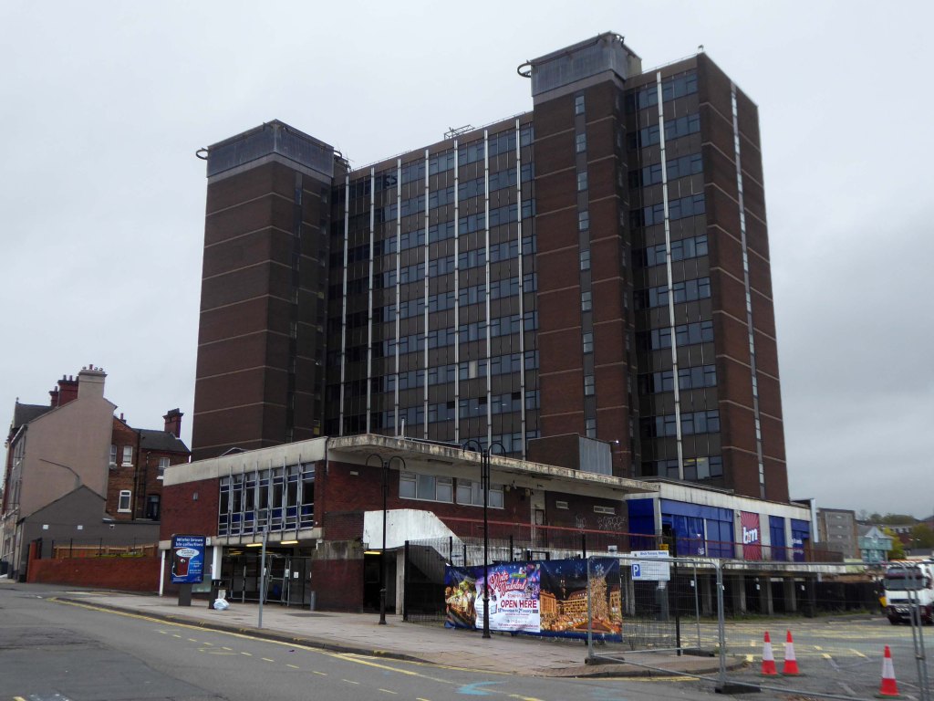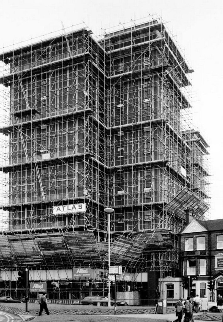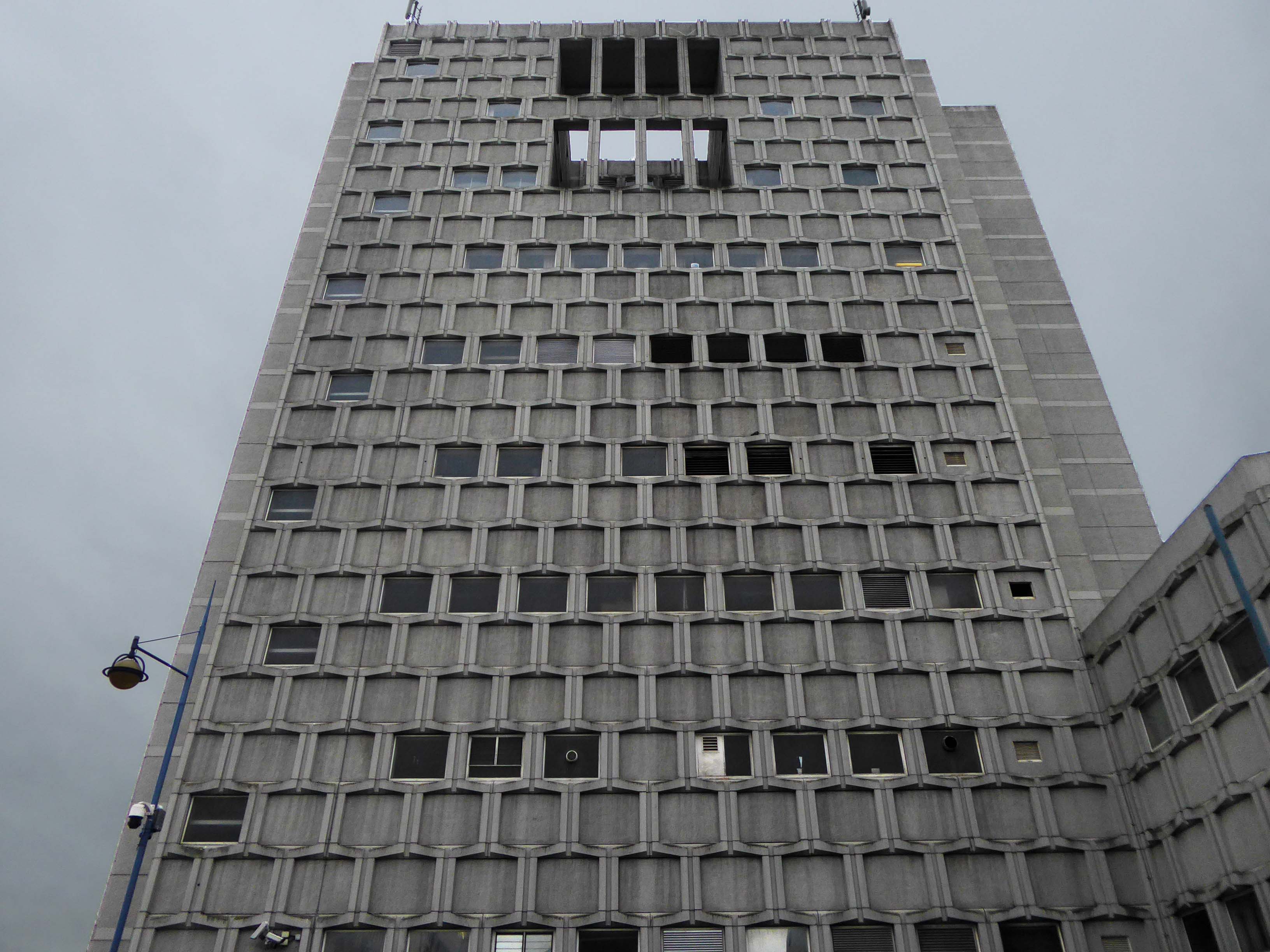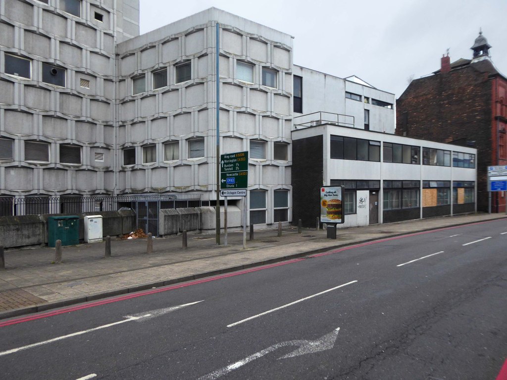 To the left the Manchester Civil Justice Centre 2007 by Denton Corker Marshall.