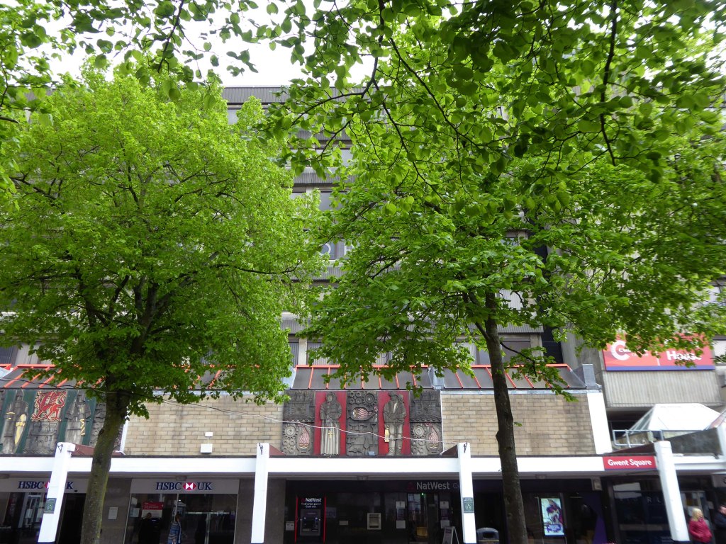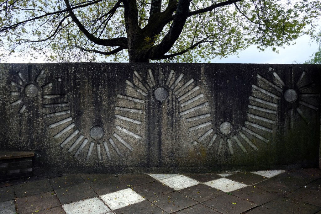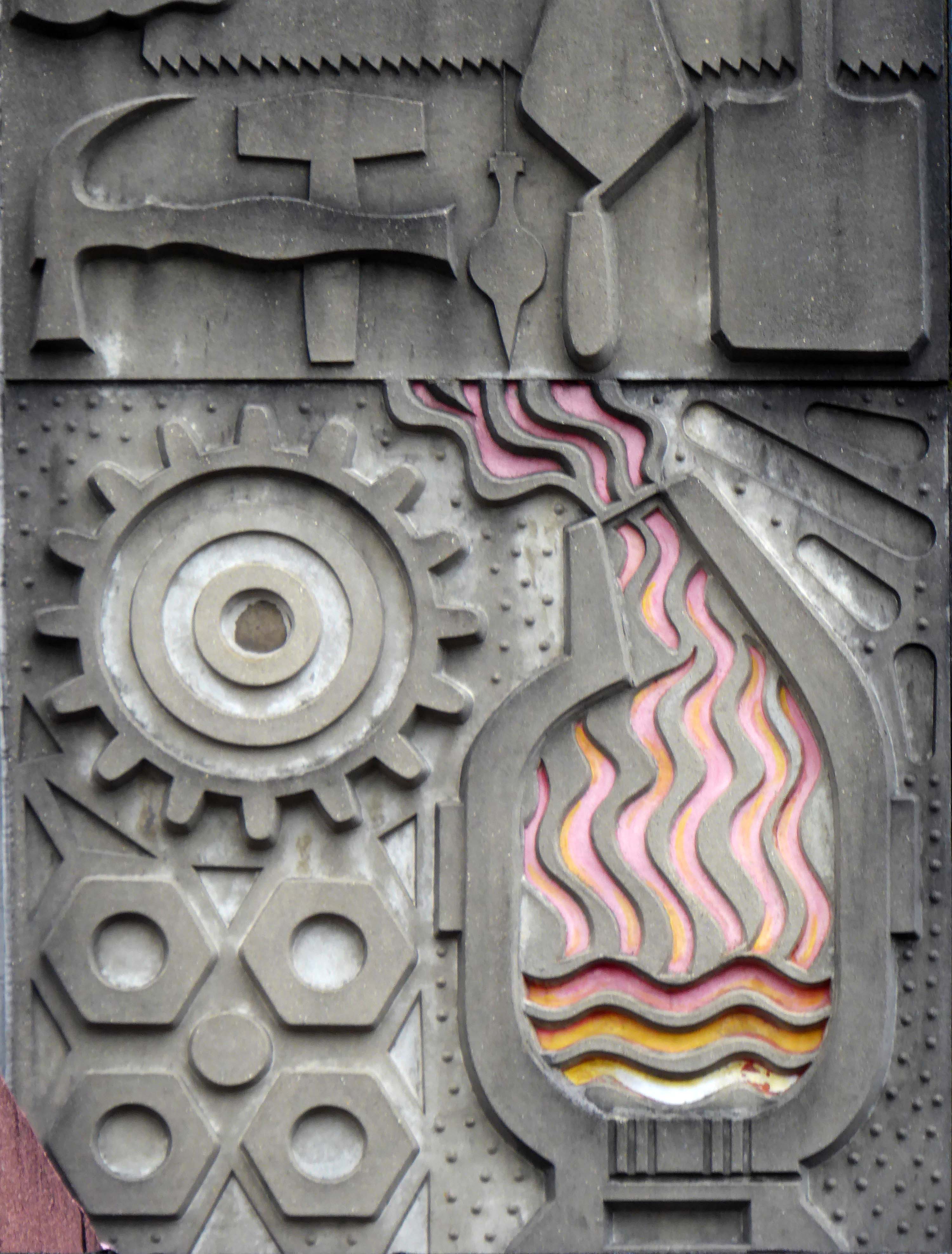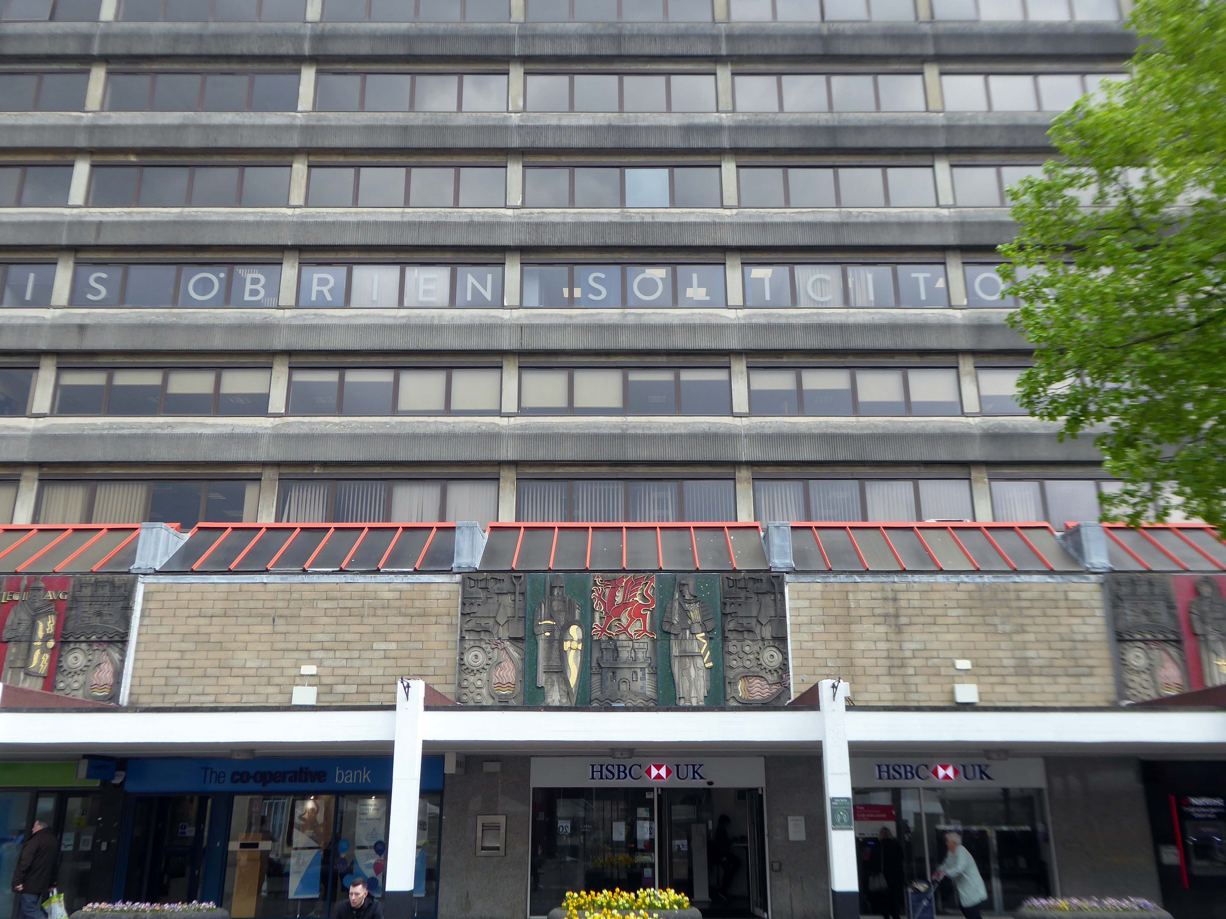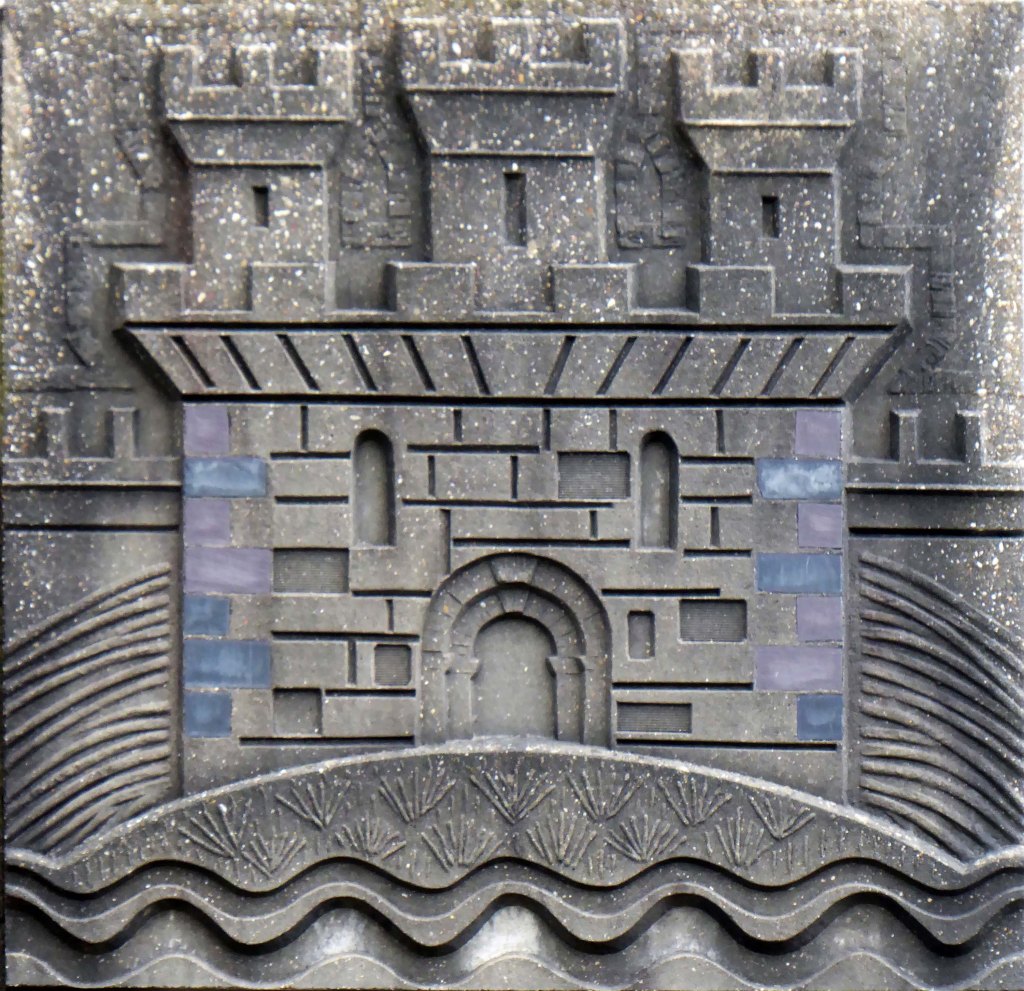 The brick reliefs illustrating the town’s history are by Fred Evans of Dunstable, who completed the work in one week during May 1972 using a high powered sandblasting blaster.
