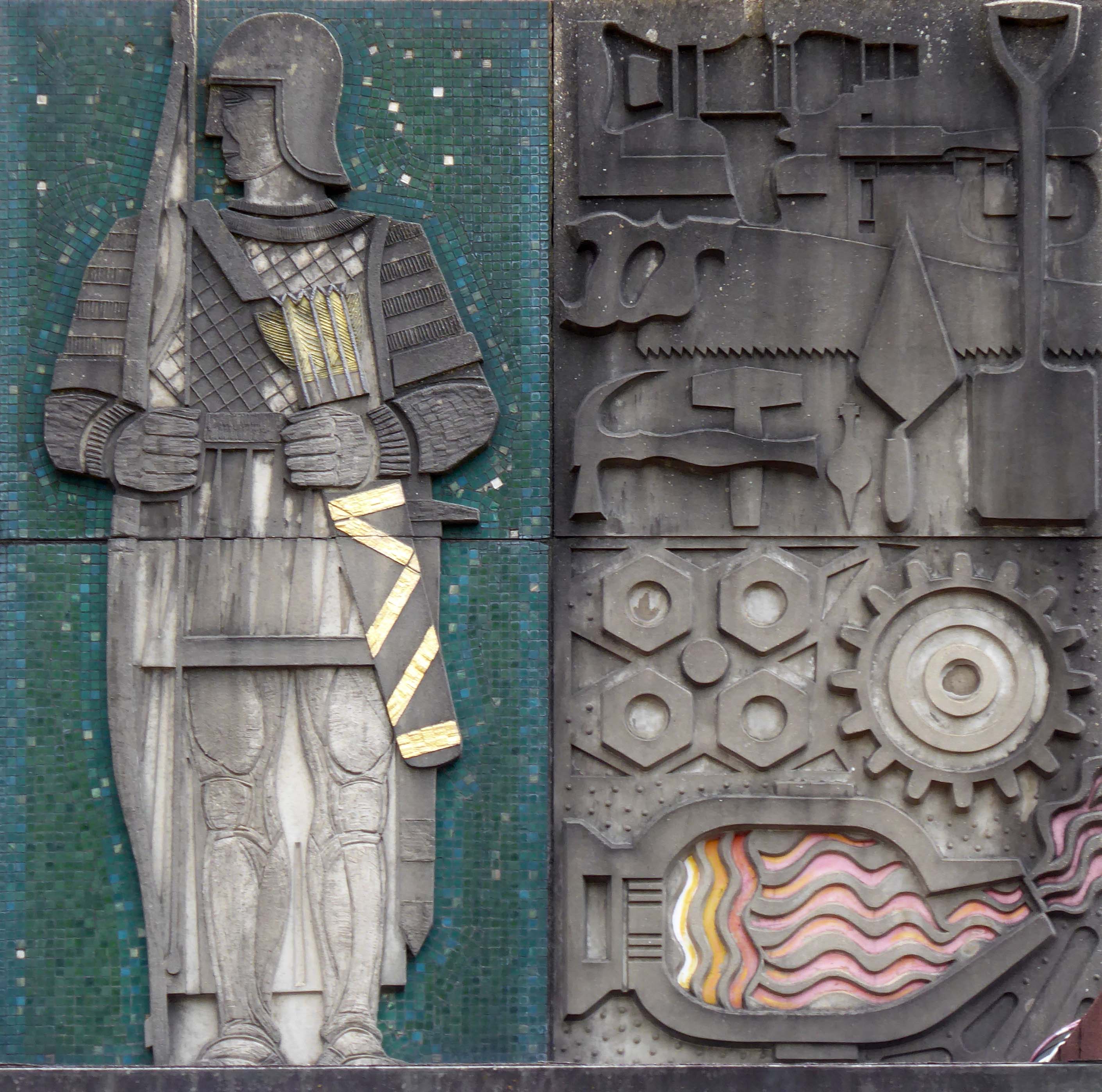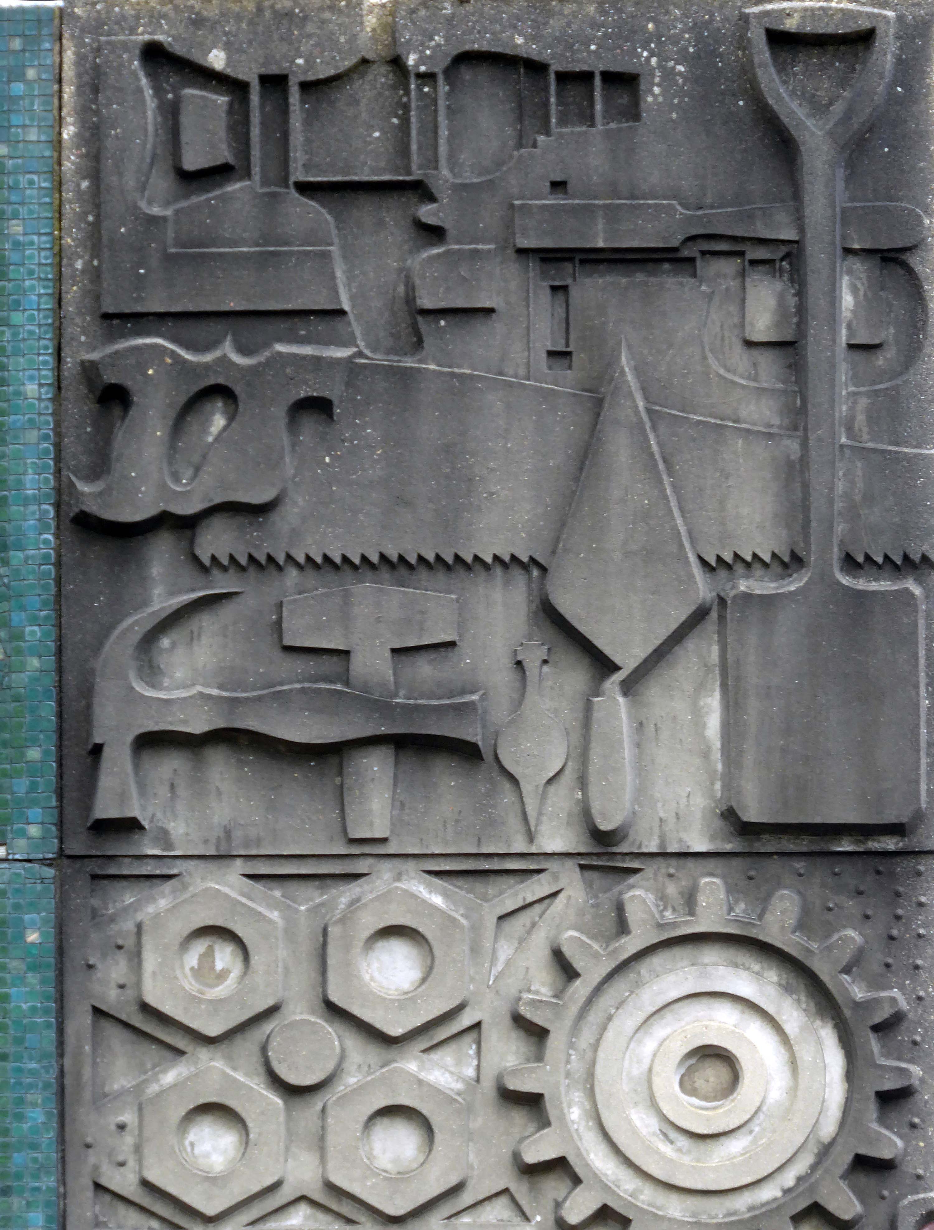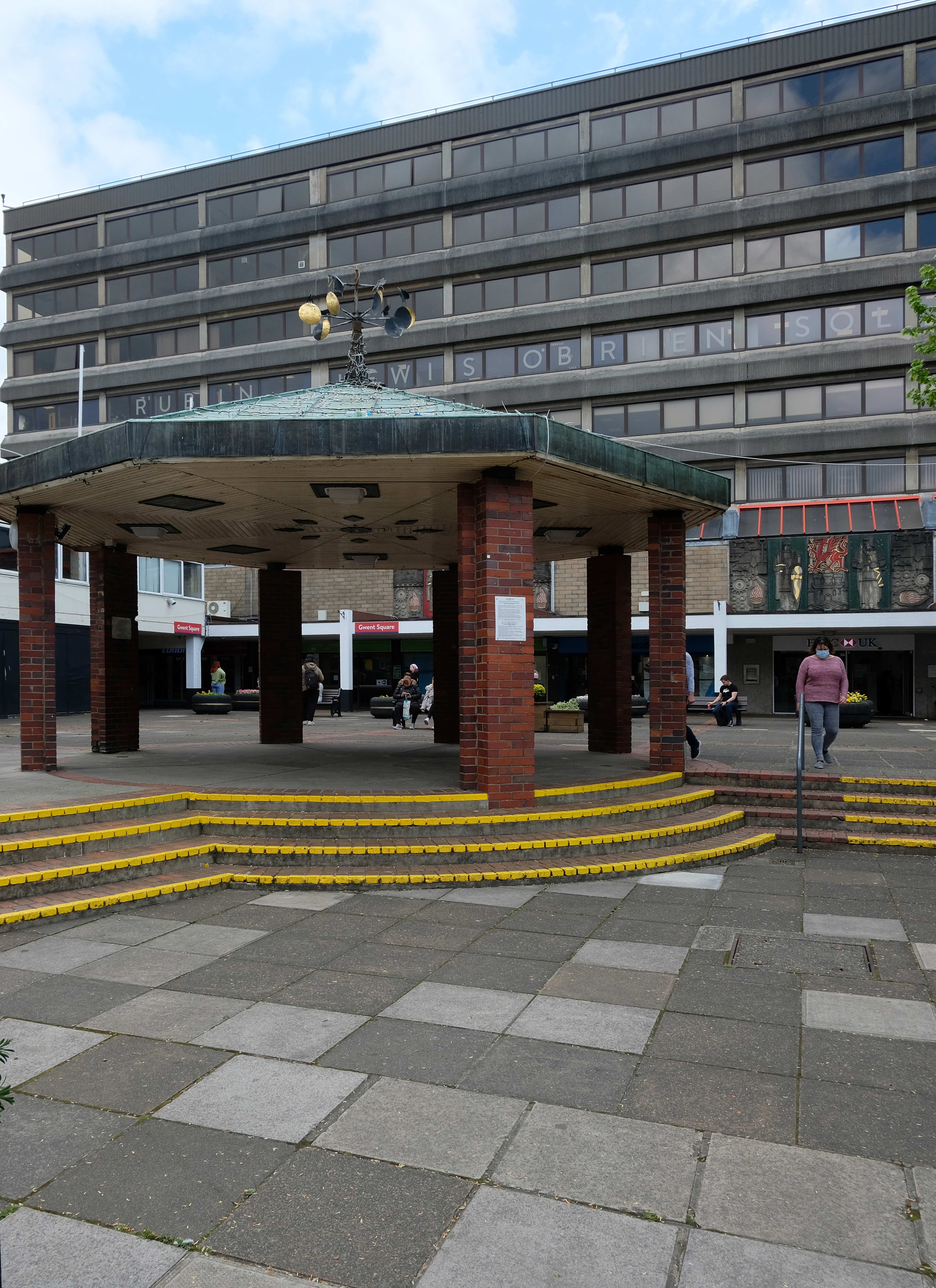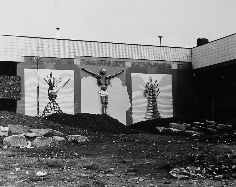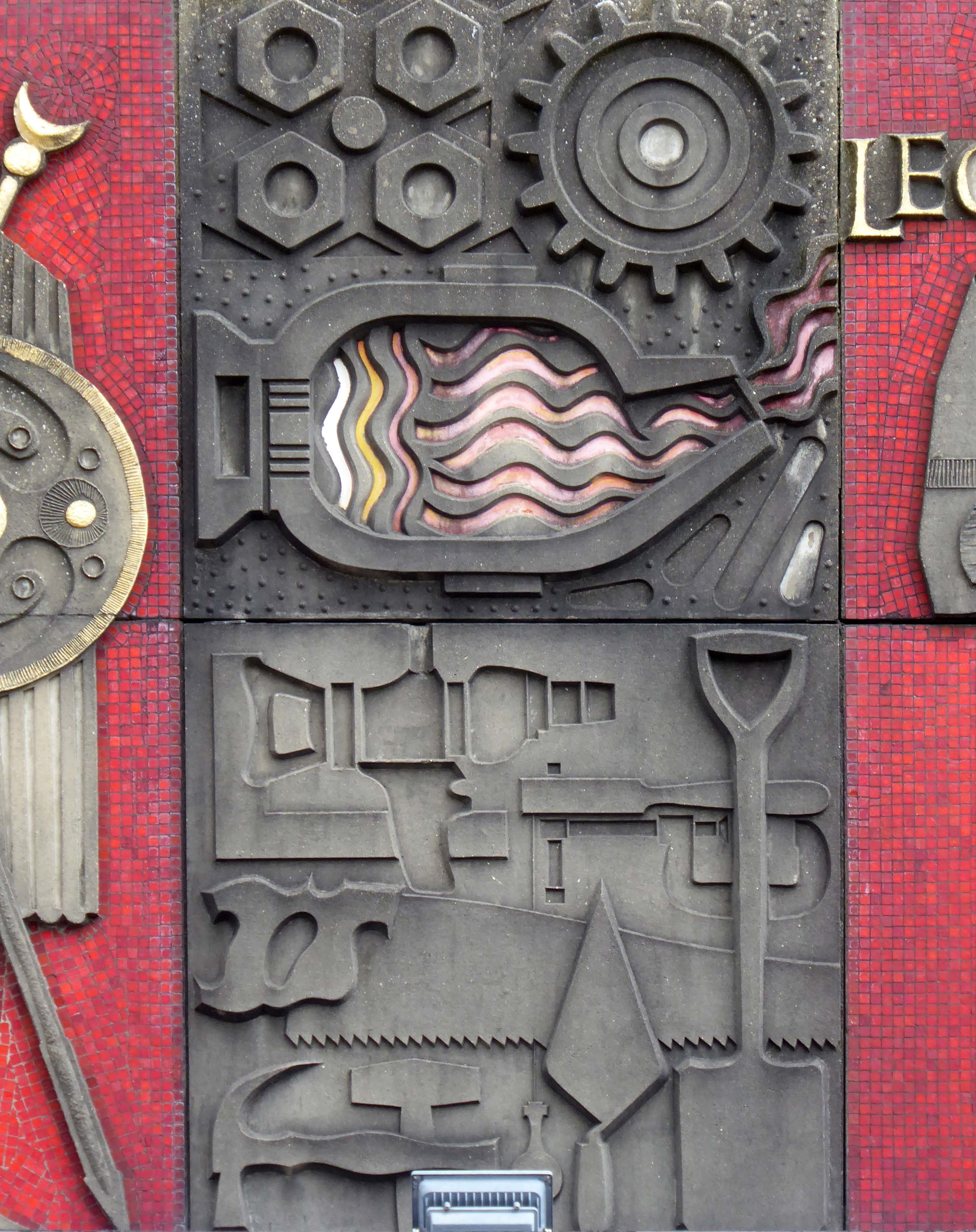 The brick reliefs illustrating the town’s history are by Fred Evans of Dunstable, who completed the work in one week during May 1972 using a high powered sandblasting blaster.