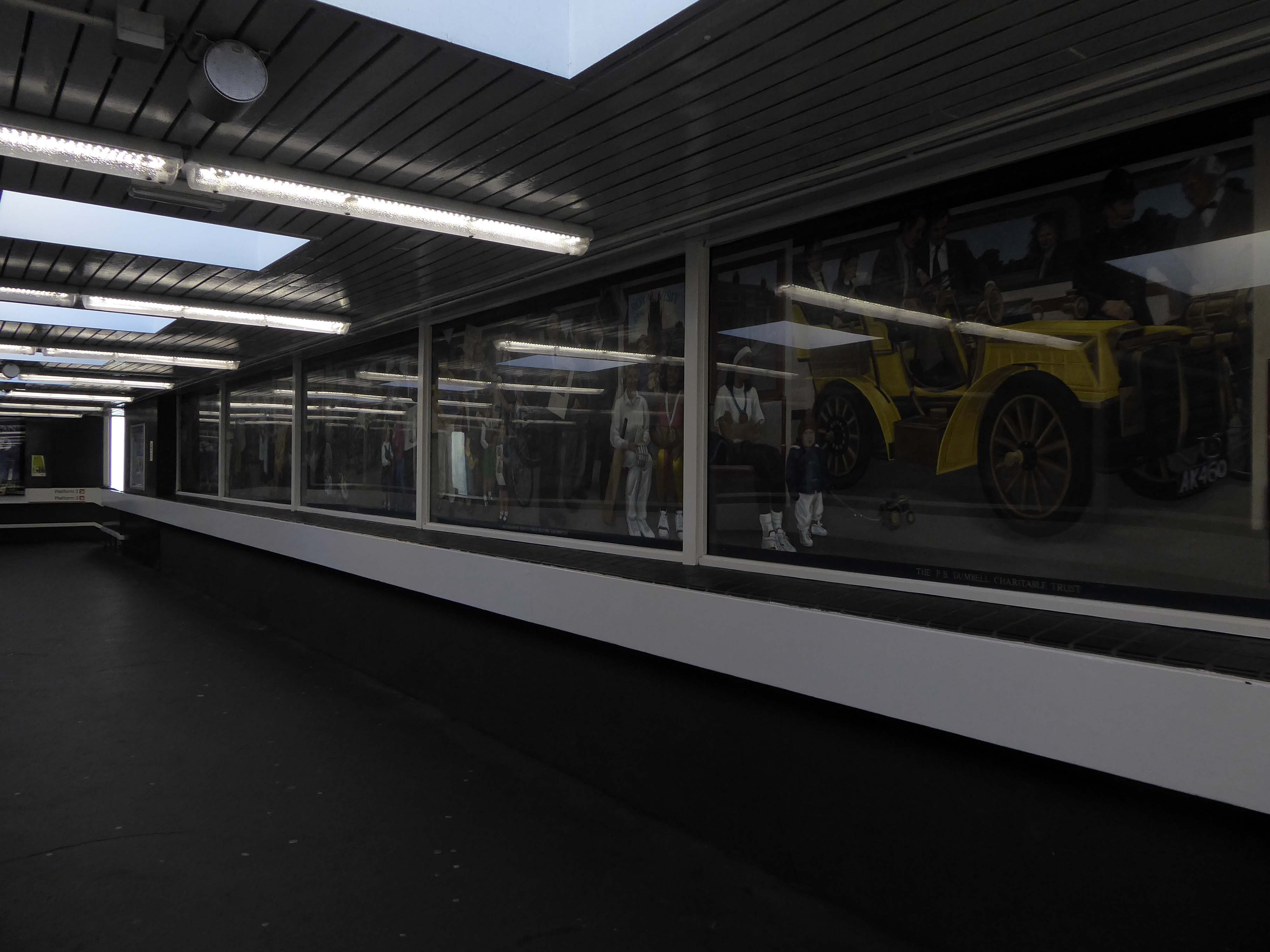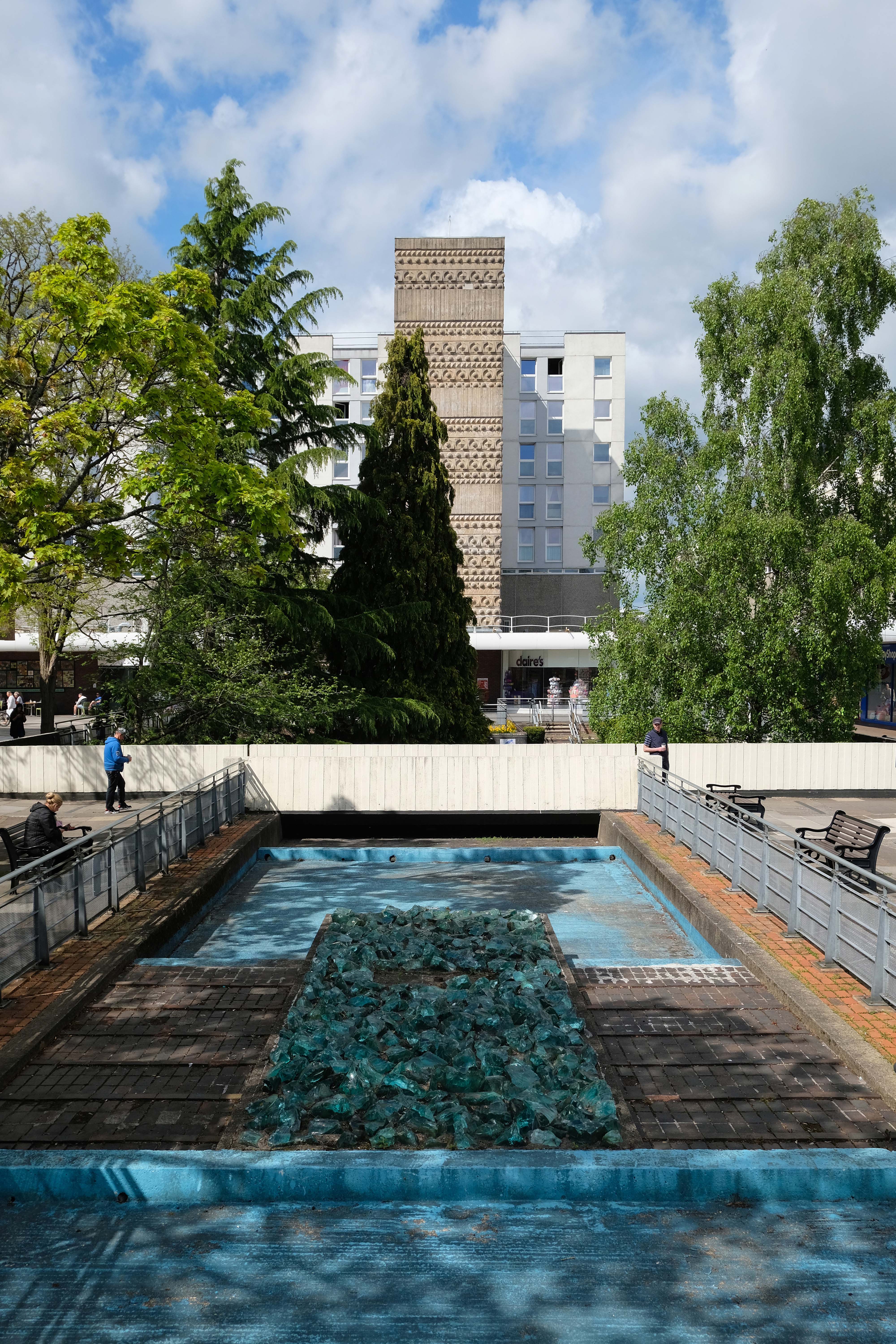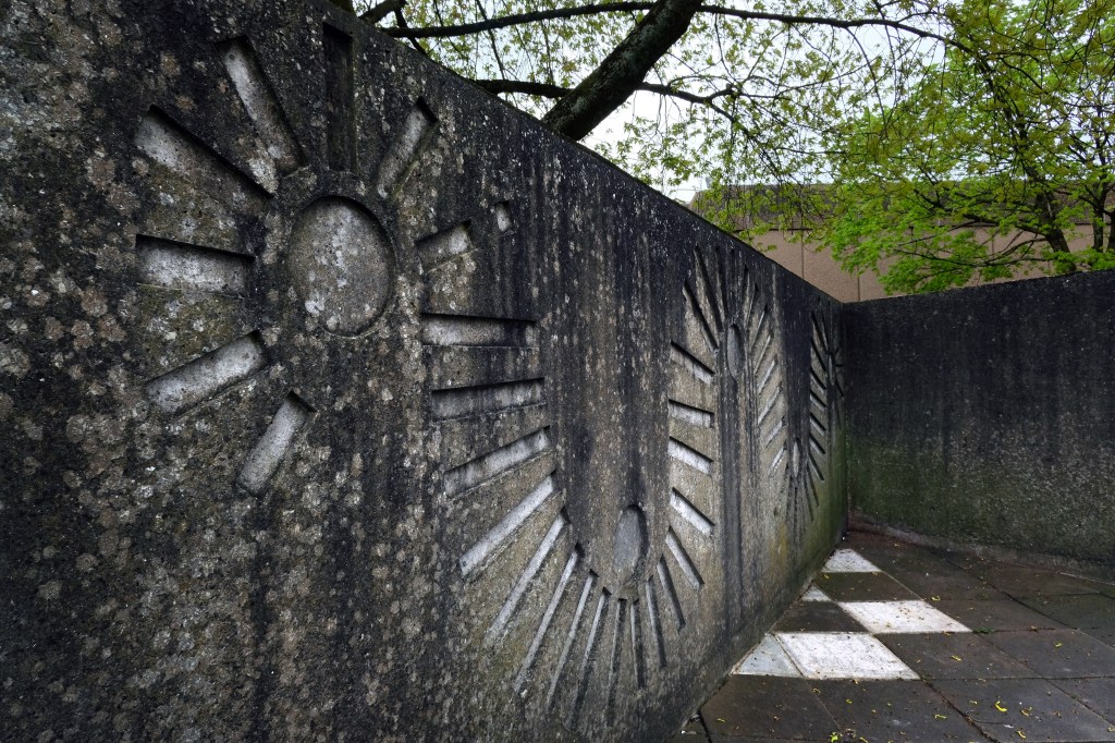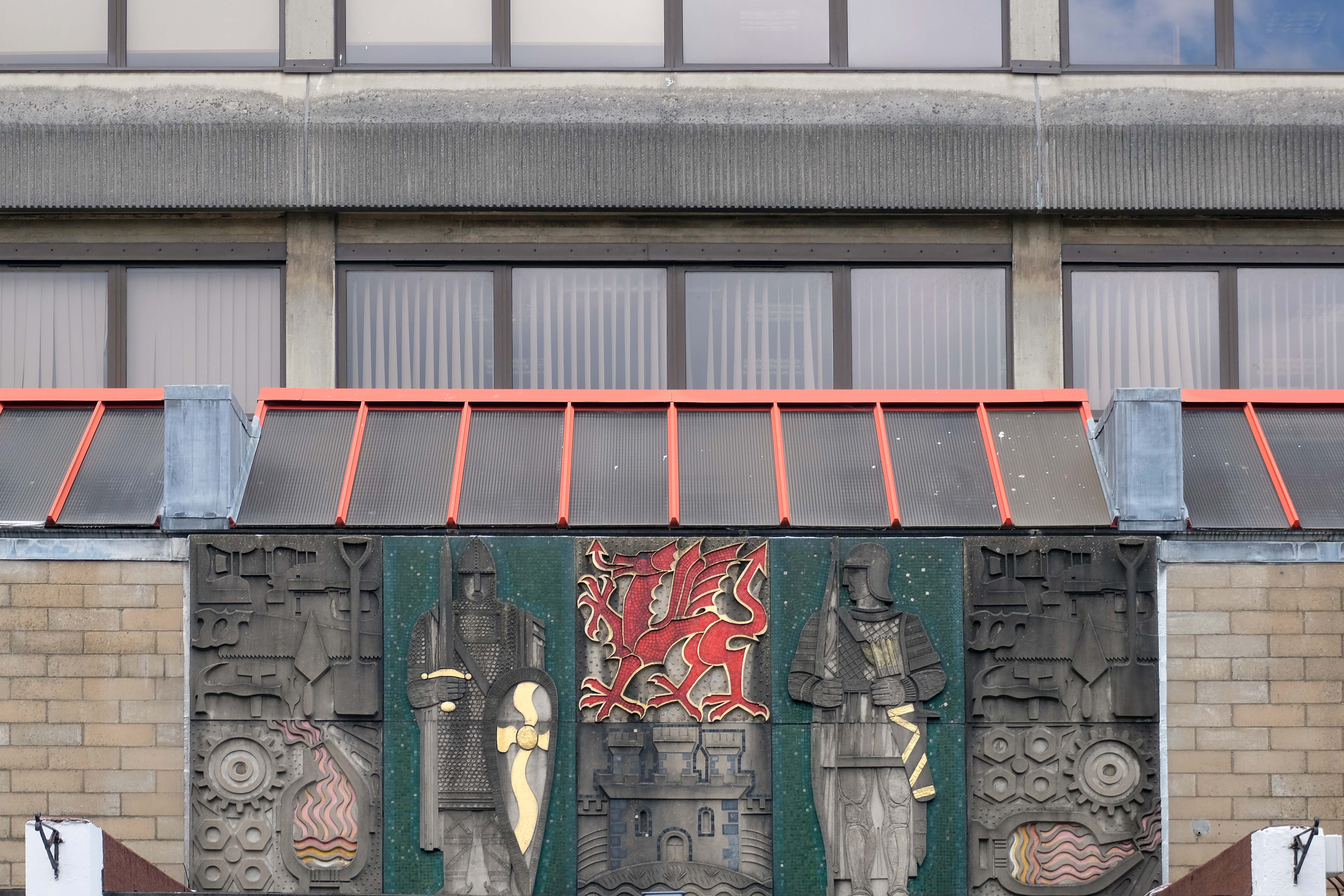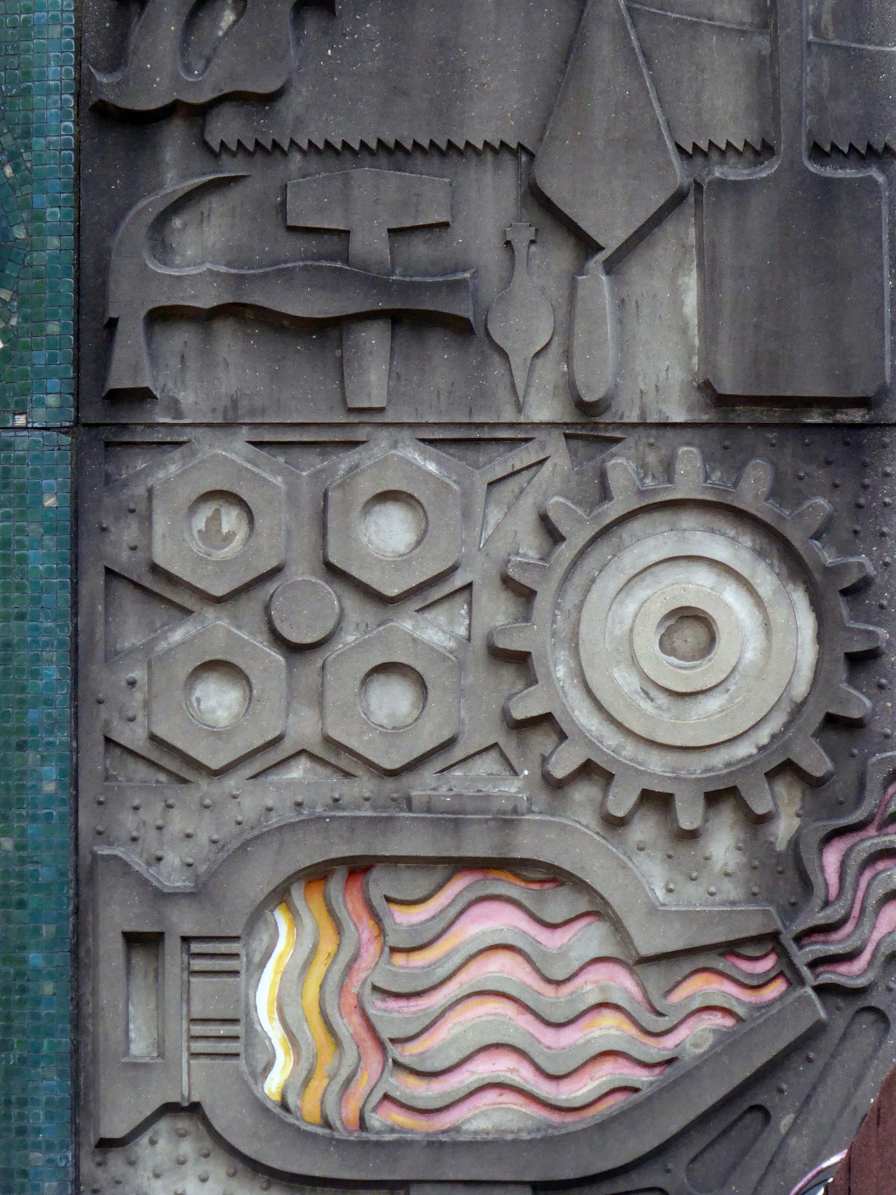 The brick reliefs illustrating the town’s history are by Fred Evans of Dunstable, who completed the work in one week during May 1972 using a high powered sandblasting blaster.