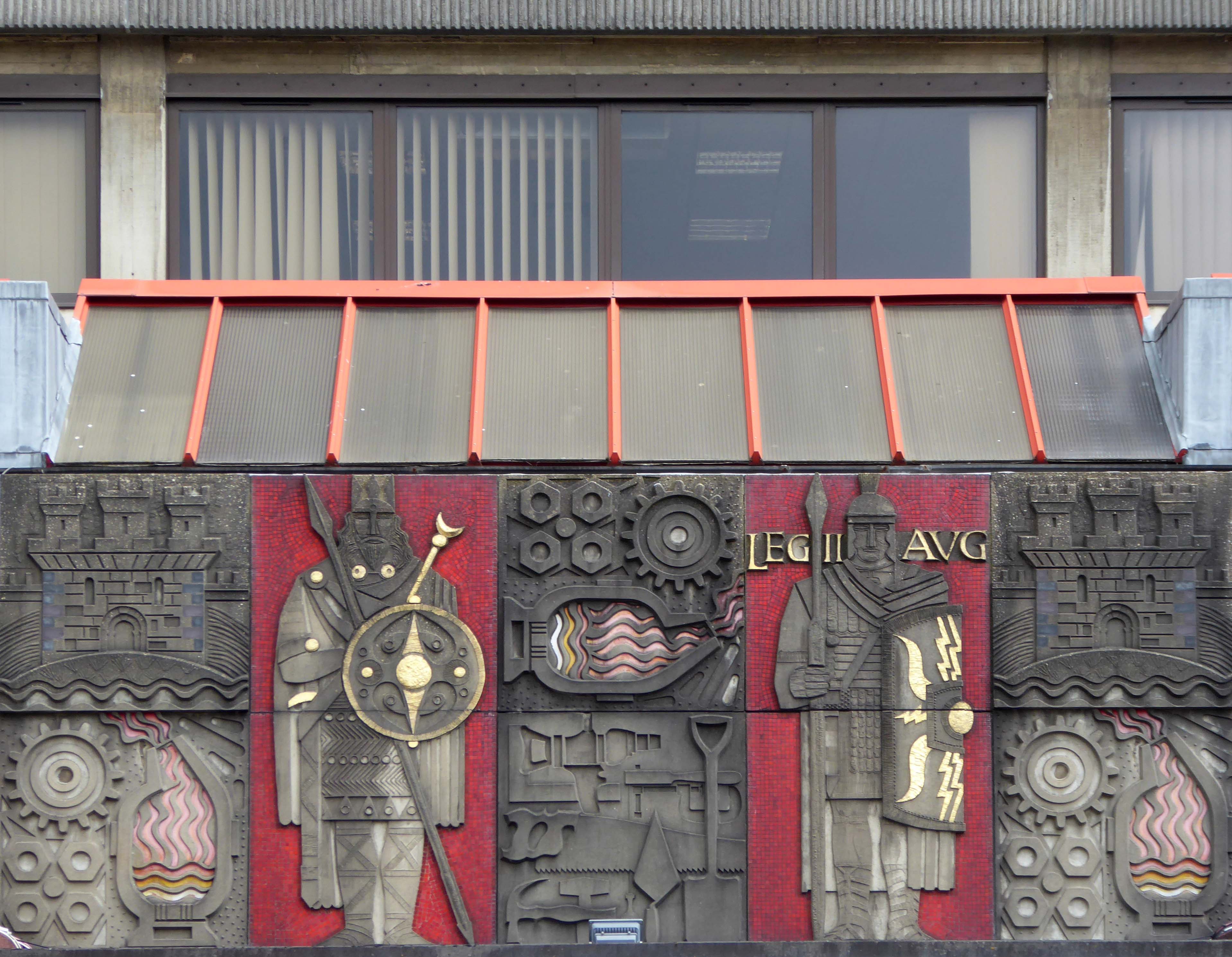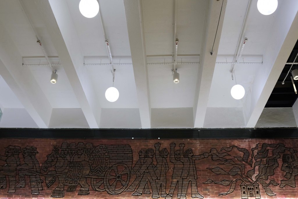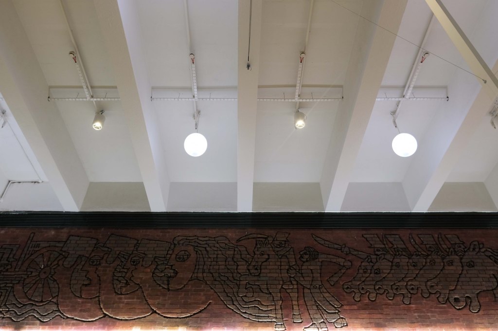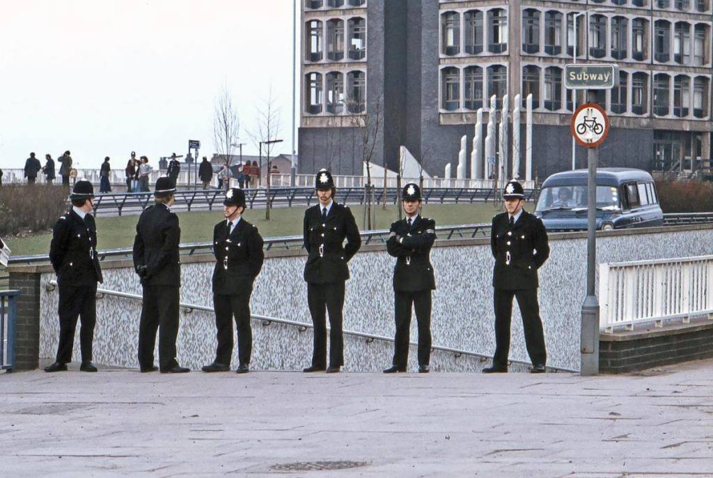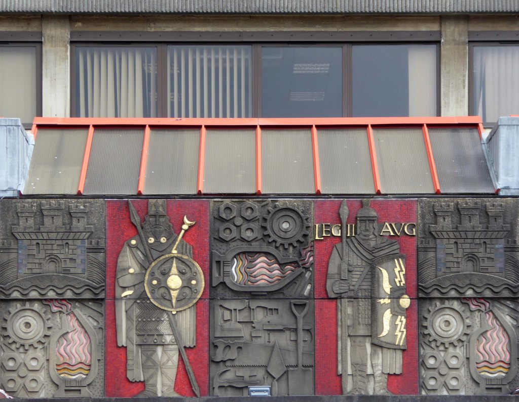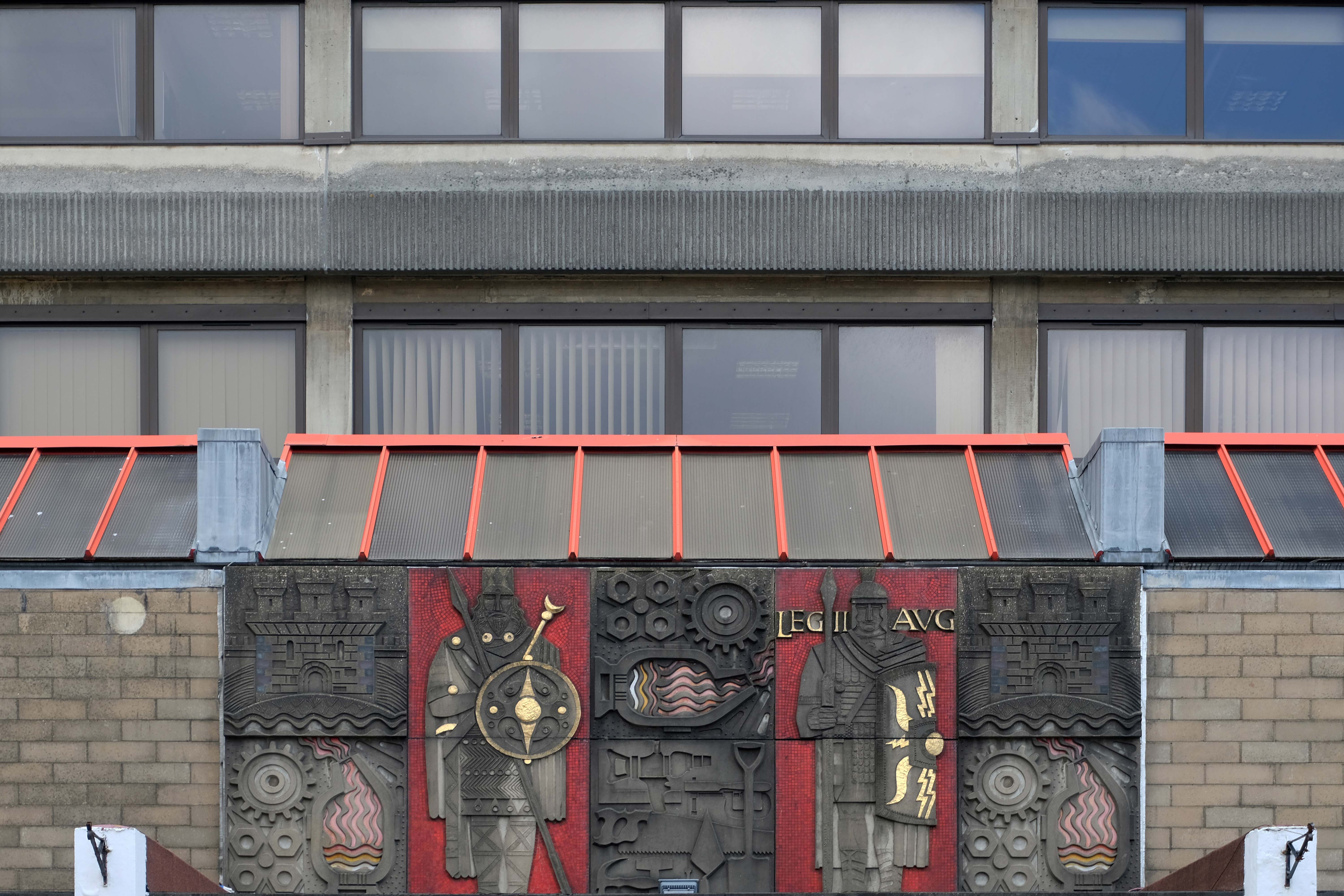 The brick reliefs illustrating the town’s history are by Fred Evans of Dunstable, who completed the work in one week during May 1972 using a high powered sandblasting blaster.