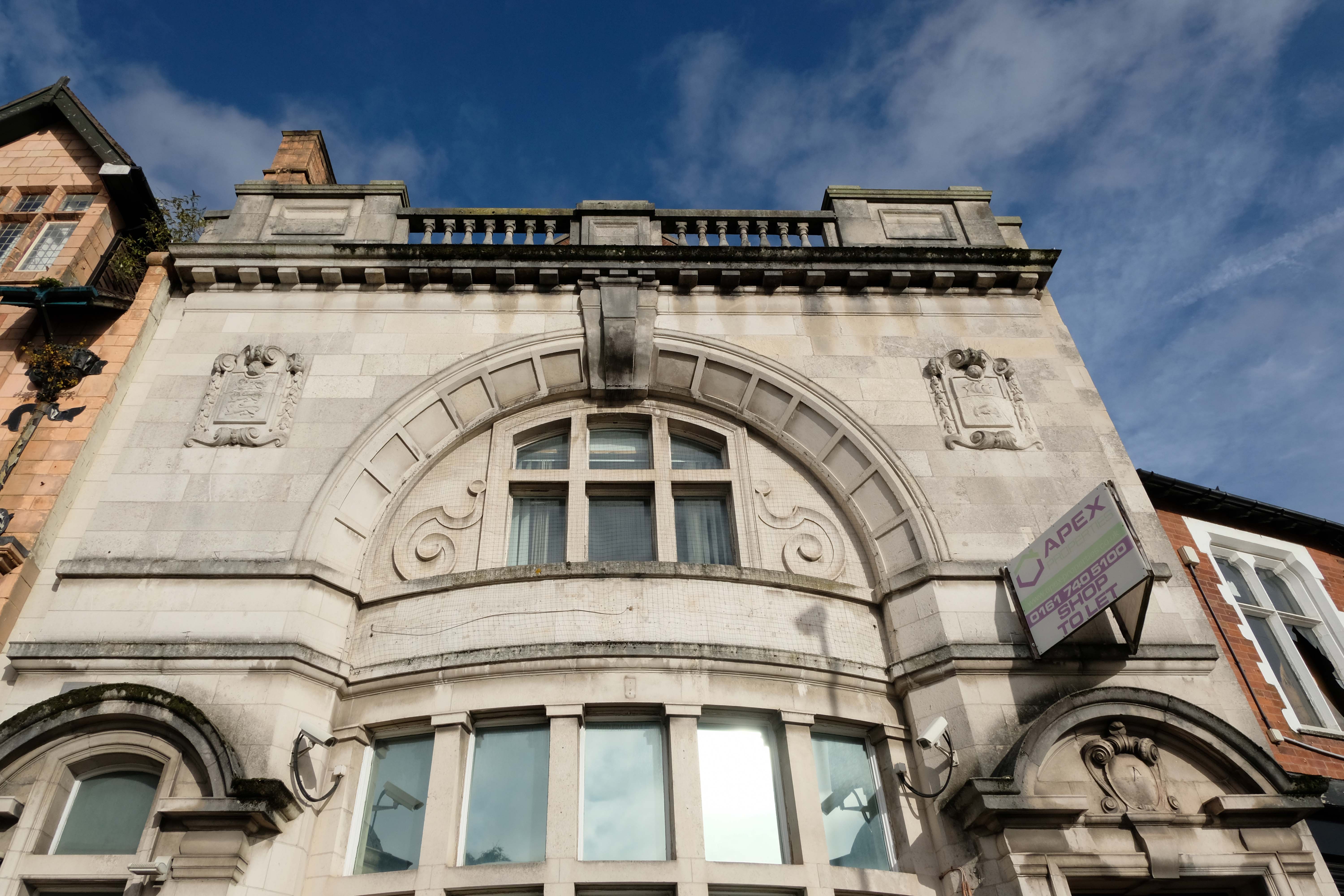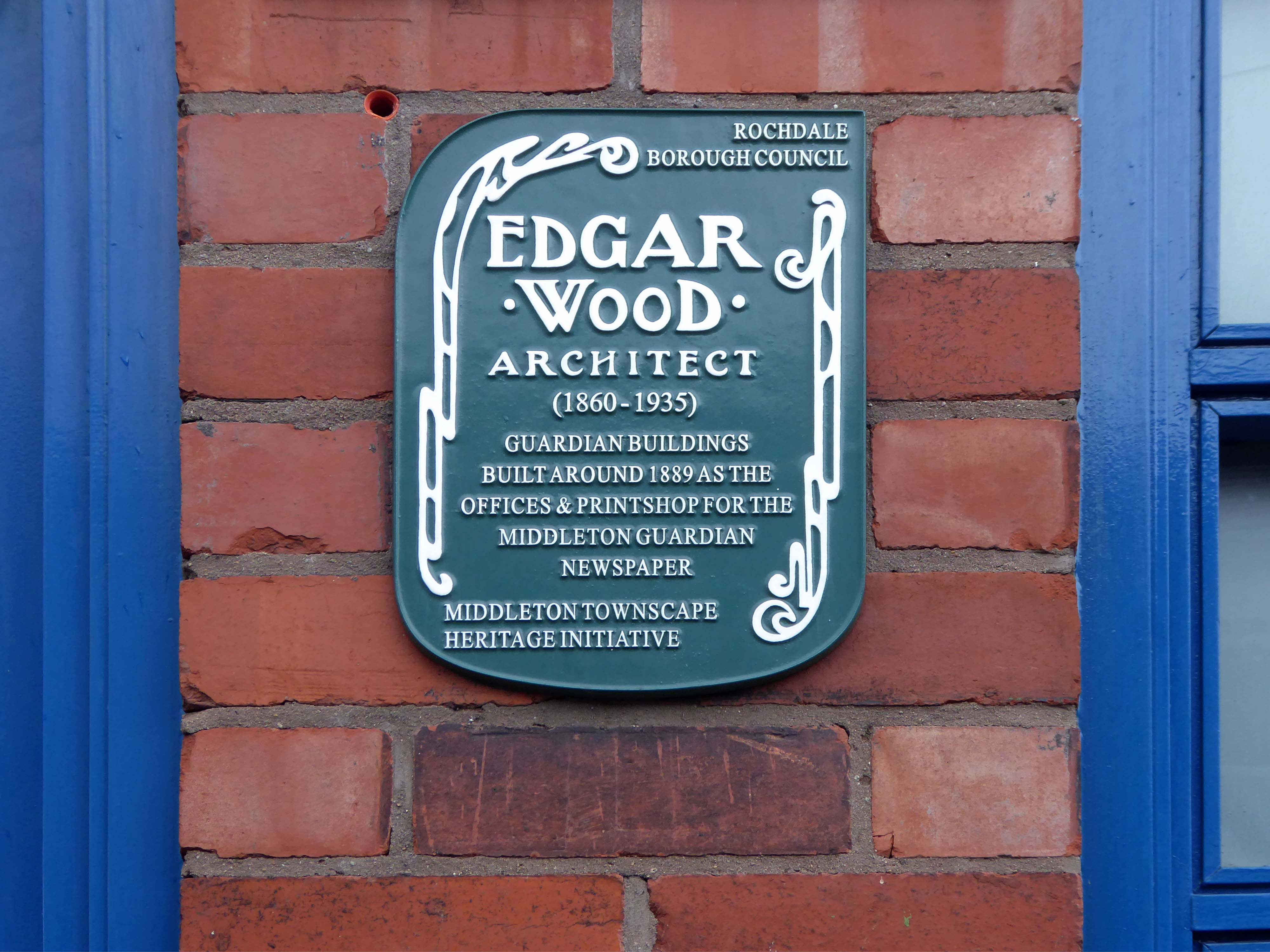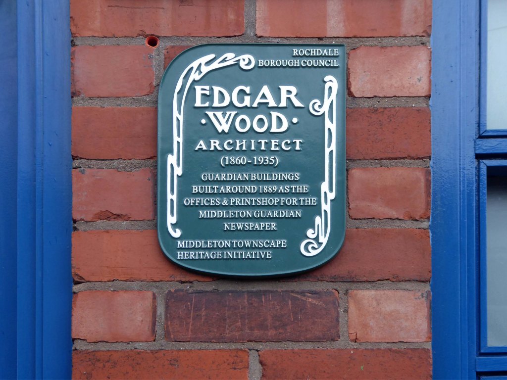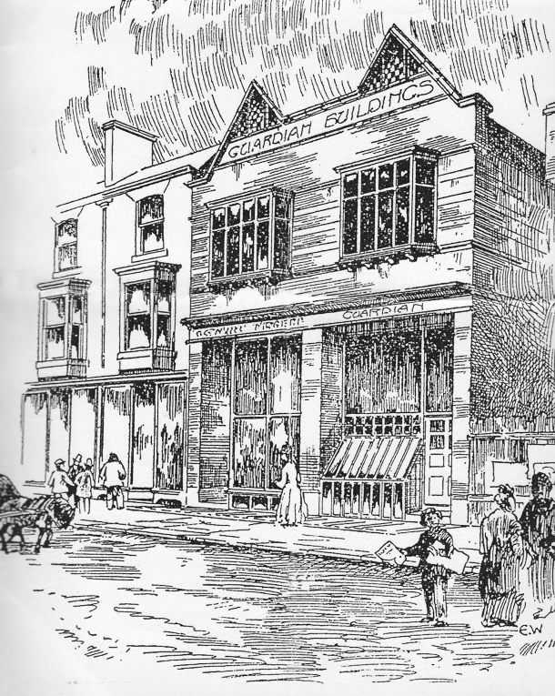 The Guardian Buildings, were commissioned by Fred Bagot, the proprietor of the Middleton Guardian newspaper and a man with a reputation at the time for keeping a tight control of finances. In consequence, Guardian Buildings were one of Edgar Wood’s low budget buildings, of which there are several in and around Middleton. The building housed the operations of the newspaper with the cellar containing the printing machines and the tall ground floor housing a shop, office and more machines. The whole of the first floor, with its pair of oriel windows, was taken up by the composing room.