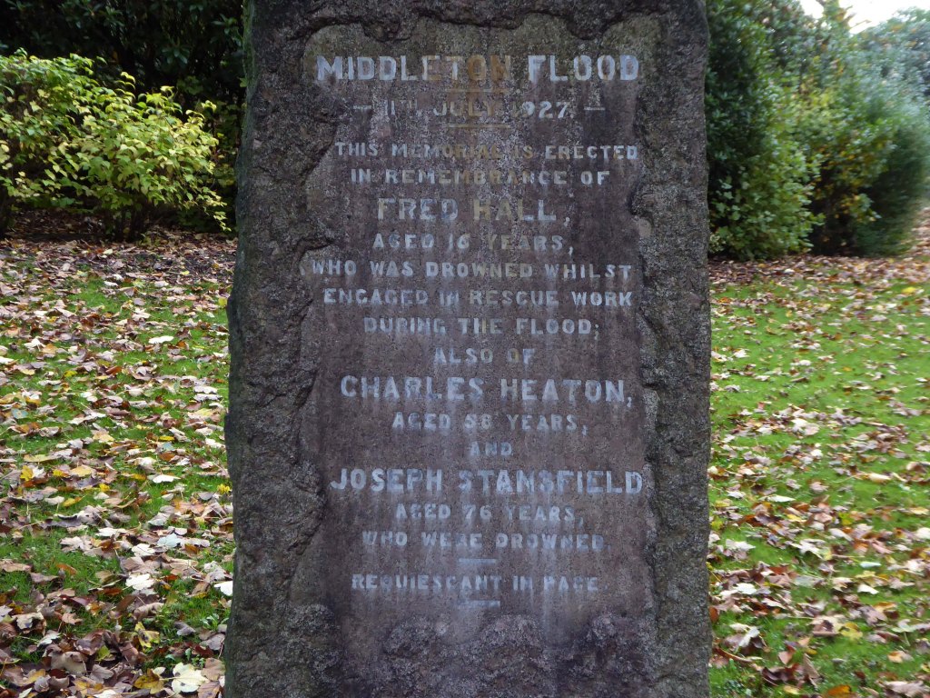 Nearby we find a memorial to the Middleton Flood – following torrential rain, the canal embankment at Mills Hill broke, flooding the already swollen River Irk, subsequently deluging the town.