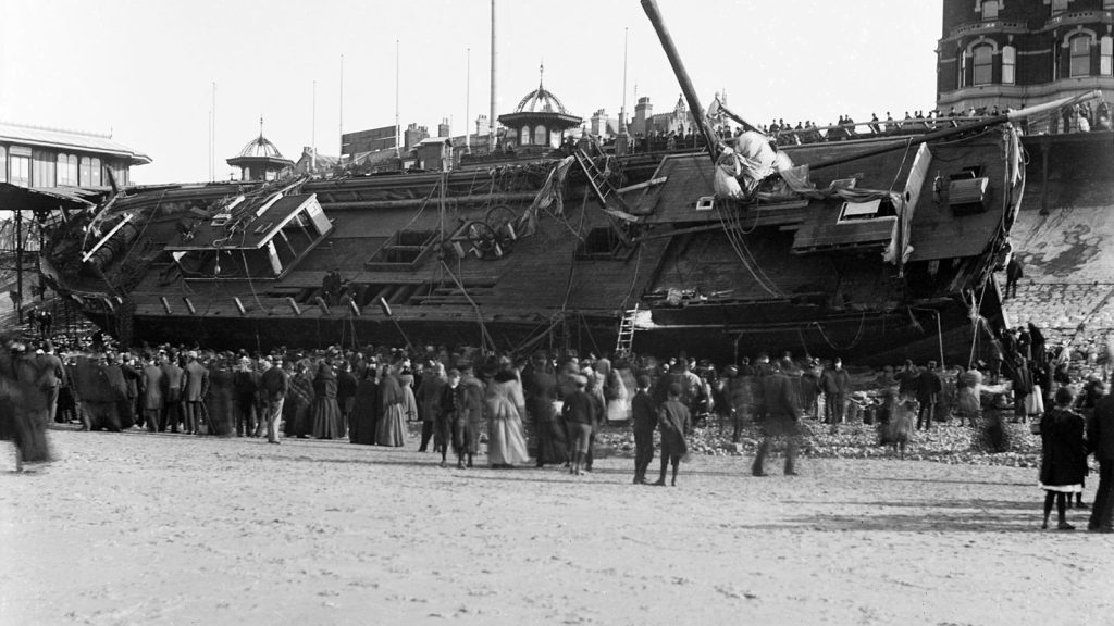Thousands of people lined the Promenade to witness the spectacle as she came in on the south side of the pier; many more stood on the pier itself, but there was a mad rush for safety when the ship collided against the structure.