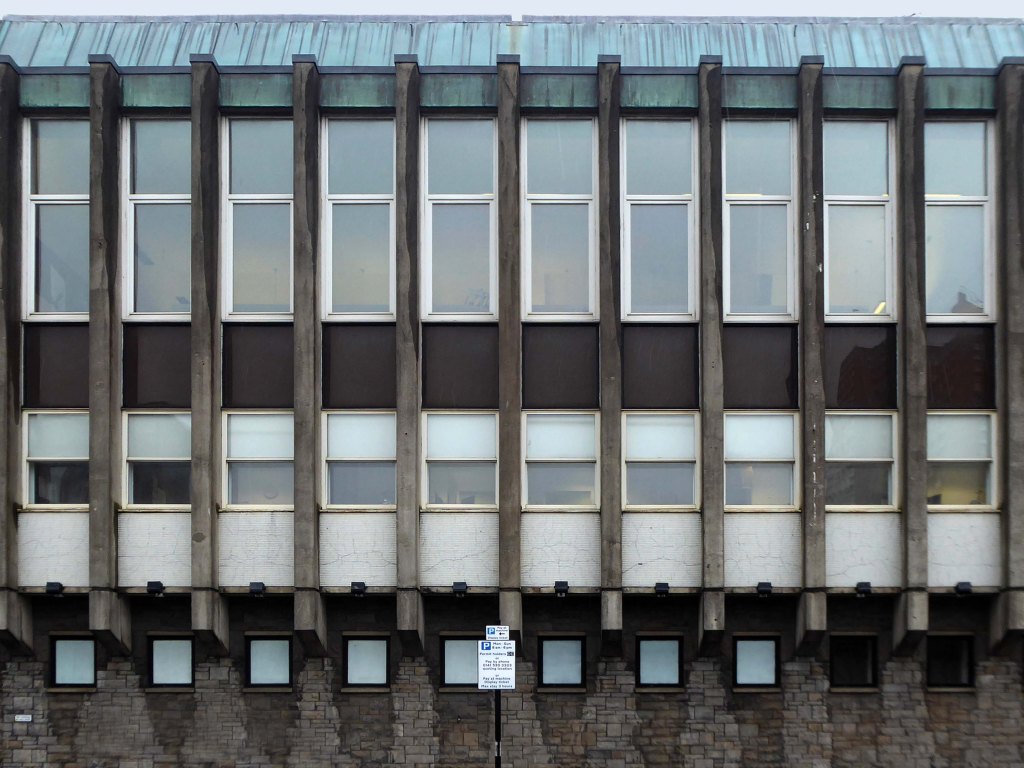 The design team was Roger Booth, Lancashire County Architect; C.A. Spivey, Assistant County Architect; D.B. Stephenson, Design Architect; and D.G. Edwards, A.G. Gass, responsible for the detailed design and construction. The seven-storey in-situ concrete framed main block was the last bespoke police station to be built in Lancashire, following this the department developed a systemised concrete construction method which was deployed across the county. The dramatic cantilevers gave the new building a stature and presence that signalled authority. The lower levels were accessed by ramps and provided space for police vehicles. To enter the police station one ascended a set of external stairs across a pool that once contained koi carp – fittingly, one boy described the new building as a ‘fishtank’ upon its completion. The magistrates’ court was finished externally in a grey brick and carried the signature pyramid rooflights that were synonymous with the Department.