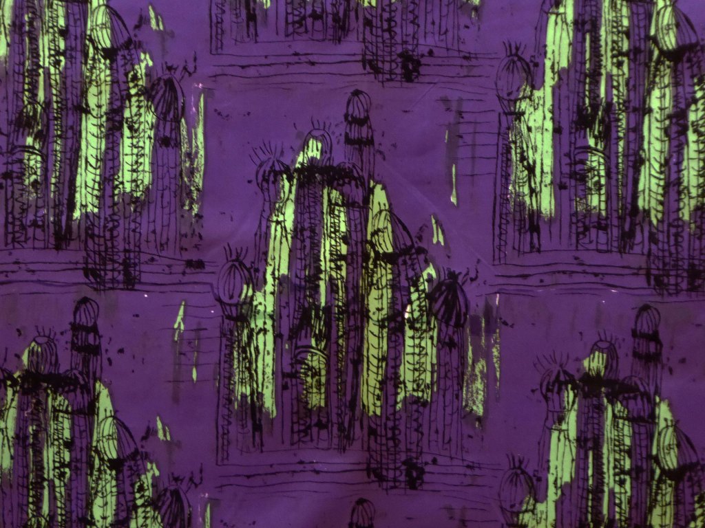 Typically employing the techniques of wax resist and a wandering Indian ink line.