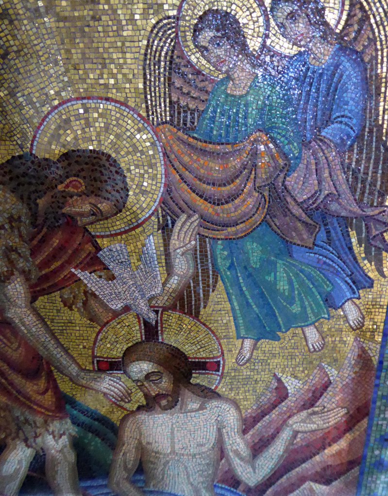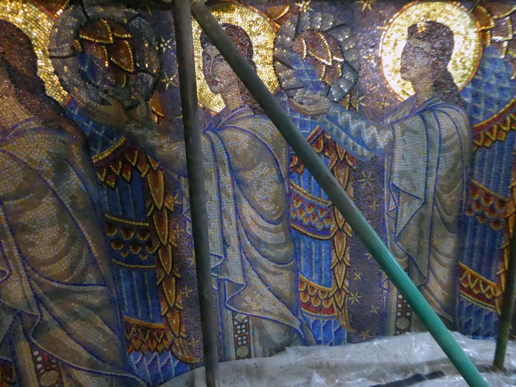 The apsed sanctuary is completely covered in a mosaic scheme with the theme Eternal Life designed by Eric Newton. Newton was born Eric Oppenheimer, later changing his surname by deed poll to his mother’s maiden name. He was the grandson of Ludwig Oppenheimer, a German Jew who was sent to Manchester to improve his English and then married a Scottish girl and converted to Christianity. In 1865 he set up a mosaic workshop, (Ludwig Oppenheimer Ltd, Blackburn St, Old Trafford, Manchester) after spending a year studying the mosaic process in Venice. Newton had joined the family company as a mosaic craftsman in 1914 and he is known to have studied early Byzantine mosaics in Venice, Ravenna and Rome. He later also became art critic for the Manchester Guardian and a broadcaster on ‘The Critics’. Newton started the scheme in 1932 and took over a year to complete it at a cost of £4,000. It had previously been thought that he used Italian craftsmen, but historic photographs from the 1930s published in the Daily Herald show Oppenheimer mosaics being cut and assembled by a Manchester workforce of men and women. It is likely, therefore, that the craftsmen working on St John the Baptist were British.