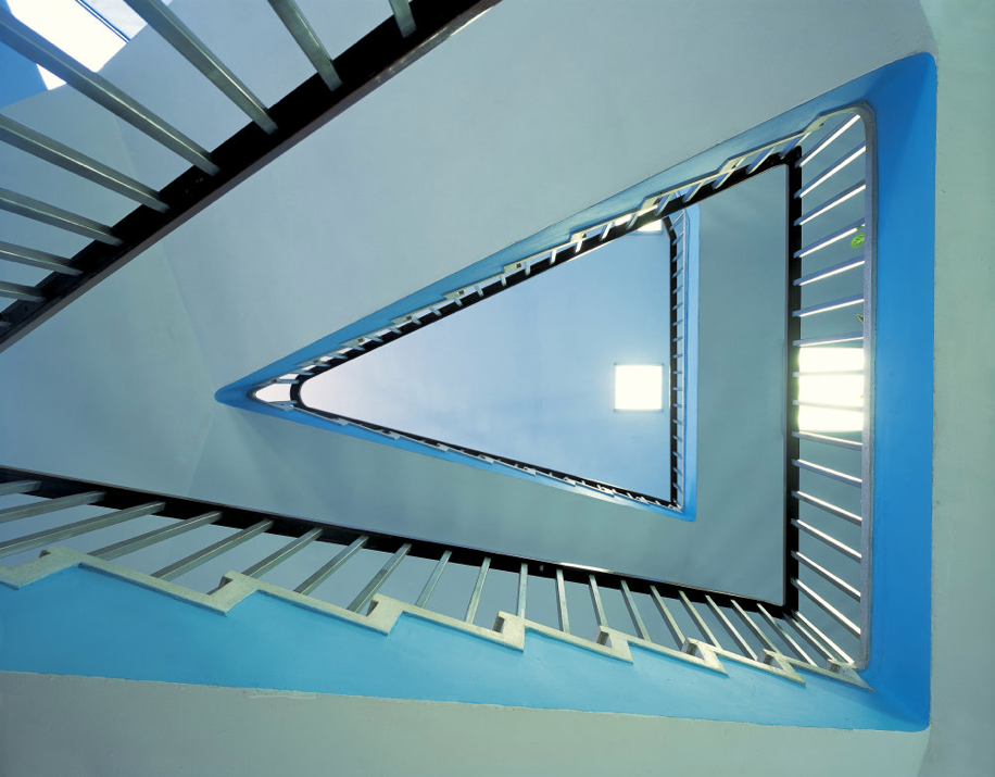By the mid 1960s, Lubetkin was based at his farm in Gloucestershire, Skinner in London and Bailey in Glasgow. Bailey asked Lubetkin to work out the design of the main staircase and parts of the principal elevation, notably the large cross. Lubetkin’s staircases are particularly spectacular and the St Andrew’s one is no exception. Allan notes that the Lubetkin leitmotif was the controlled collision of straight and curved geometry and this would appear to be exemplified here in the triangular plan geometric staircase which ends in a gentle curve at the ground floor. It is possible that Lubetkin may have influenced the vertical timber panelling in the boardroom. While that in the main hall is smooth and varnished, the boardroom has been sandblasted to present a weathered appearance. At Highpoint Two Lubetkin designed the interior and furniture for the penthouse flat with walls of vertical roughened sand-blasted pine panelling.
