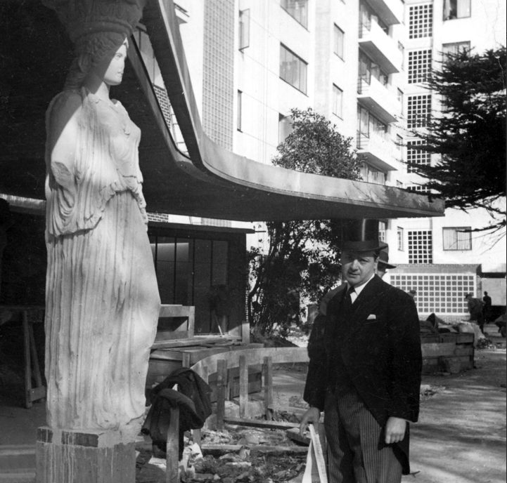 Berthold Lubetkin in top hat beside caryatid at the entrance to Highpoint Two – North Hill Highgate London.