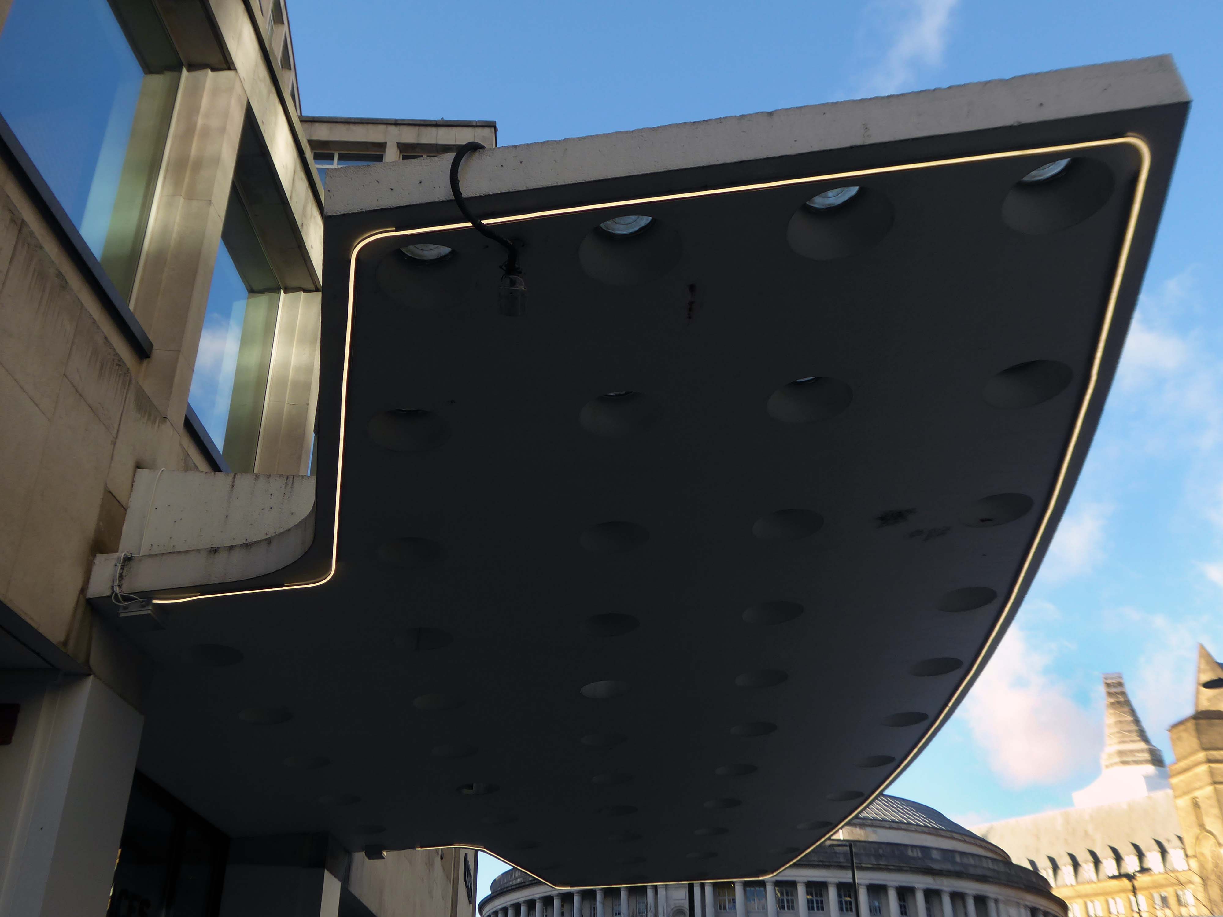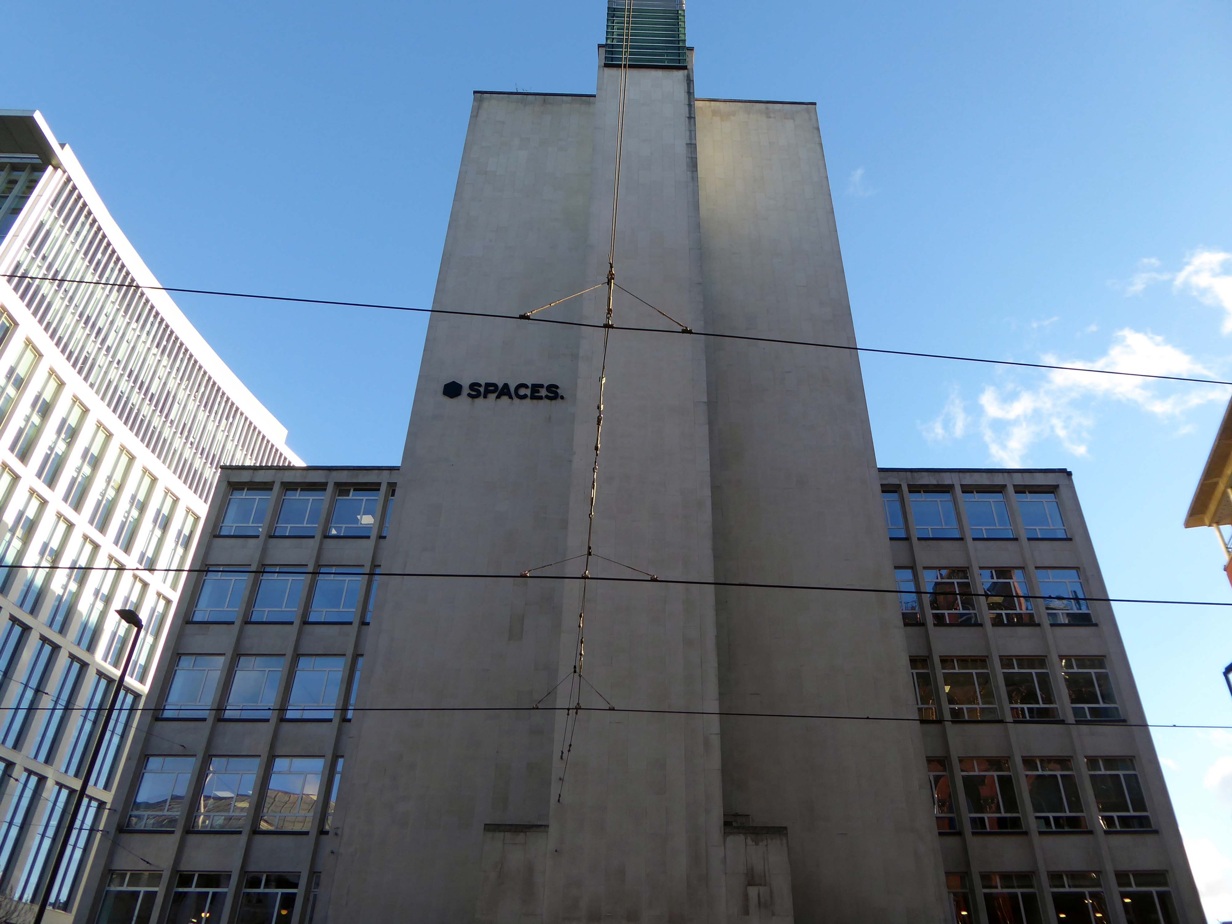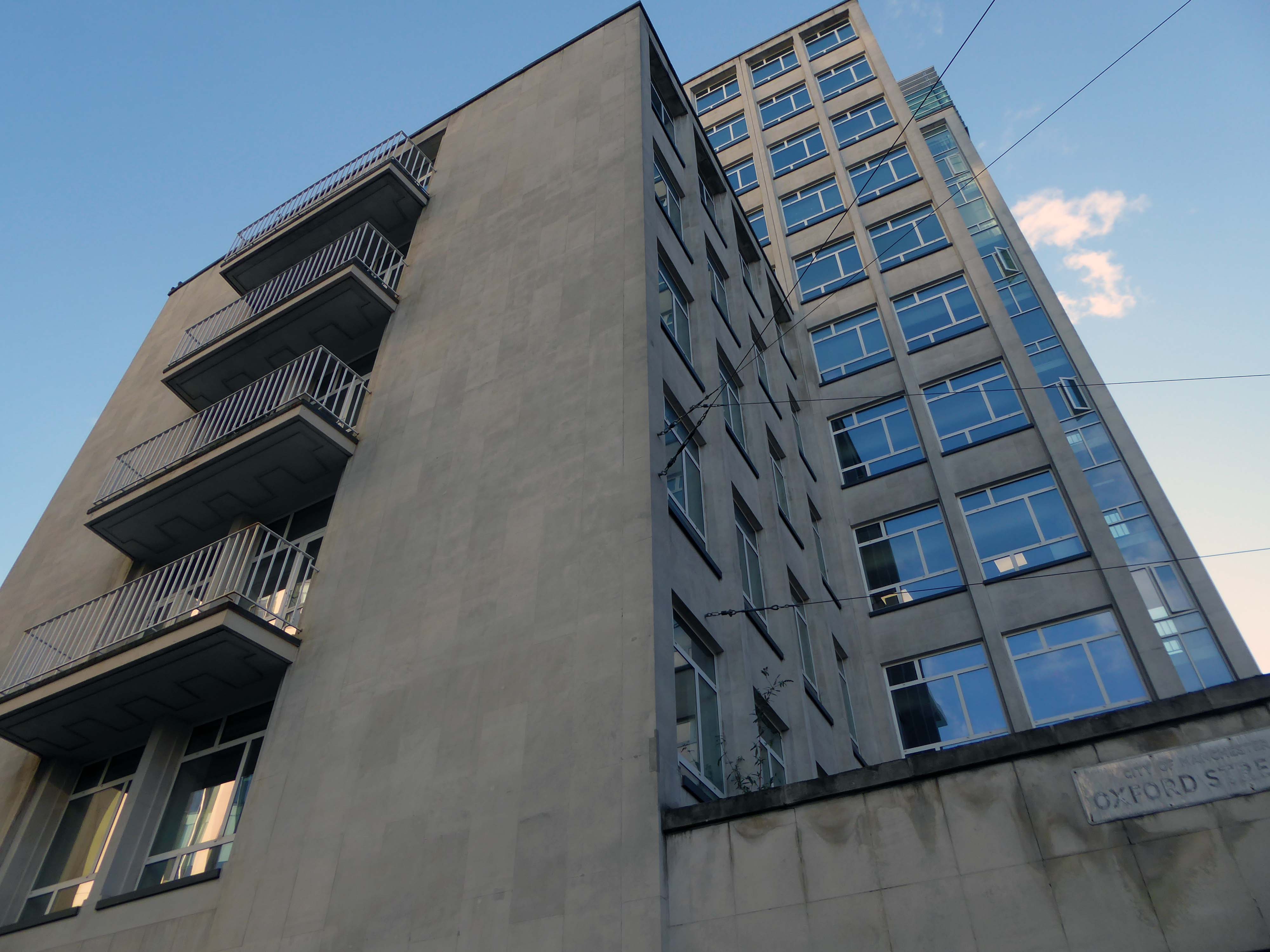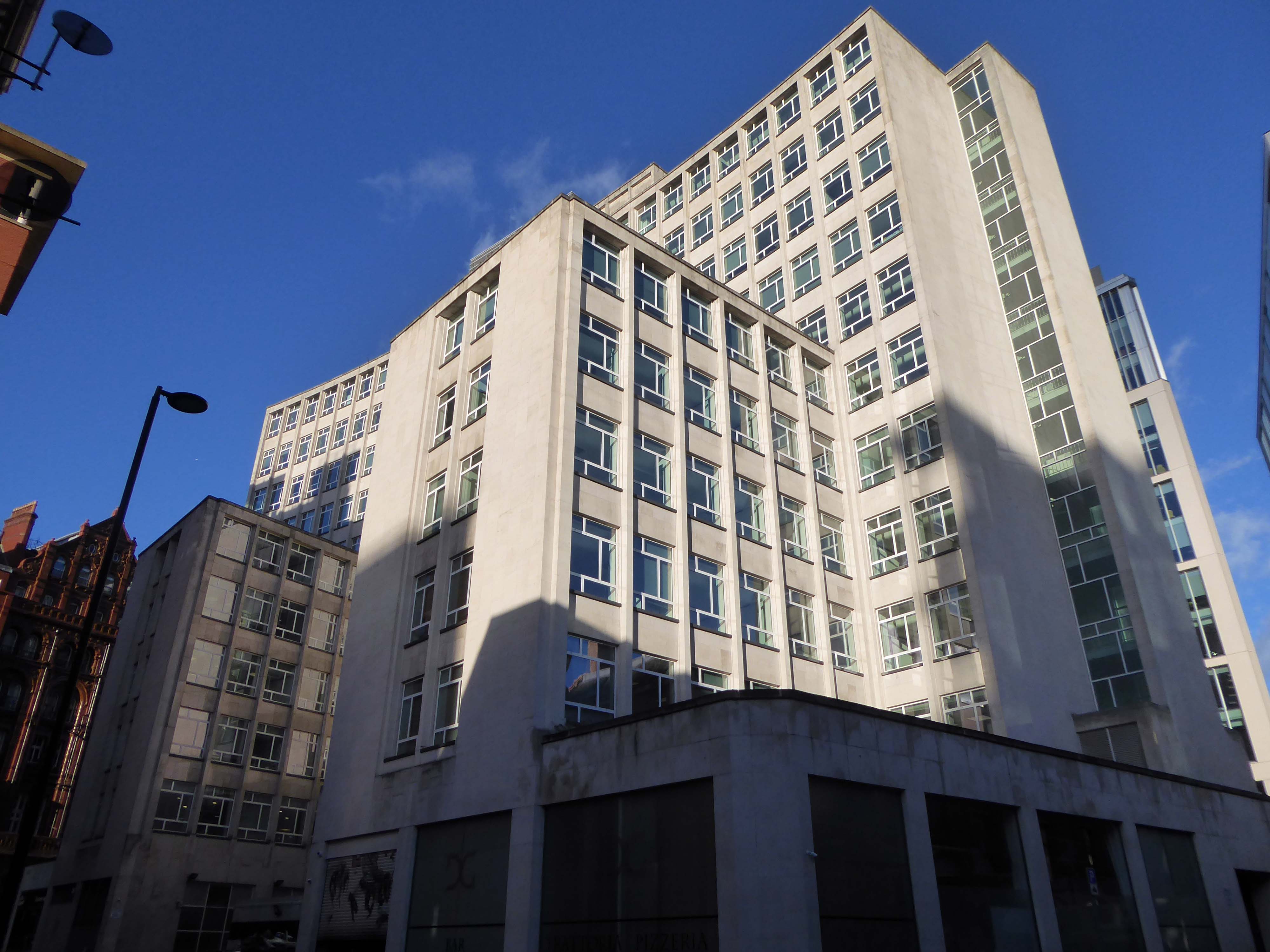 Peter House gracefully hugs the curve of Oxford Street as it leads into St. Peter’s Square. This was one of the earliest commercial buildings to be completed post-war, which demonstrates the slow economic recovery of the region. Built on a site that had been bombed, the Portland stone seemed to marry with the material narrative established by JW Beaumont and LC Howitt in their buildings of the 1950’s and following earlier interwar commercial buildings. This scheme has more panache than the rather serious facades of the Student Union building or the Law Courts though.