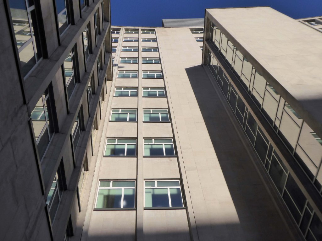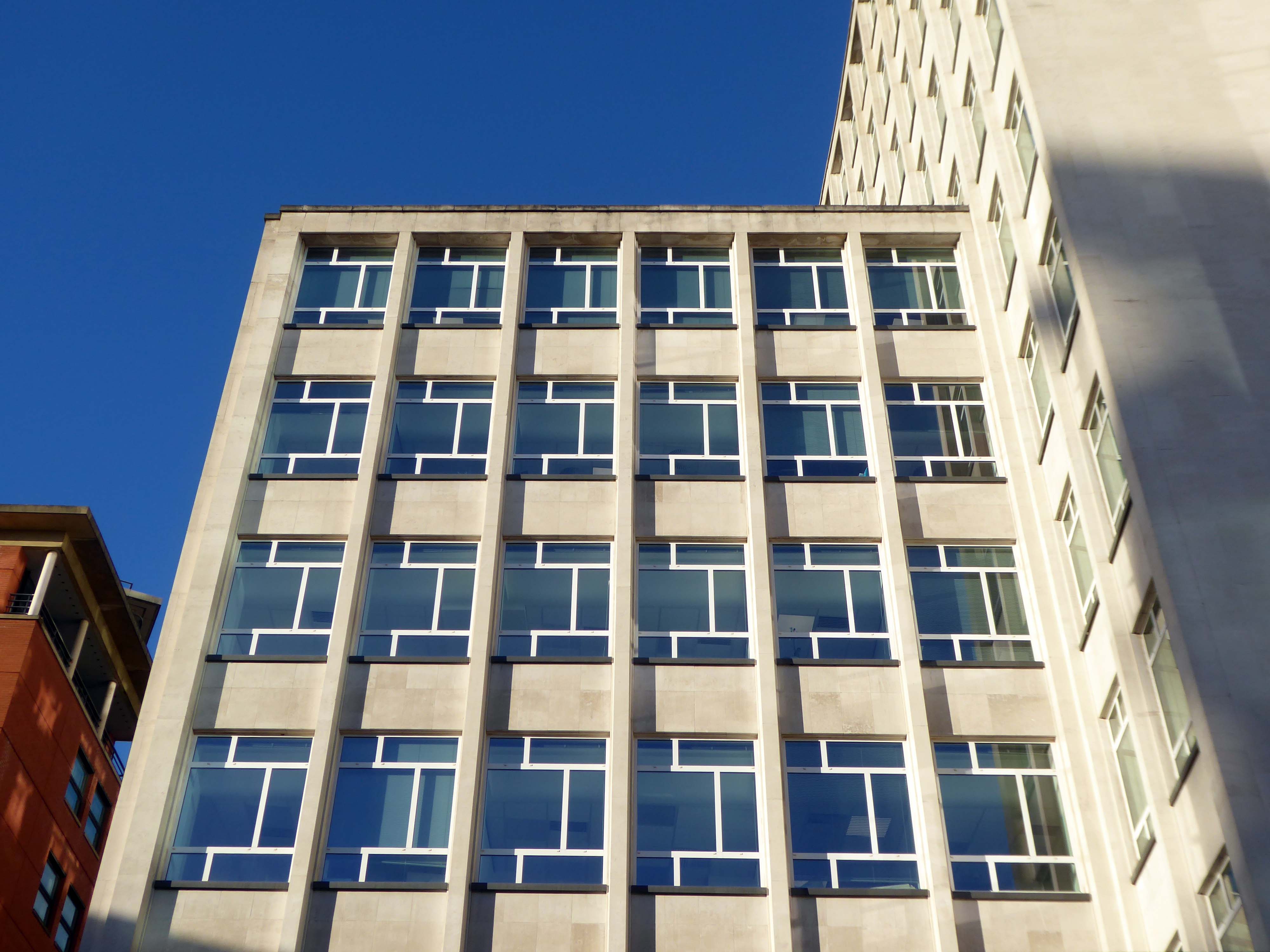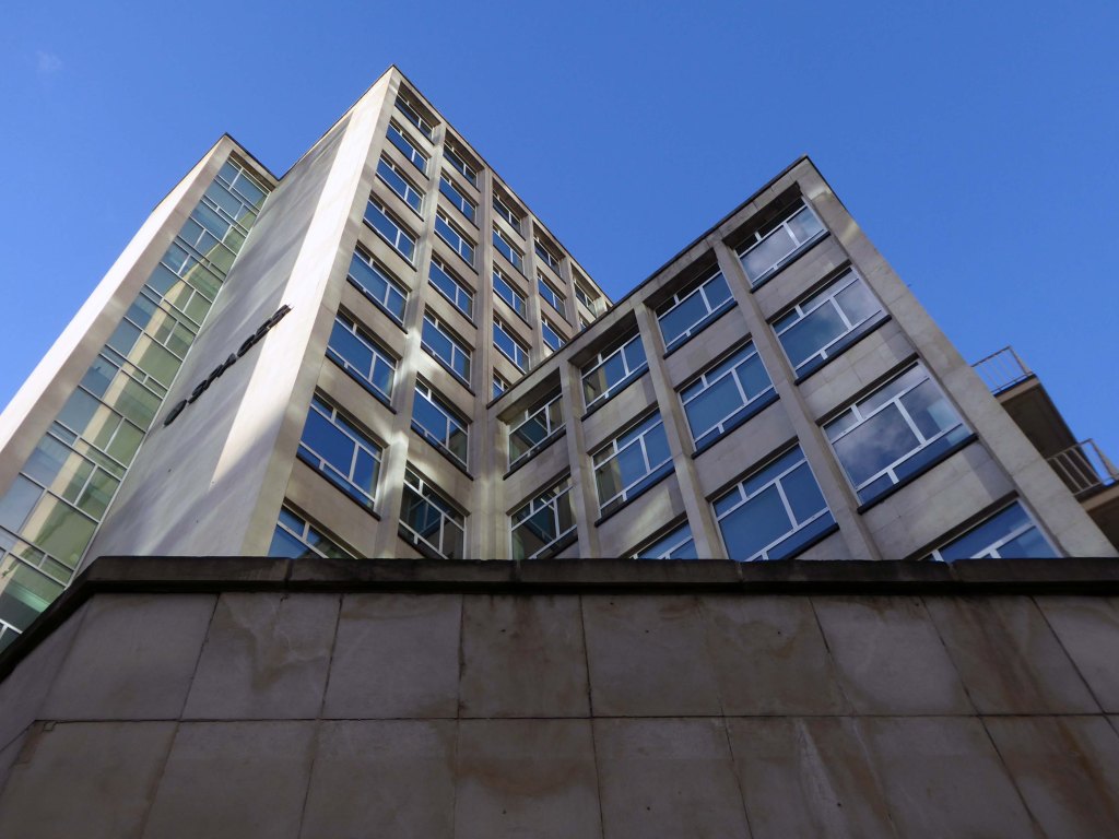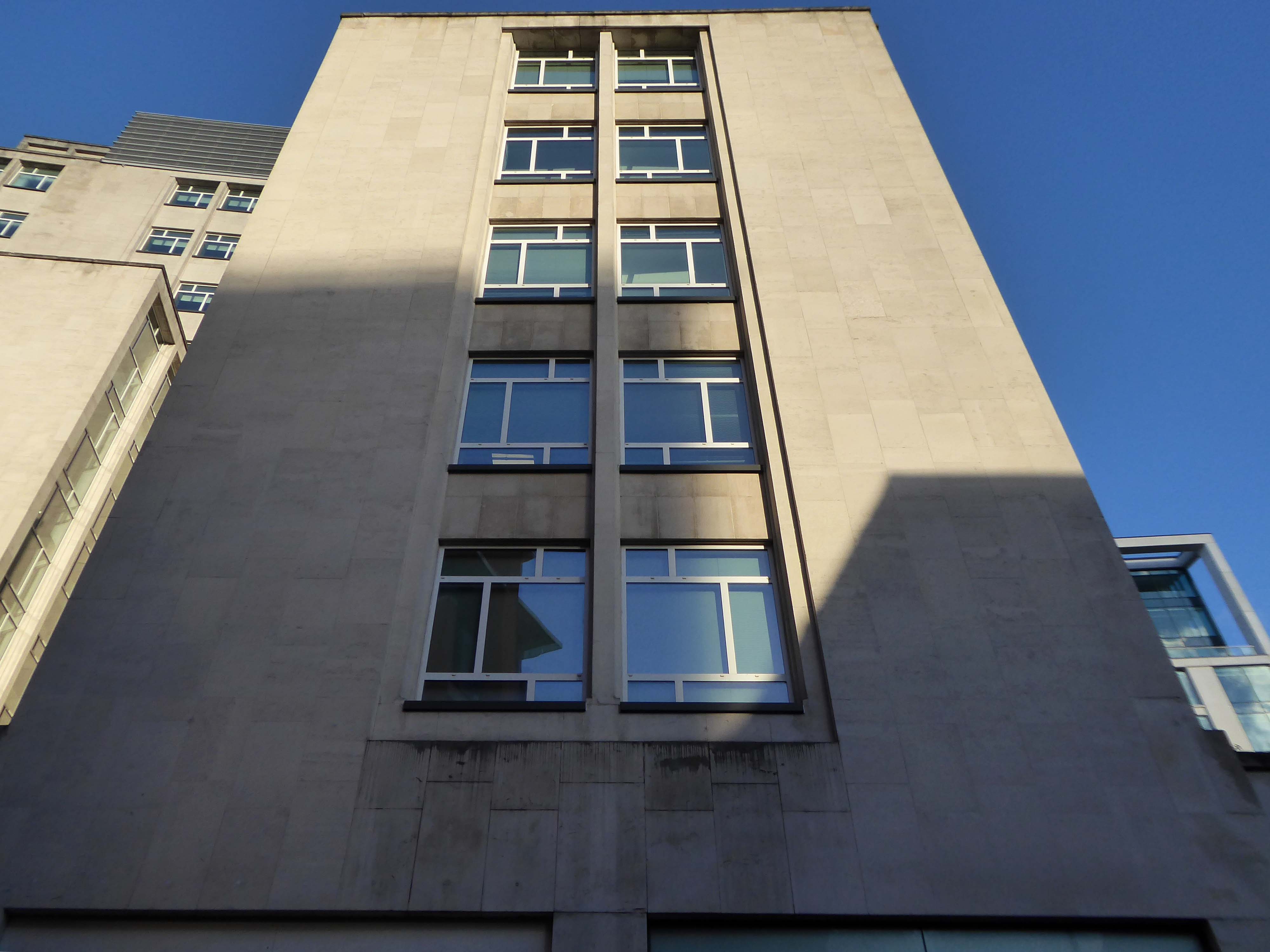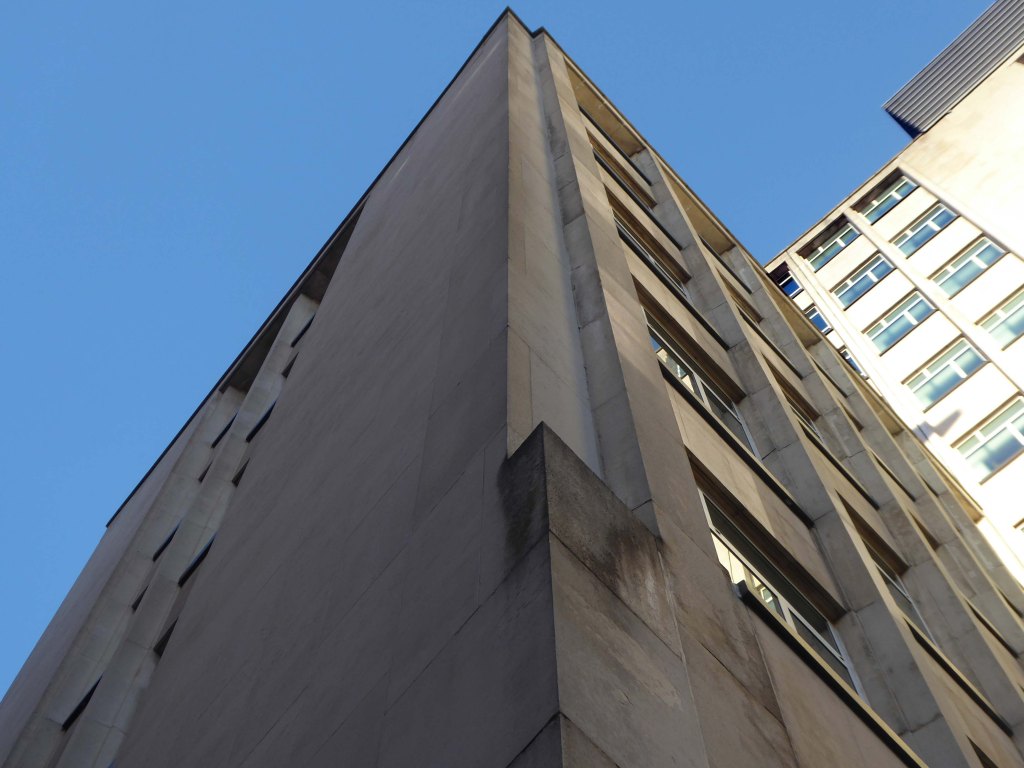 The stepped massing and the articulation of the wings of the building preclude the accepted commercial norm of developing to the edge of the site and instead promote a satisfying formal interplay between the six and eleven storey elements. The building has been sensitively modified despite a lack of any listed status and remains commercially viable as offices and as retail. The continued success may be attributed to the air of quality afforded by the stone, certainly it has ensured the longevity, particularly when one considers the fate that befell the easement hugging concrete of Elizabeth House – Cruickshank & Seward, 1971 across the road; it was demolished in 2012.