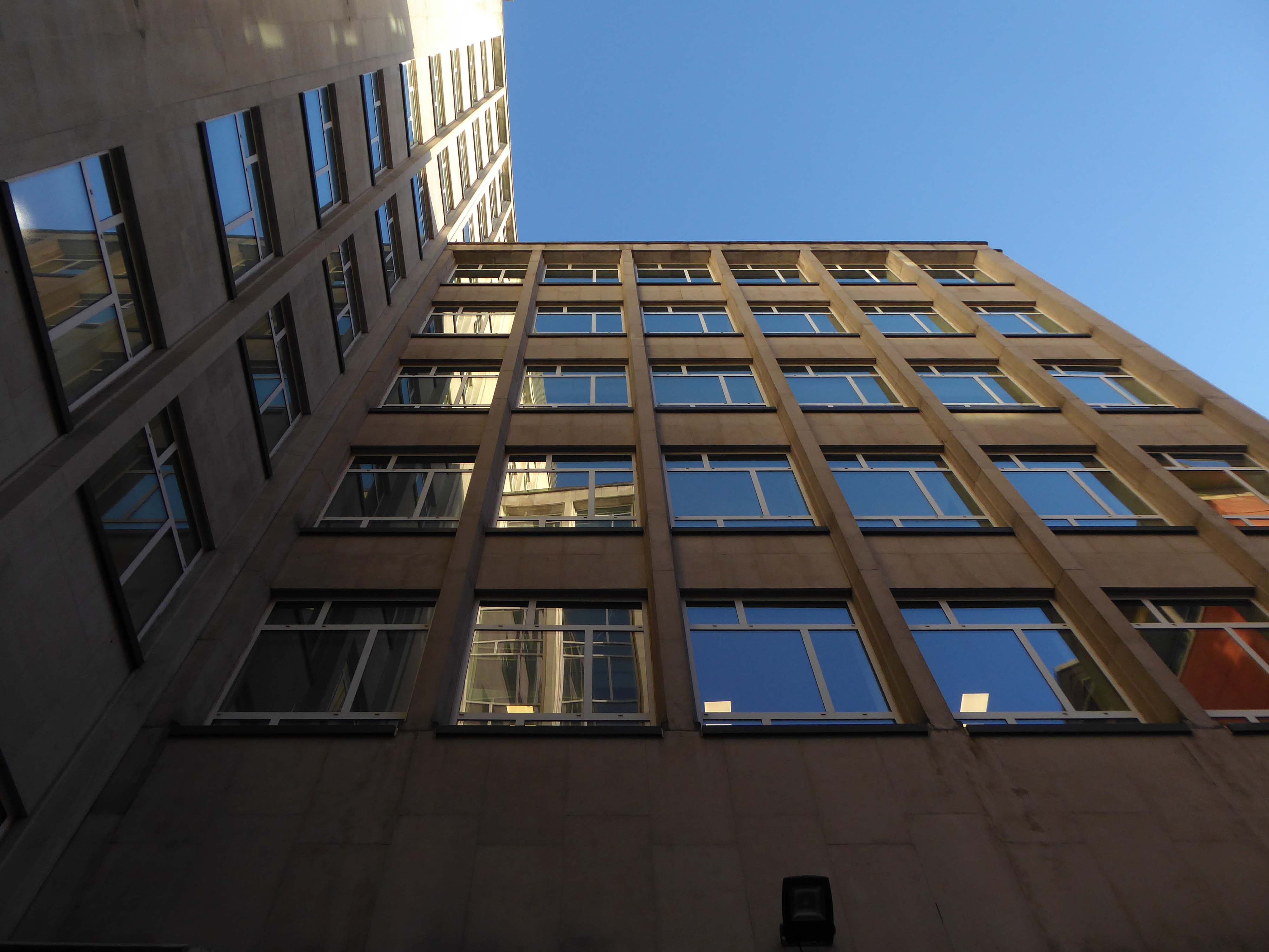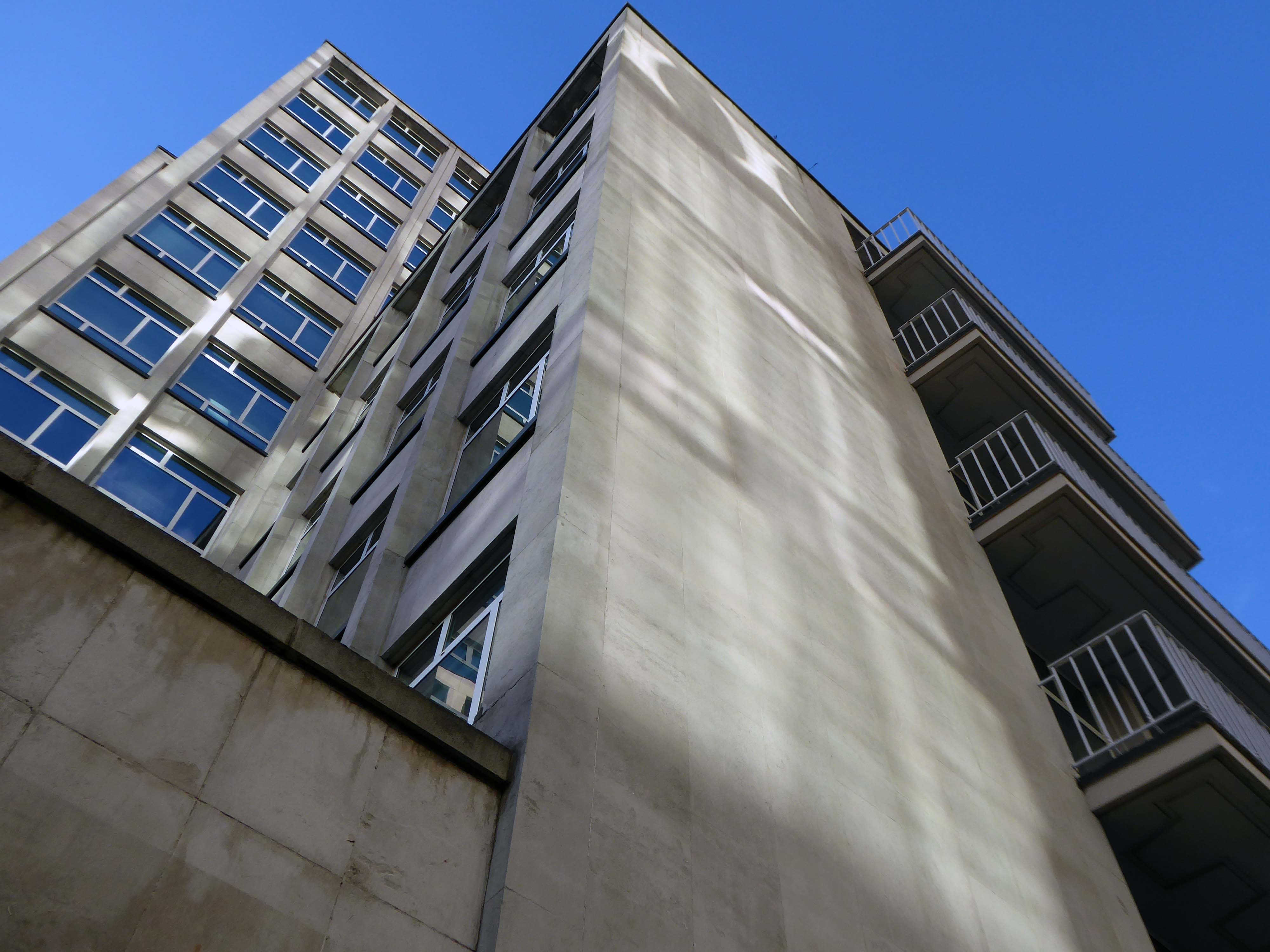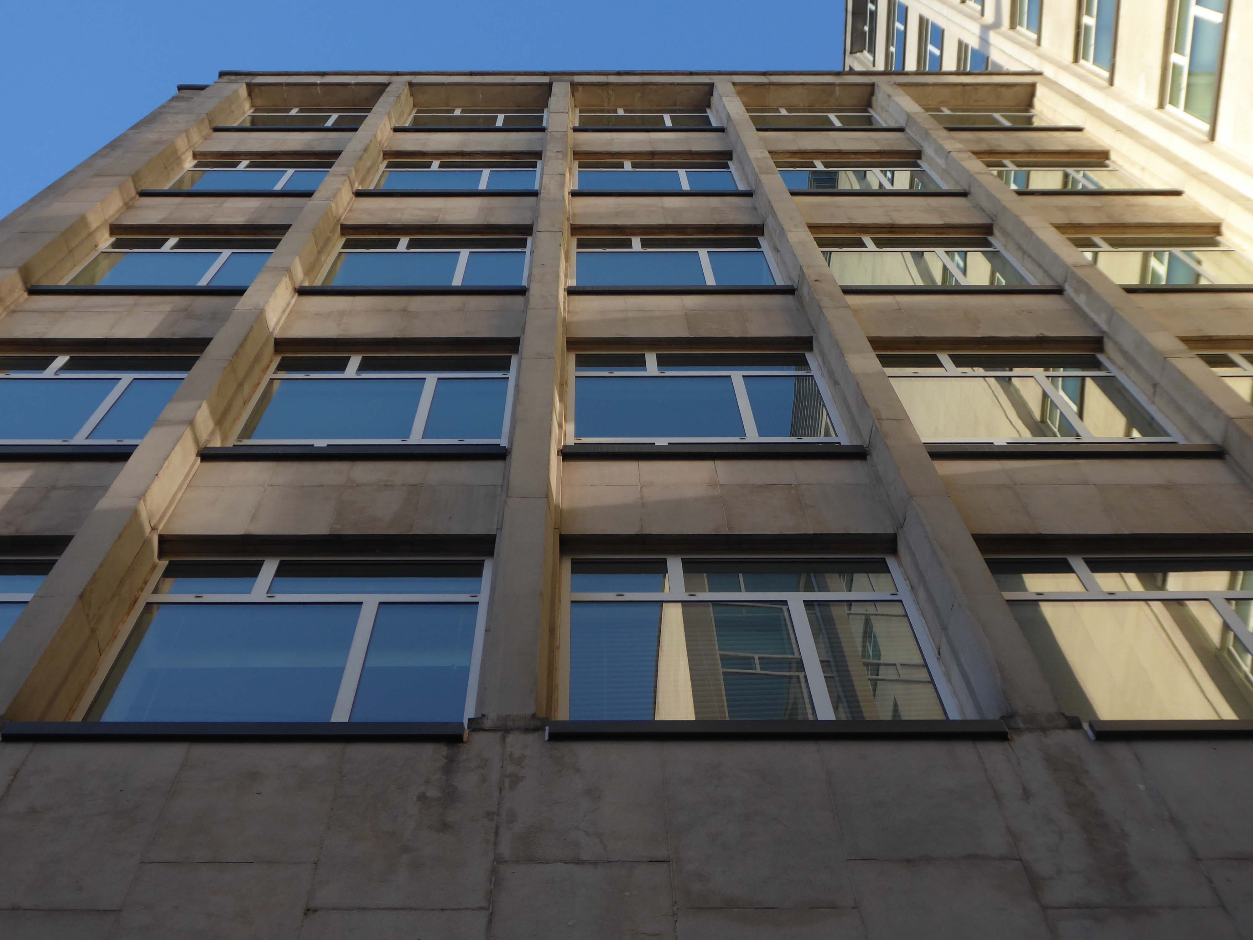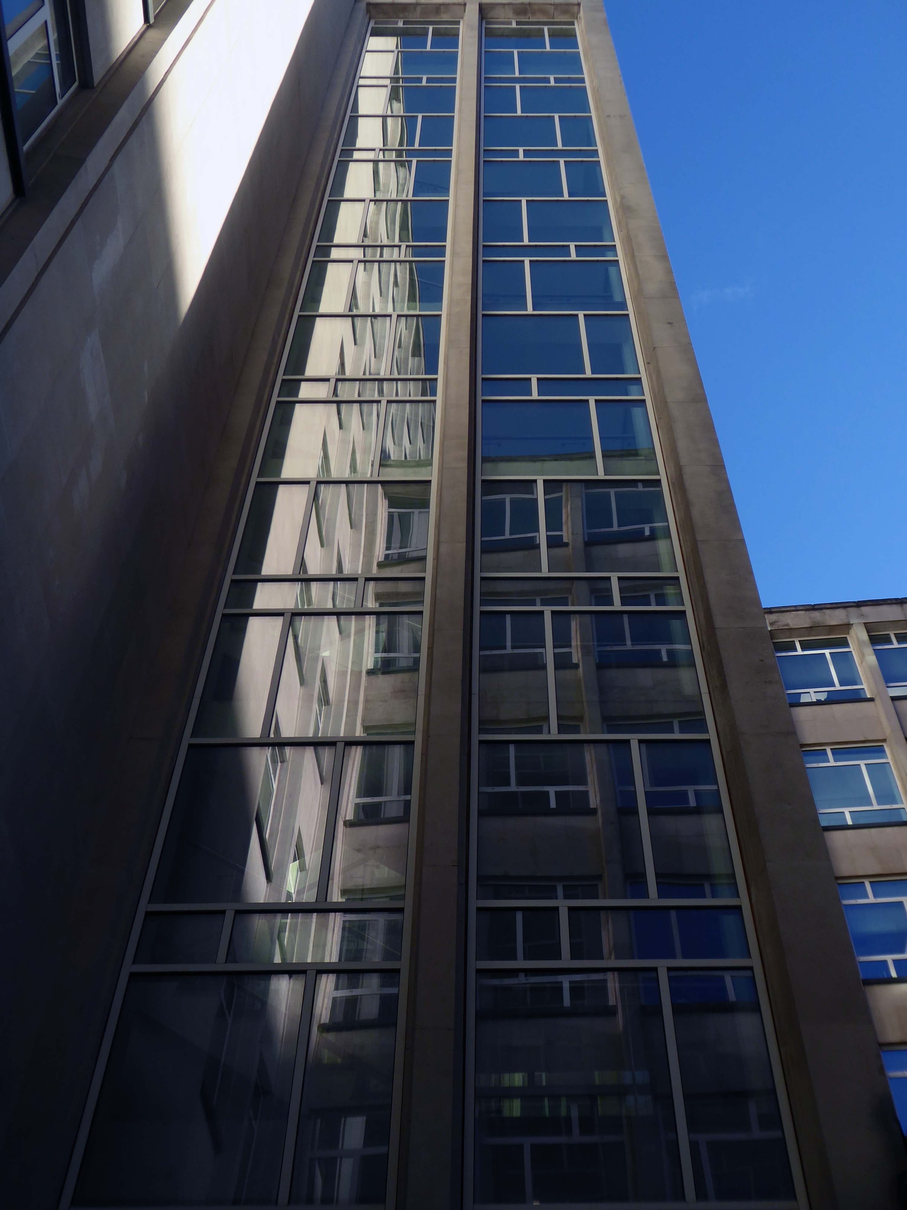 The stepped massing and the articulation of the wings of the building preclude the accepted commercial norm of developing to the edge of the site and instead promote a satisfying formal interplay between the six and eleven storey elements. The building has been sensitively modified despite a lack of any listed status and remains commercially viable as offices and as retail. The continued success may be attributed to the air of quality afforded by the stone, certainly it has ensured the longevity, particularly when one considers the fate that befell the easement hugging concrete of Elizabeth House – Cruickshank & Seward, 1971 across the road; it was demolished in 2012.