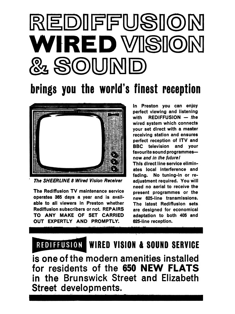 The Rediffusion retail chain, renting and servicing TVs, radios, VCRs and hi-fi systems, was common on high streets until it was bought by Granada Rentals in 1984.