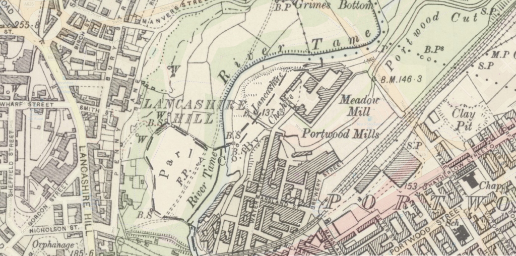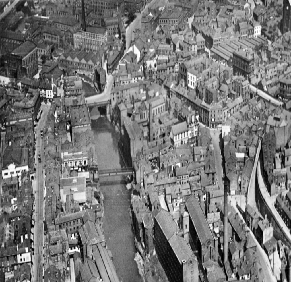 Warren Street Stockport, north of Lancashire Bridge beside the Mersey – seen here in the 1920s a mix of retail, dwellings and industry as was most of the town centre.