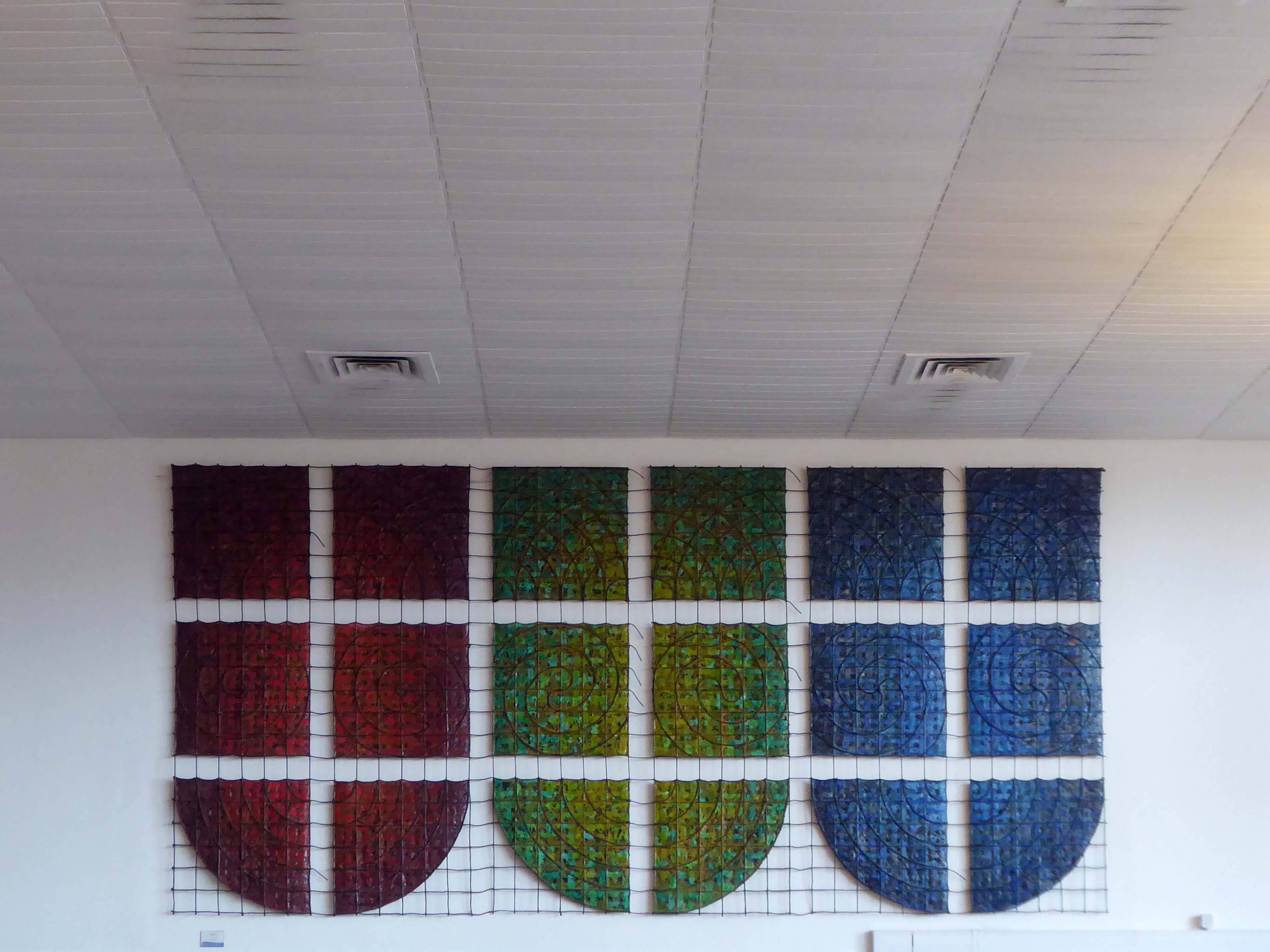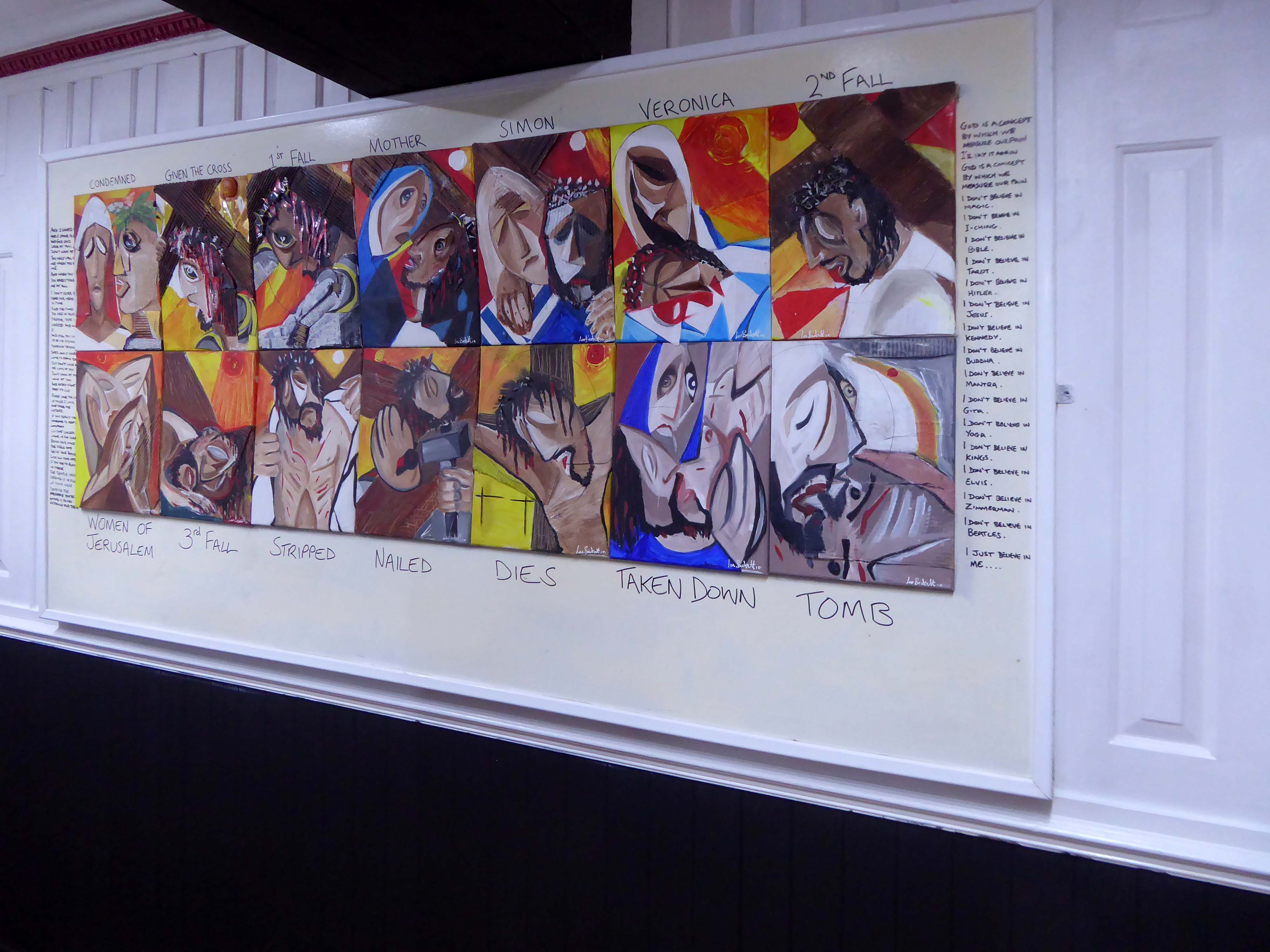 This generously spaced mural in the form of three splendid green, red, and blue shields in glazed plastic material and black cording is a creation in which the artist, Mr Glyn Jones symbolically portrays the Holy Trinity