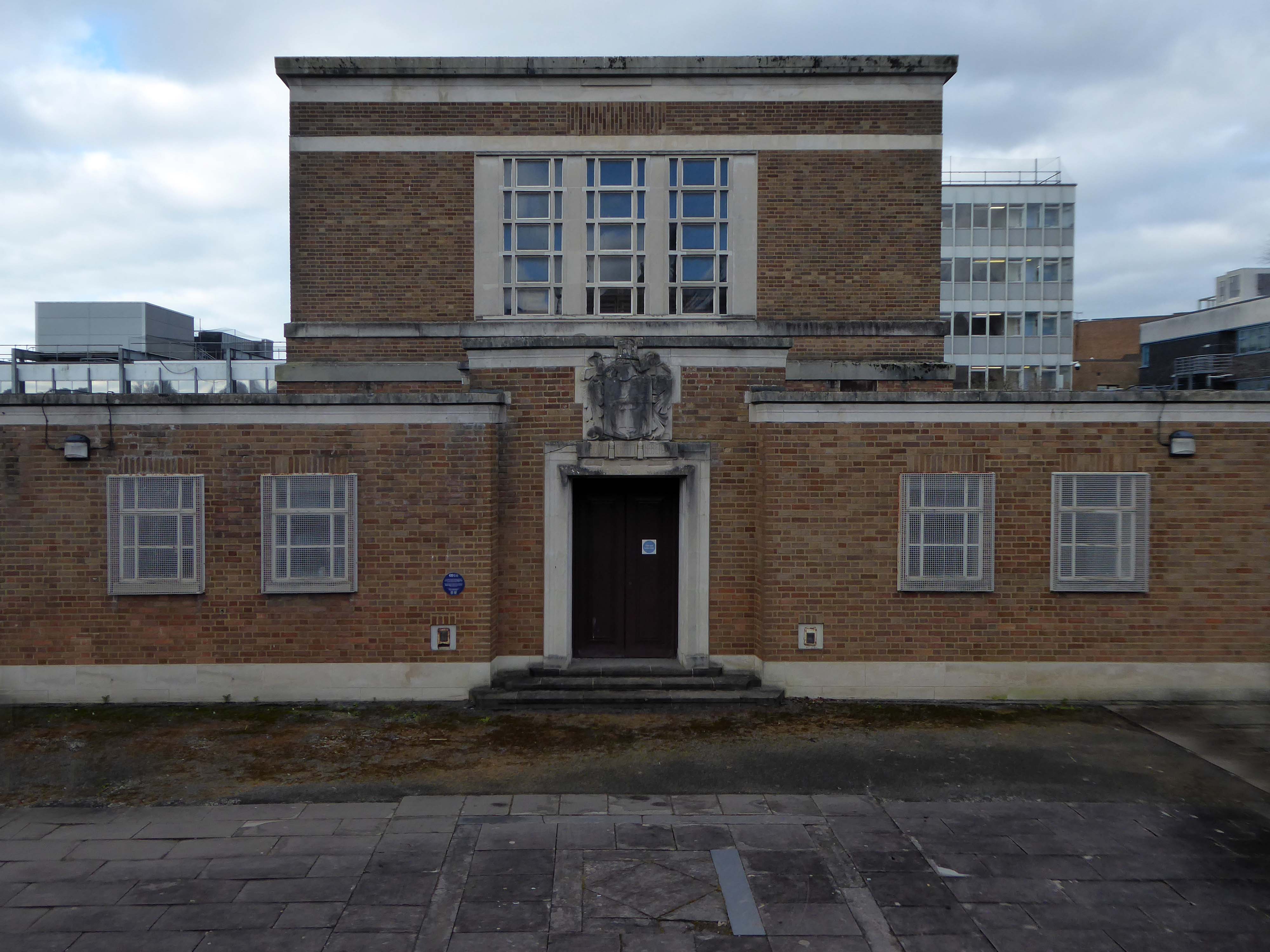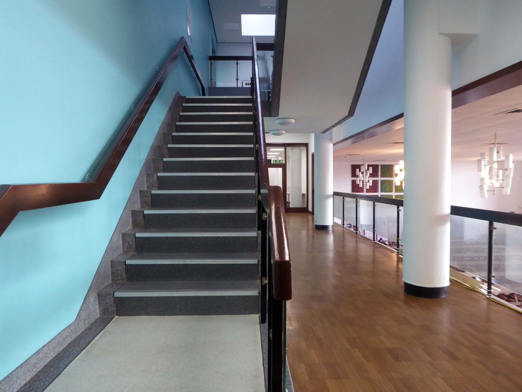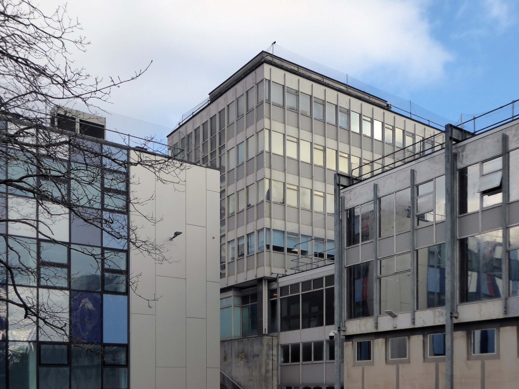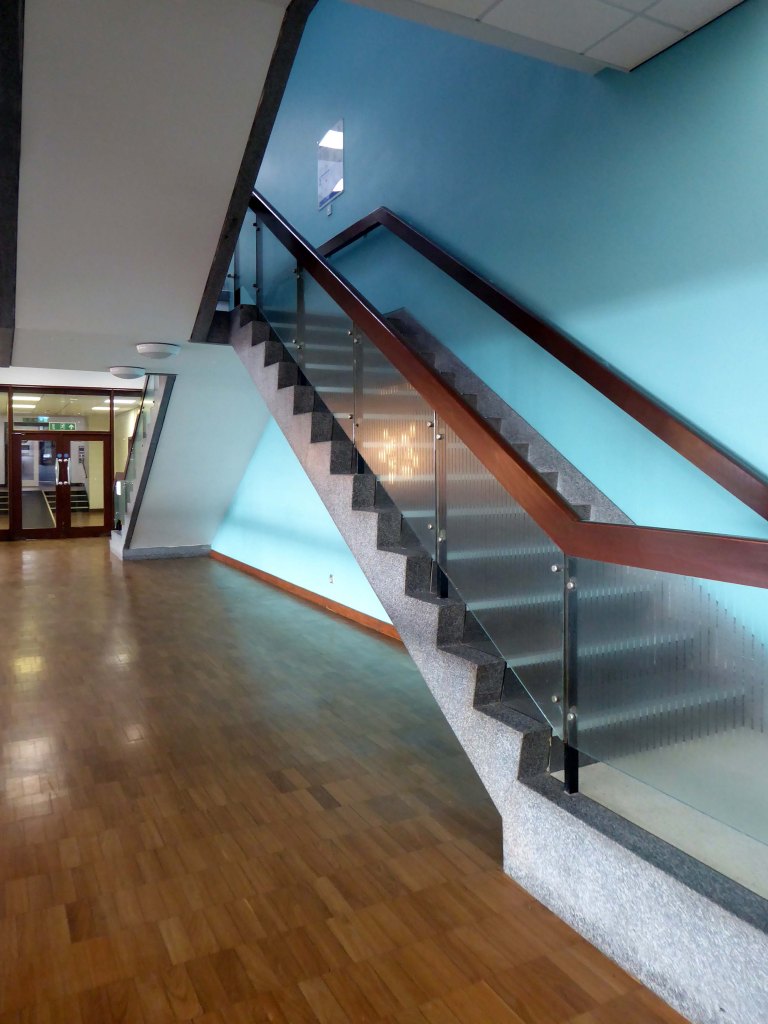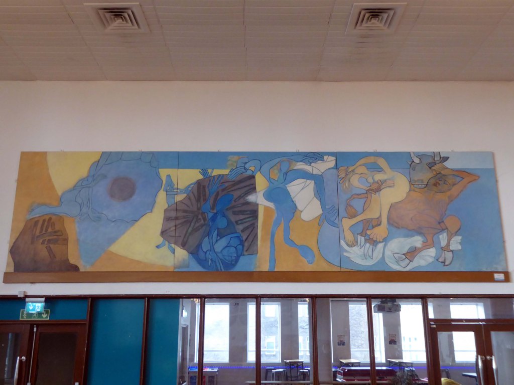 To our right Fulton House – This was built 1958-62 by Sir Percy Thomas & Son – design partner Norman Thomas. The decorative scheme in the main hall is by Misha Black; the panels ofThe Rape of Europa by Ceri Richards are an addition of 1970.