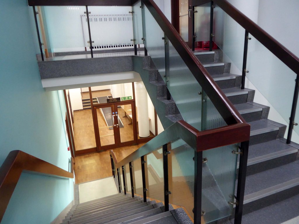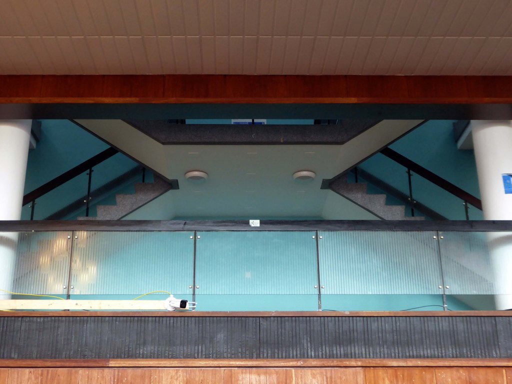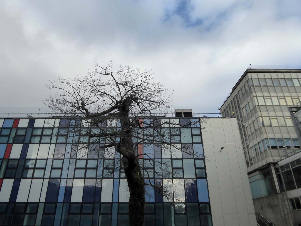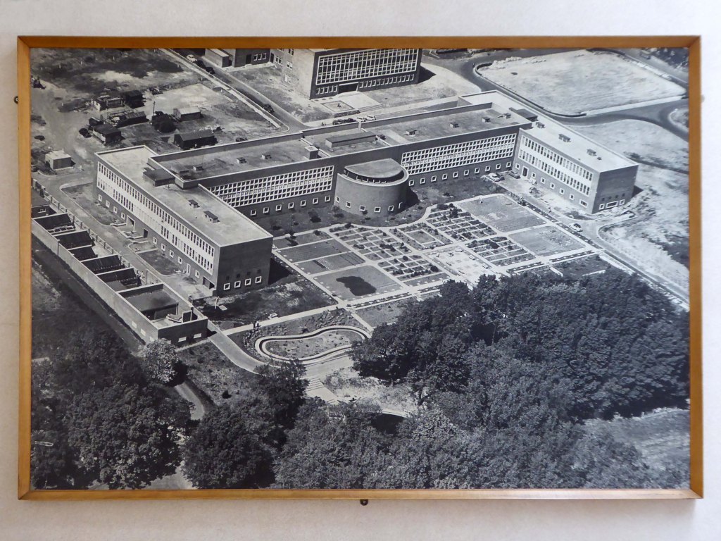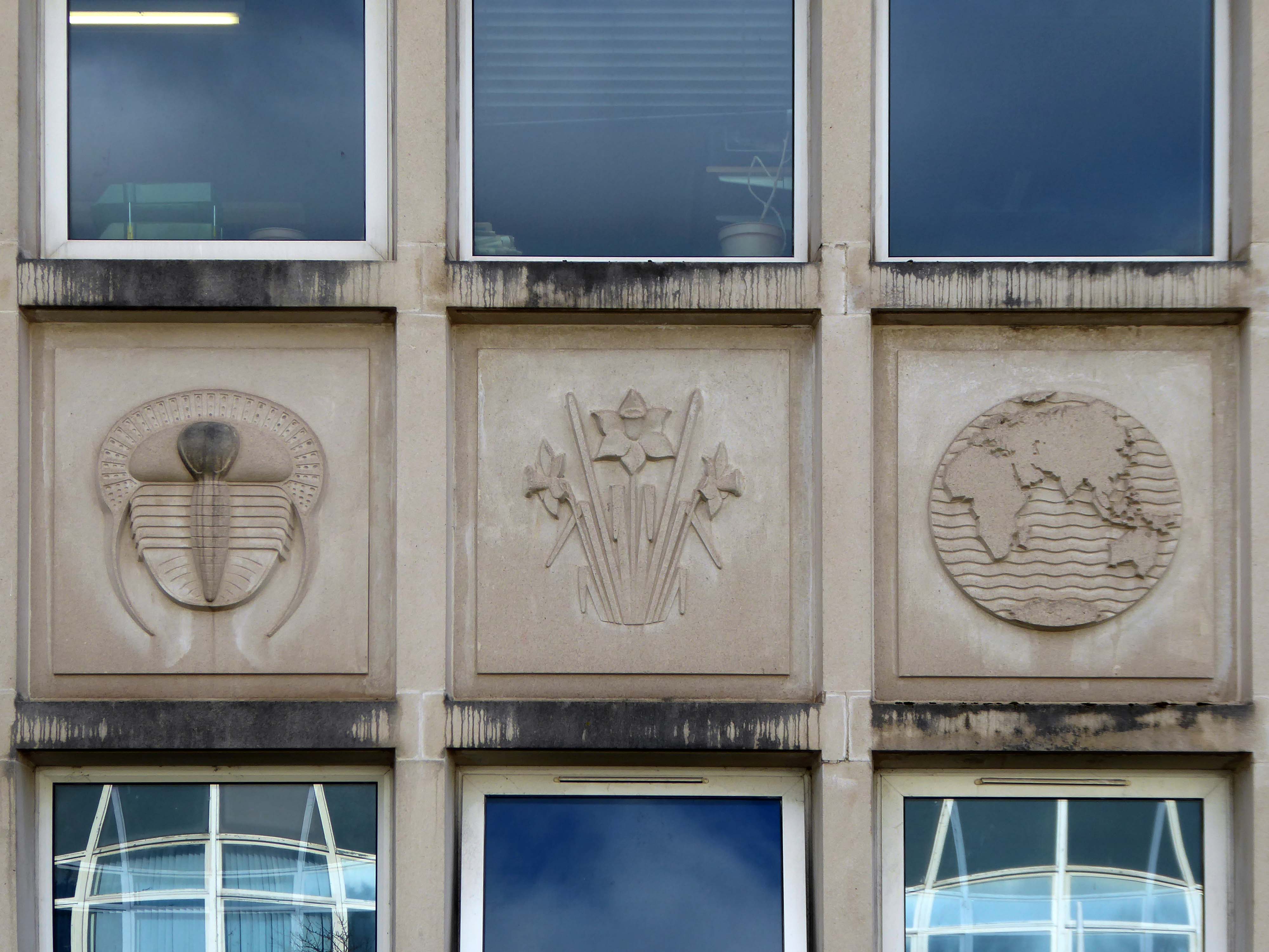 To our right Fulton House – This was built 1958-62 by Sir Percy Thomas & Son – design partner Norman Thomas. The decorative scheme in the main hall is by Misha Black; the panels ofThe Rape of Europa by Ceri Richards are an addition of 1970.