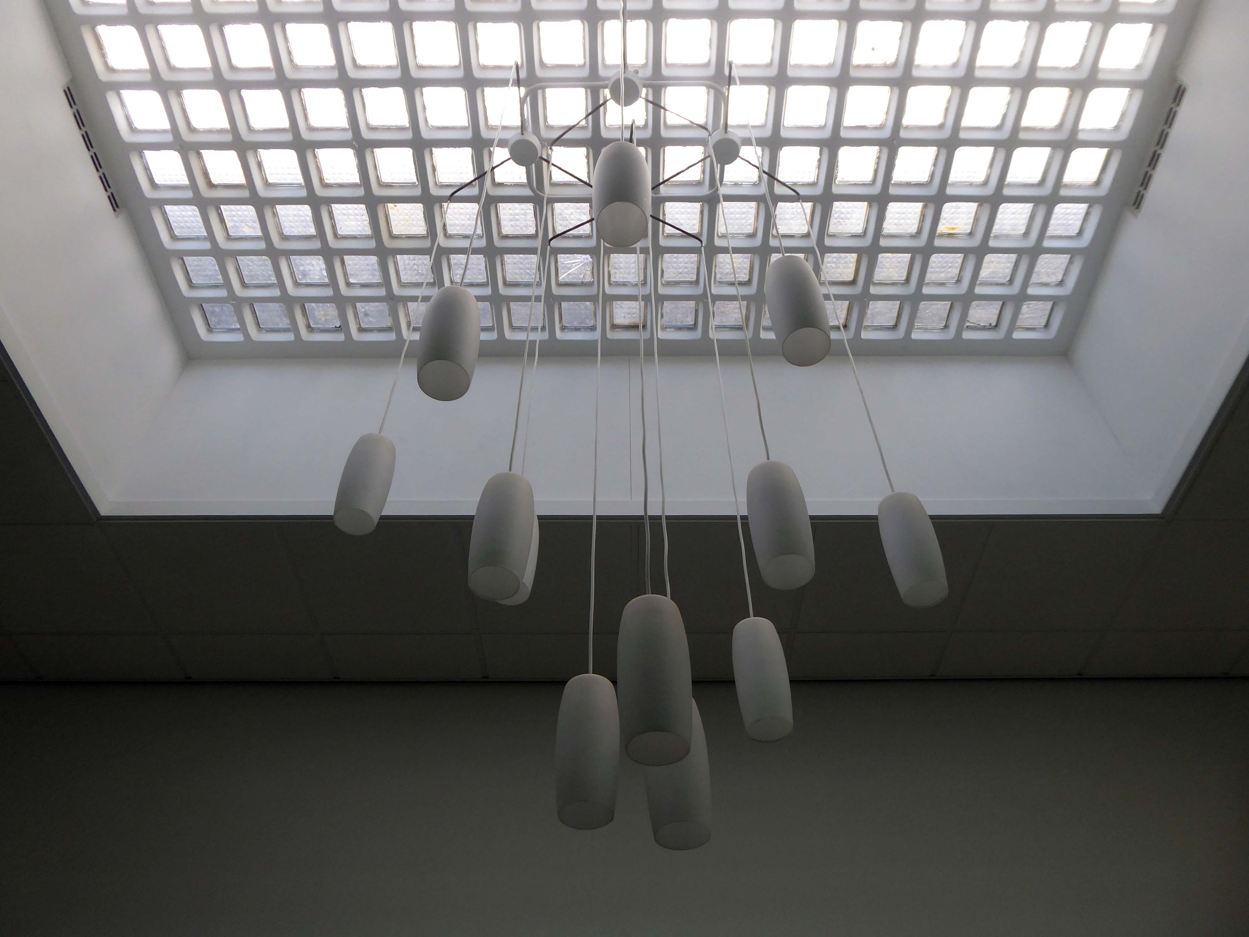 This large wall hanging measuring H305cm x W620cm hangs on the wall opposite the Ceri Richards paintings. The hangings were very dusty and the nails holding the piece up were rusty. We were able to interview the artist to find out more about how the hanging was made. Glyn Jones used a blow torch to apply pitch and PVA medium to canvas and skrim fabric that he then attached to a geometric rope structure. Gouache paint was used and a solvent fixative spray allowed the colours to become imbibed into the PVA film. The hanging was made in six panels and then the horizontal rope ends glued together on site. These glued attachments had failed several times in the past and Jones had fixed them. With his permission we decided to come up with a new approach to these fixings. After cleaning the panels, we adhered magnets into the ends of the ropes so that they would click together easily. We reinforced the vertical ropes between the sections with nylon thread. Strong polyester was attached to the back of the top edge allowing a new hanging system where the strips were screwed into the wooden fixing battens. The hanging now looks much brighter and more colourful and detaching rope problem has been permanently resolved.