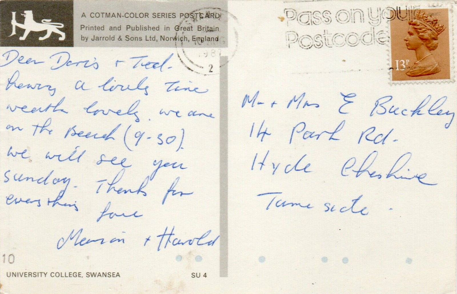 This card shows the Singleton campus of Swansea University. Top right, the abbey which was the university’s original building; beyond that the houses around St Helens – the sports ground where in August 1968 Sir Gary Sobers scored six sixes in an over for Nottinghamshire against Glamorgan.