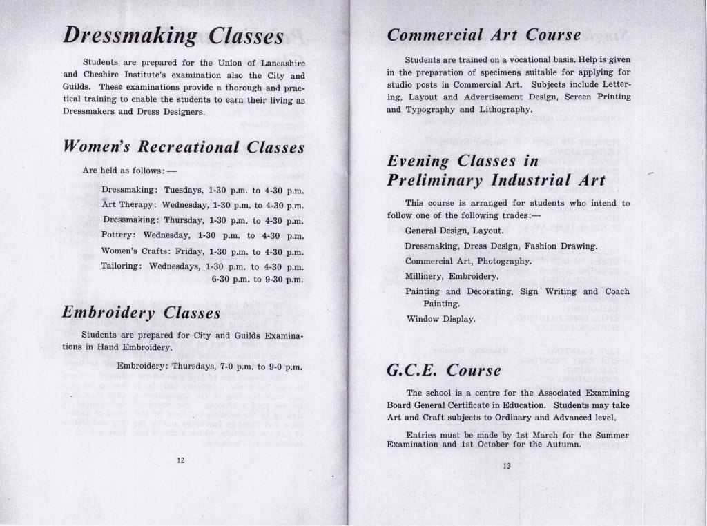 There are now full-time courses in Art and Design – though there were no degree courses until 1974, students would find employment, places on a teacher training course or possibly progress to one of the London colleges, which did have graduate status.