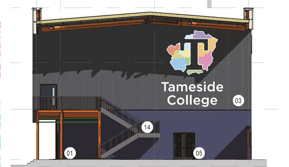 Heckford Signs work with Willmott Dixon approached on a new coloured acrylic sign for the new Construction Skills Building at Tameside College. The aim for this new sign was to create a showcase of the college logo at an eye-catching size, to include 3D elements which would be housed on the East elevation of the impressive new building on campus.