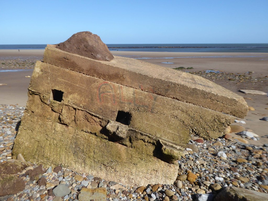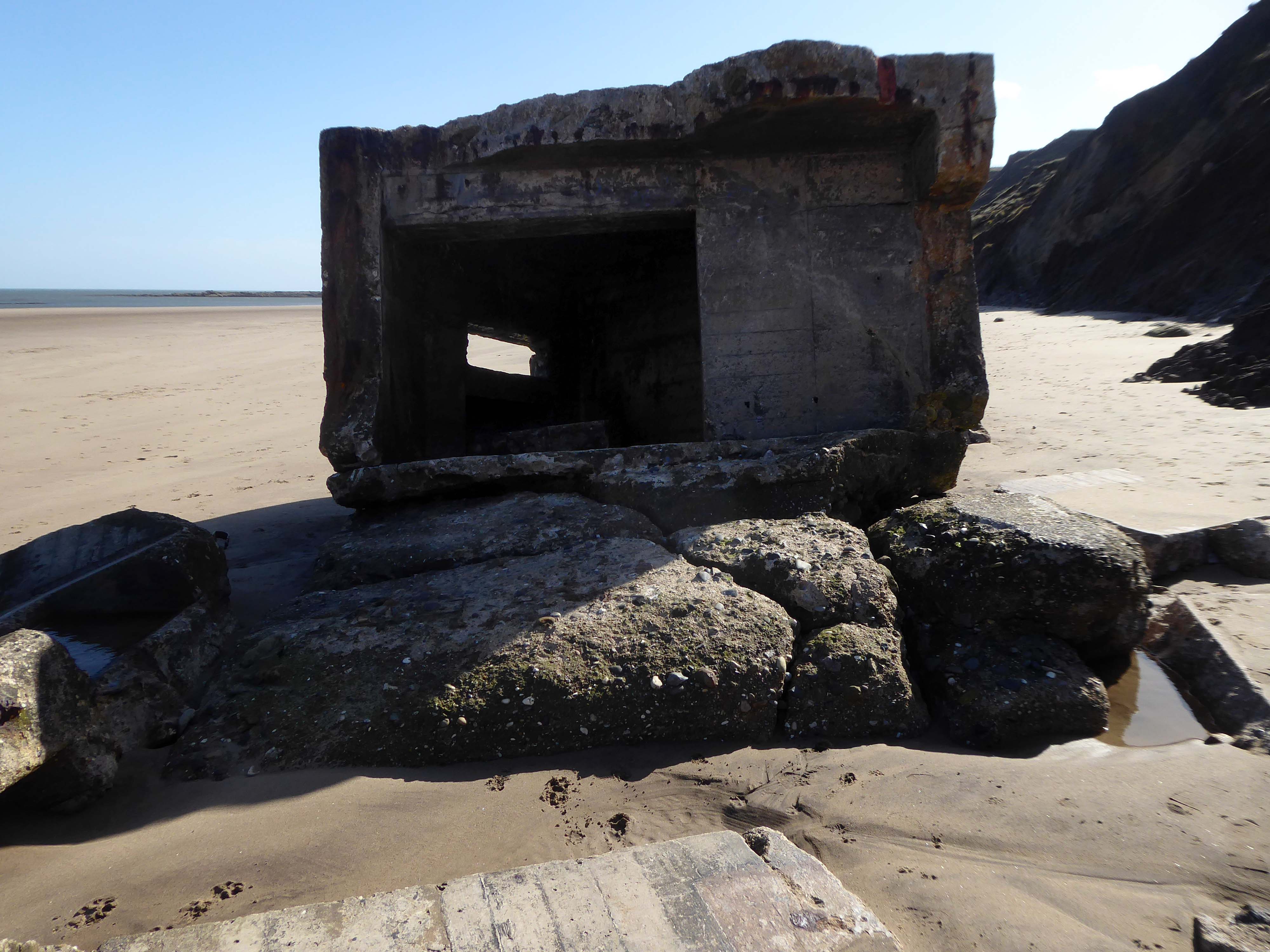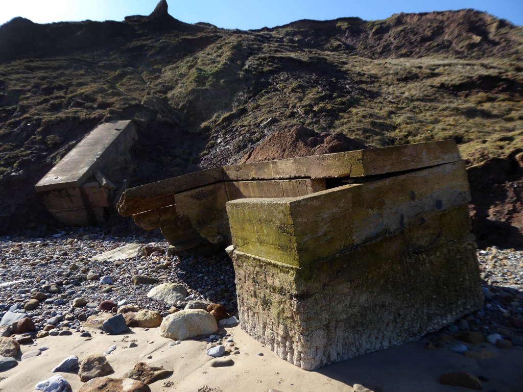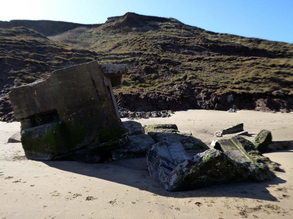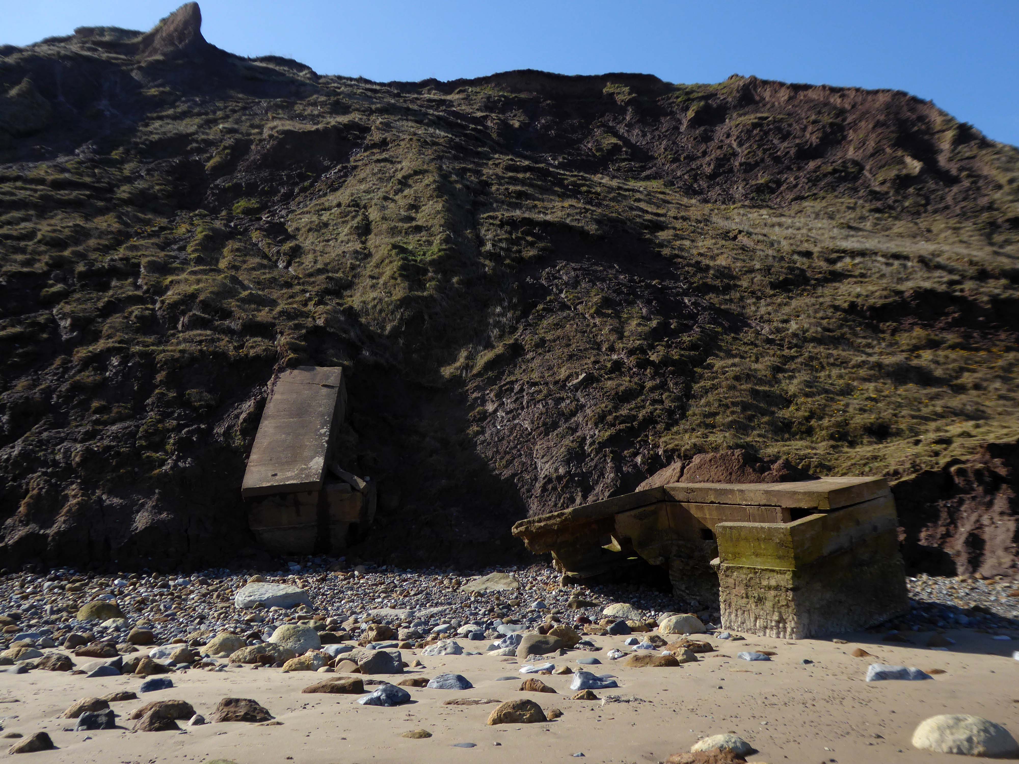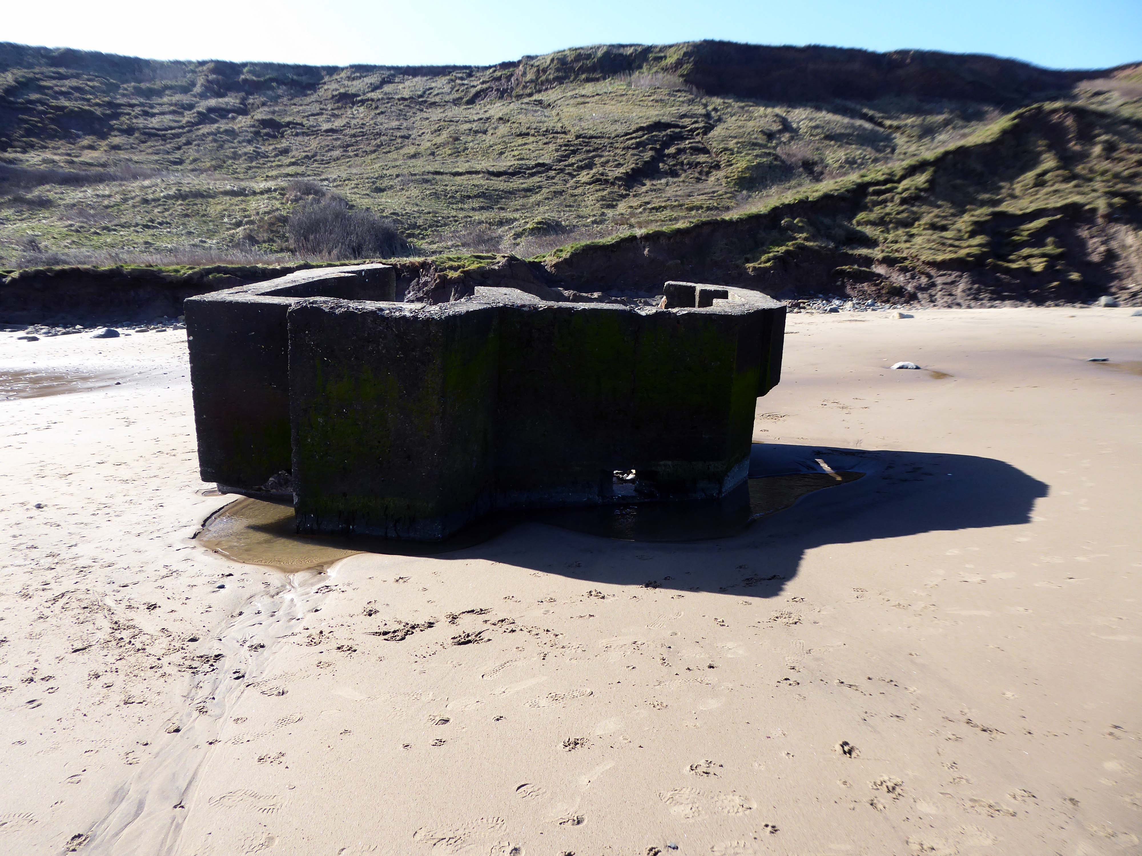 Claims that we pushed the pillbox off the cliff are untrue – our colleagues have many amazing talents but pushing huge concrete structures is not one of them. The structure people can see at the base of the cliff is the other section of the pillbox that has been on the beach for many years.