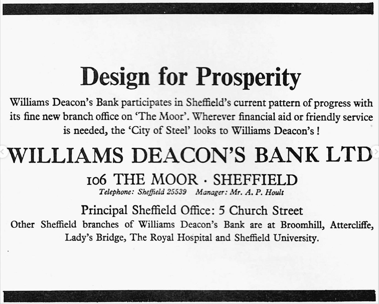 In 1969 The Royal Bank of Scotland was restructured and Williams Deacon’s became a direct subsidiary of a new holding company, National & Commercial Banking Group. The following year the holding company’s subsidiaries in England and Wales – Williams Deacon’s Bank, Glyn, Mills & Co and the English and Welsh branches of The National Bank – merged to form Williams & Glyn’s Bank.