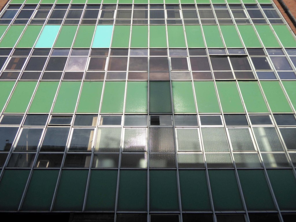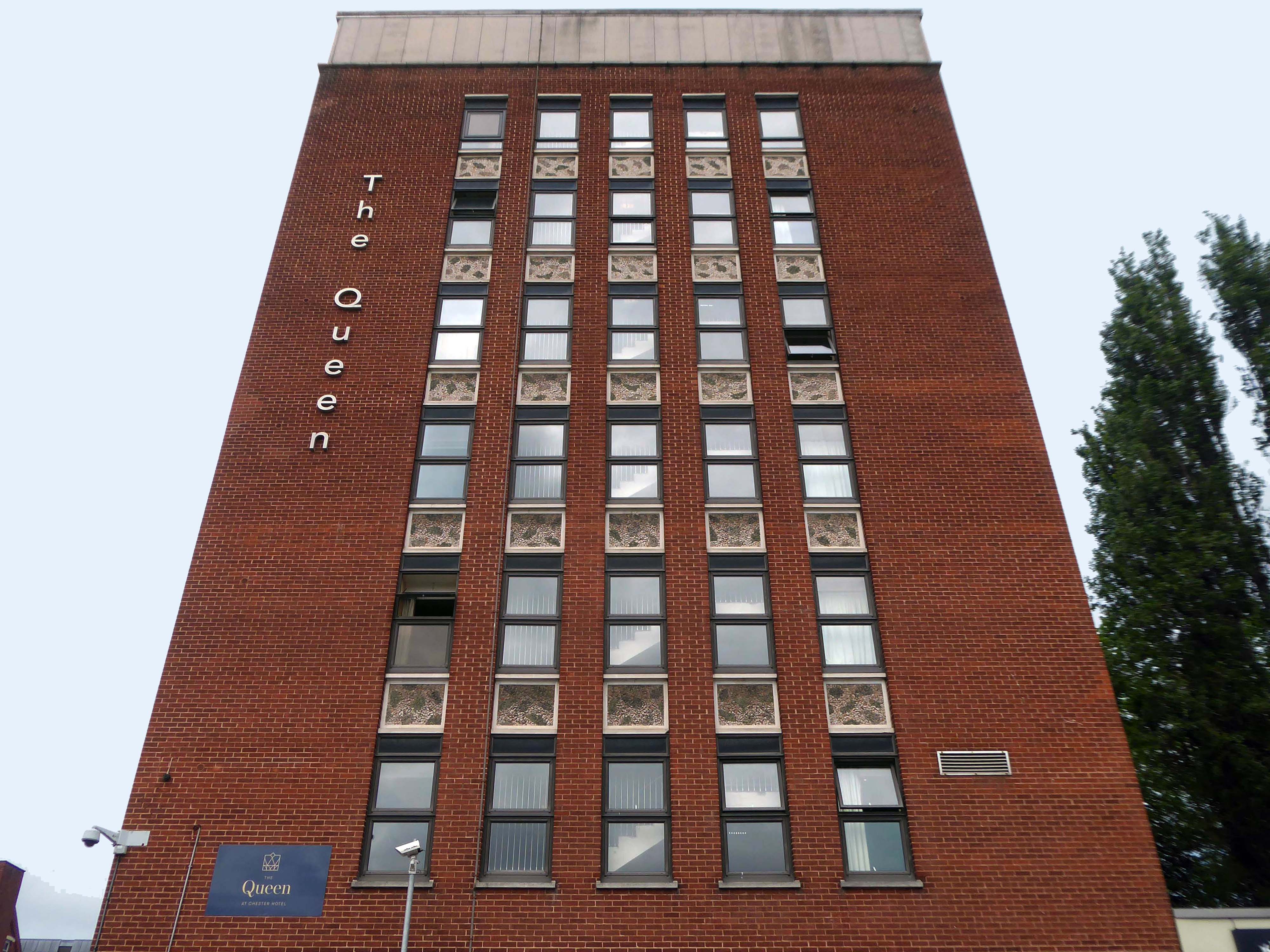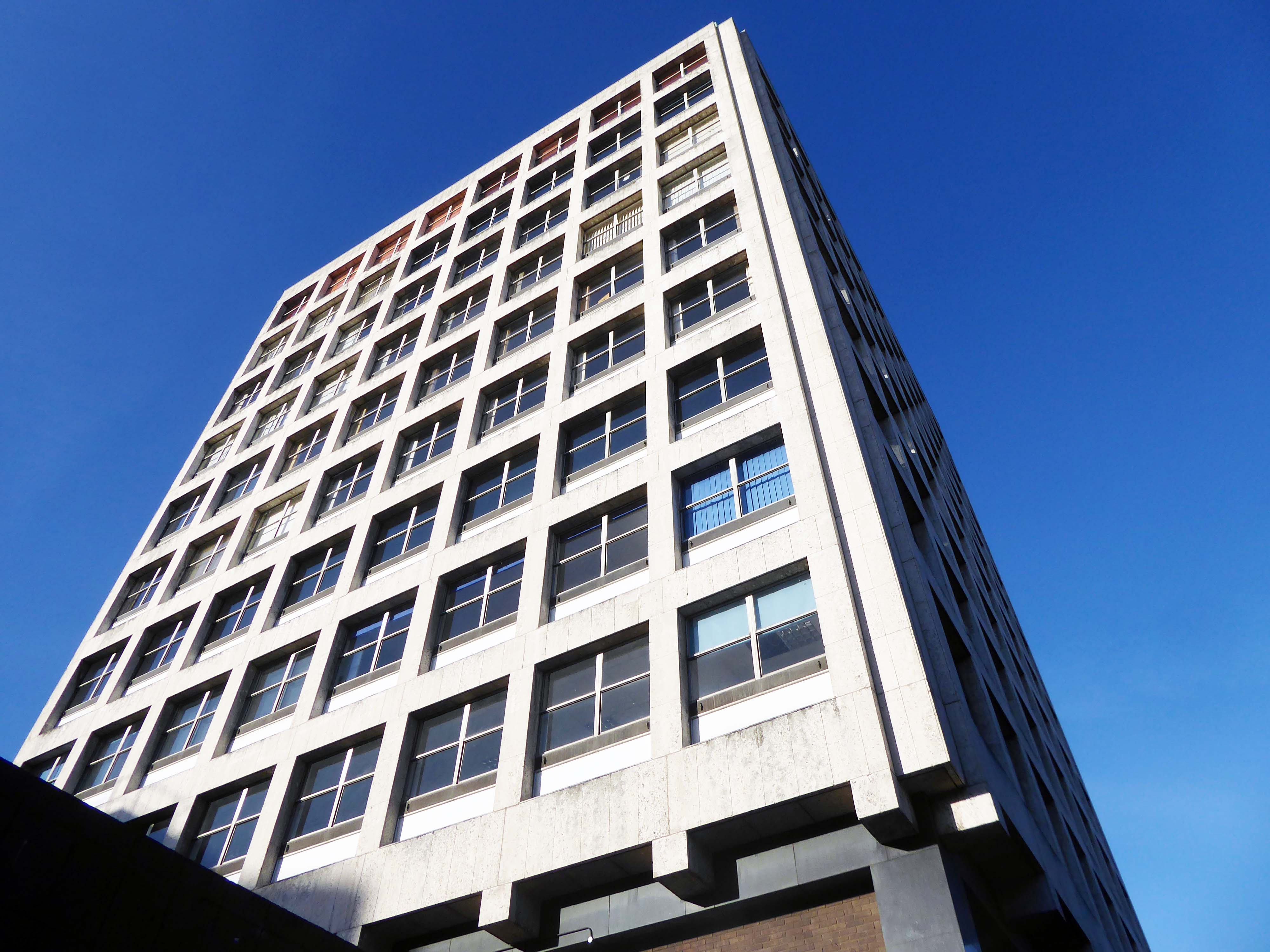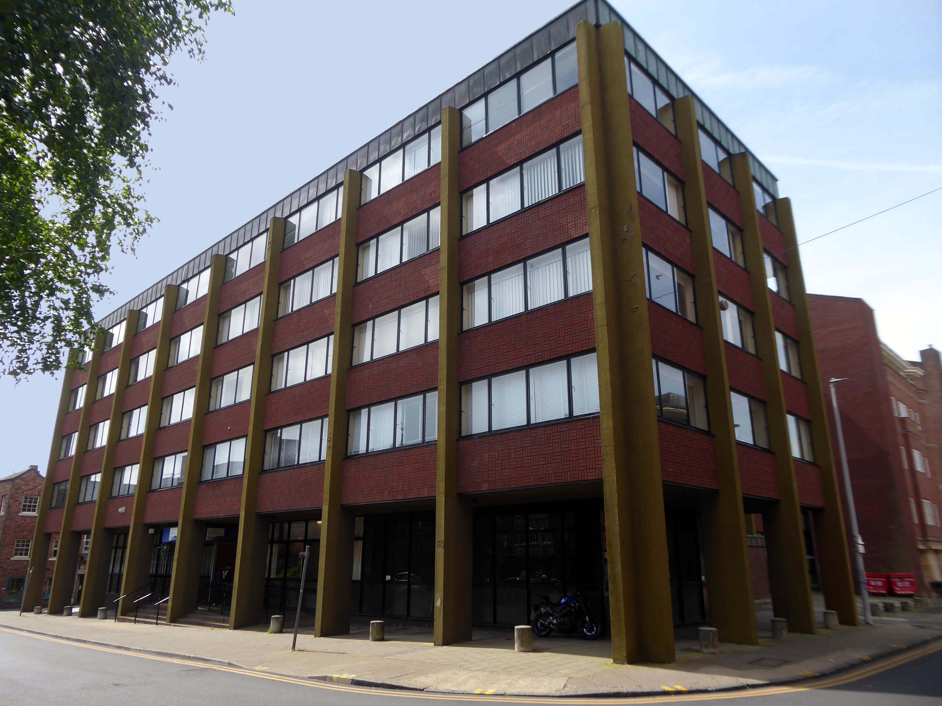 Former North West Securities HQ. elegant 1960s tower of 7 storeys – brick clad, with curtain wall glazing panels in part. Short elevation to street frontage with strong vertical emphasis provided by full height continuous window slots, set in projected concrete frame, tiled panels below each window.