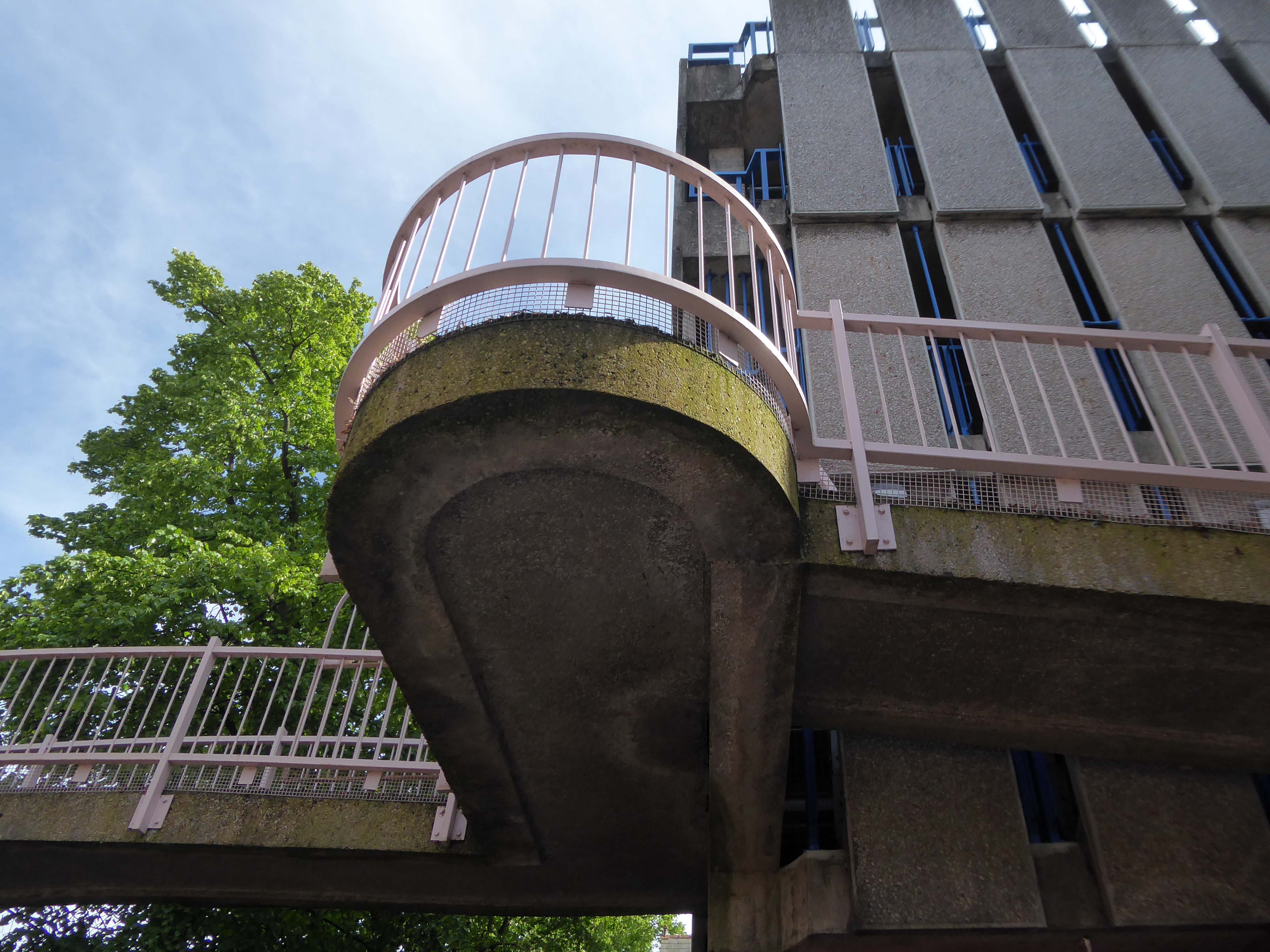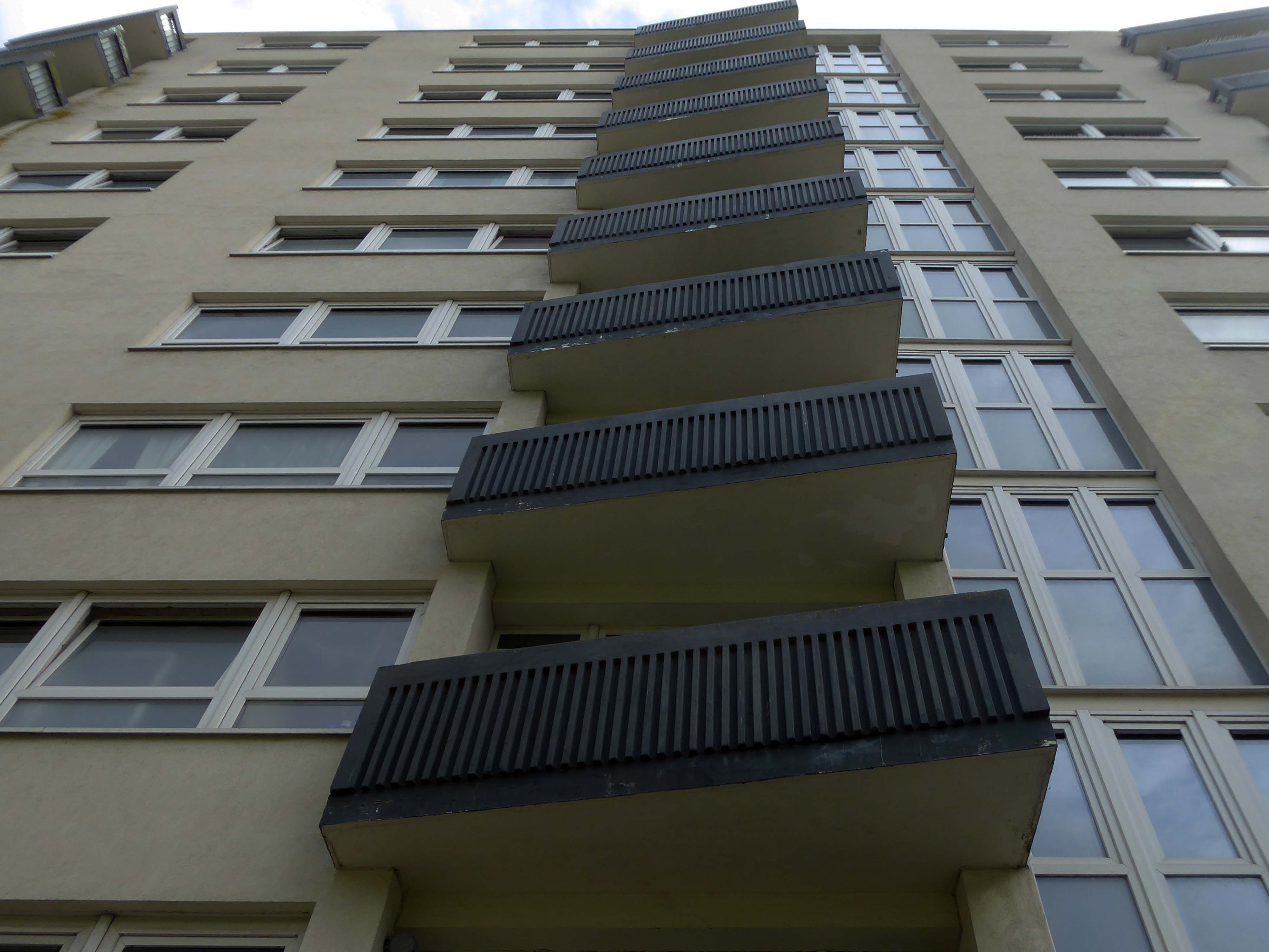 Admirable ribbed concrete angled balconies.