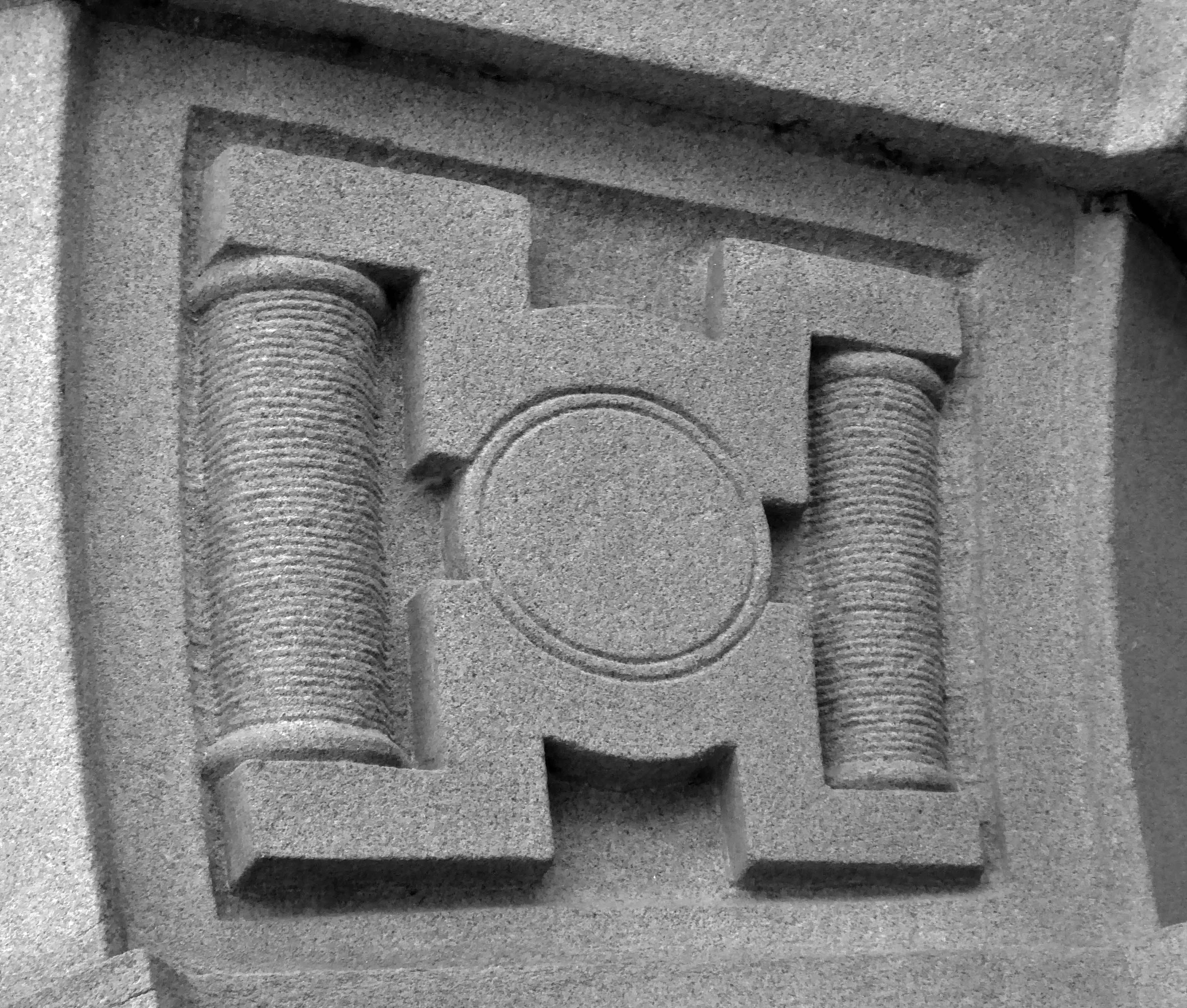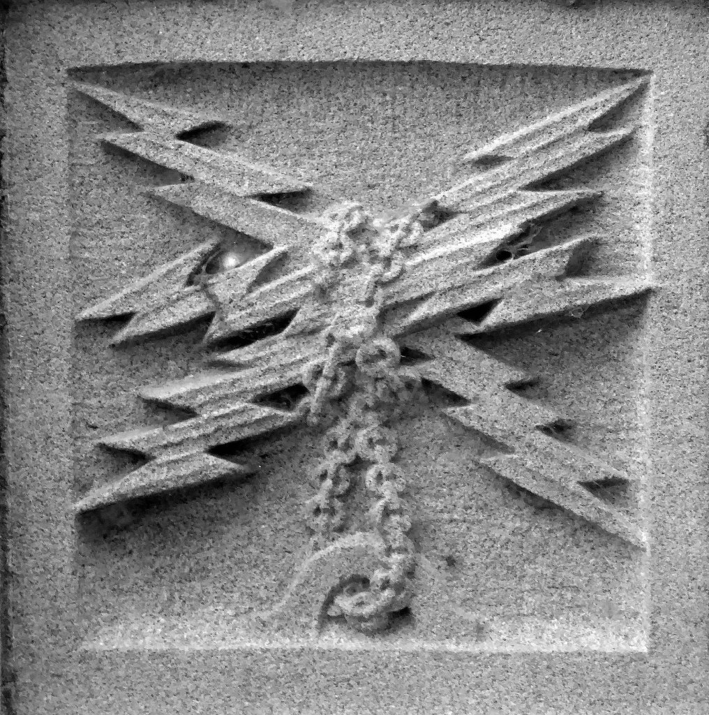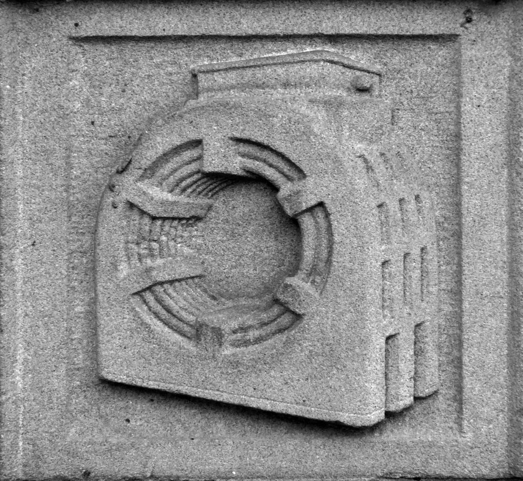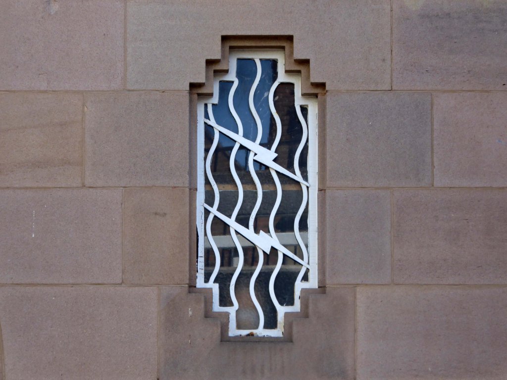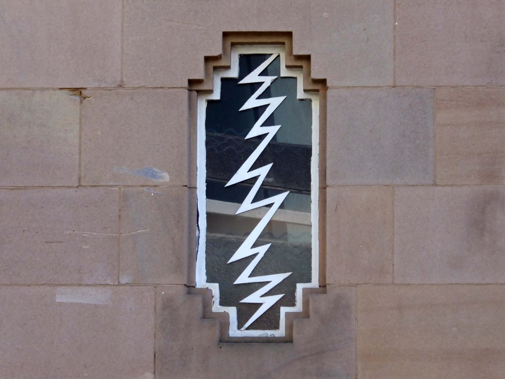 The arch above the entrance is adorned with these carved stone electrical emblems – also rendered in the Futurist Moderne manner.