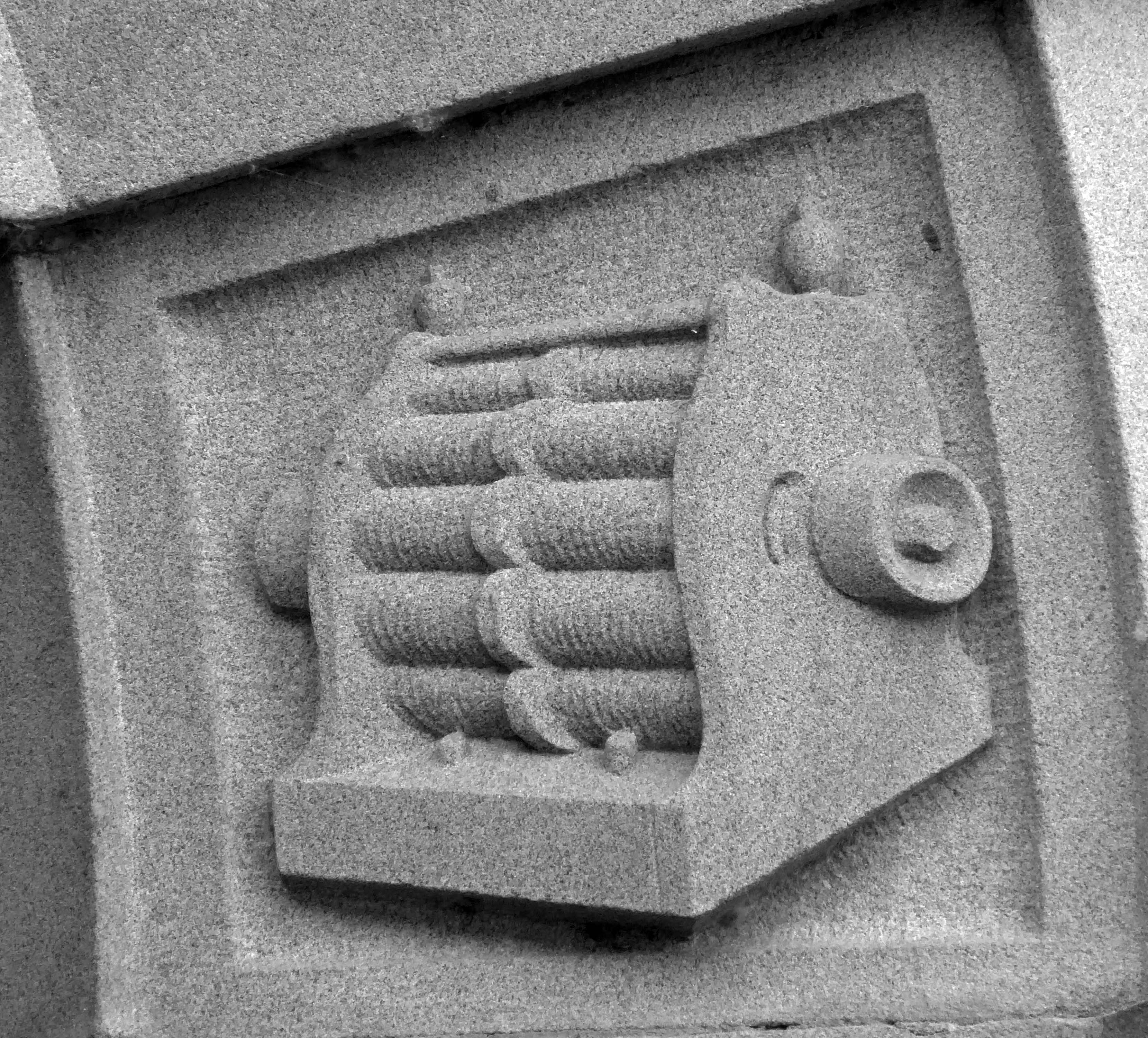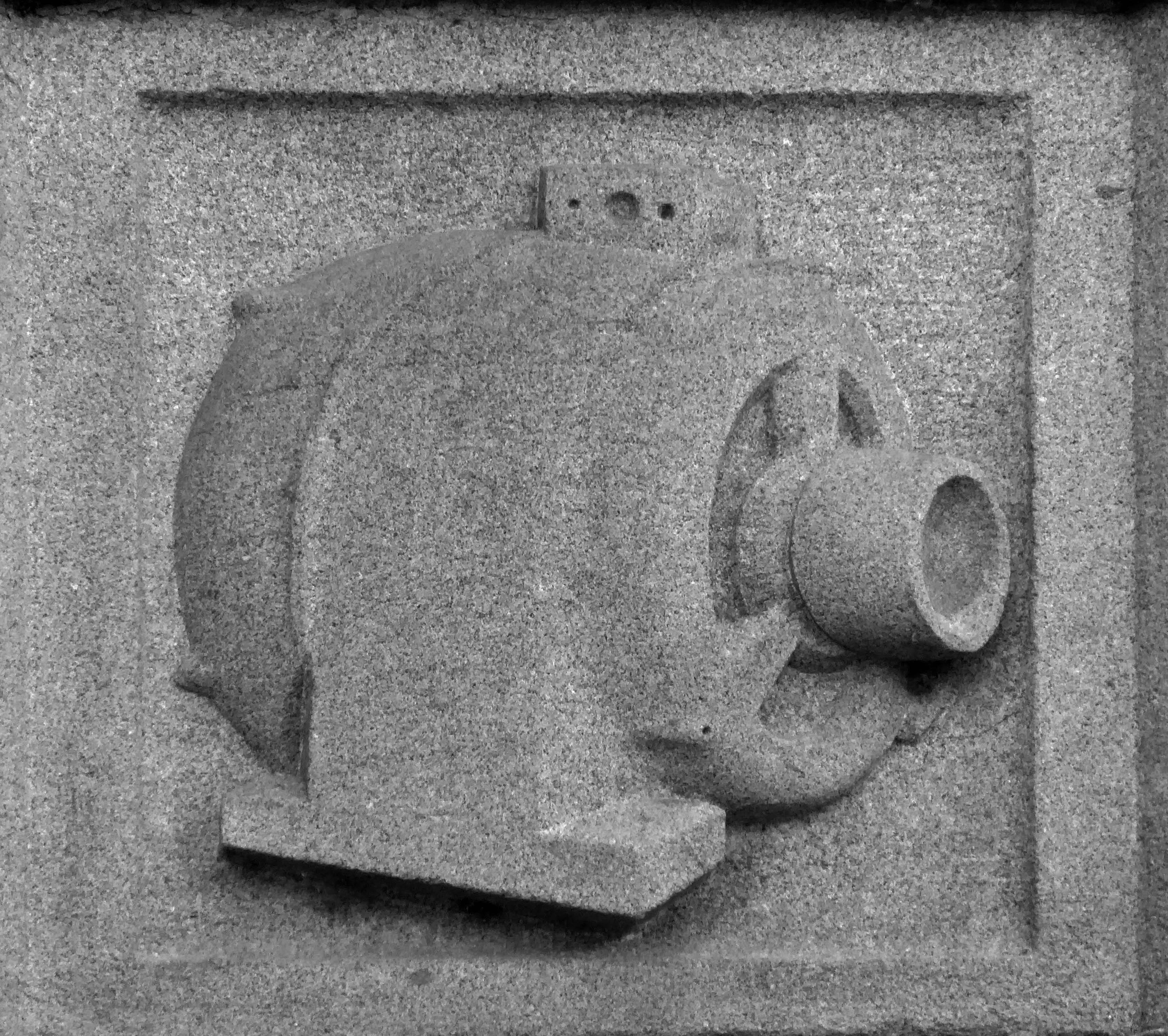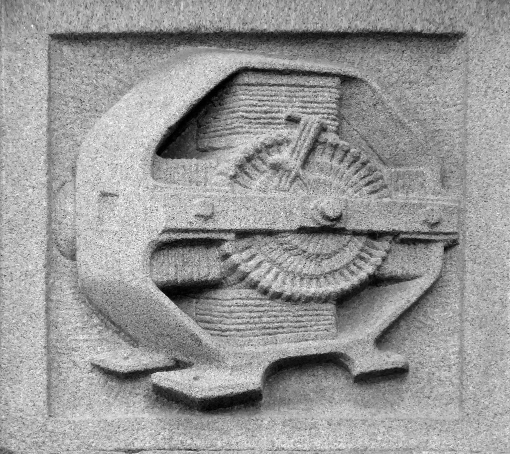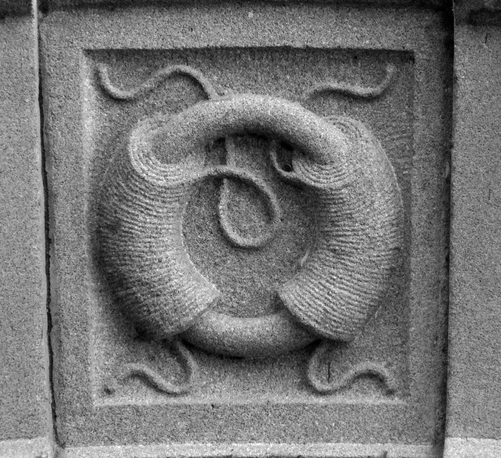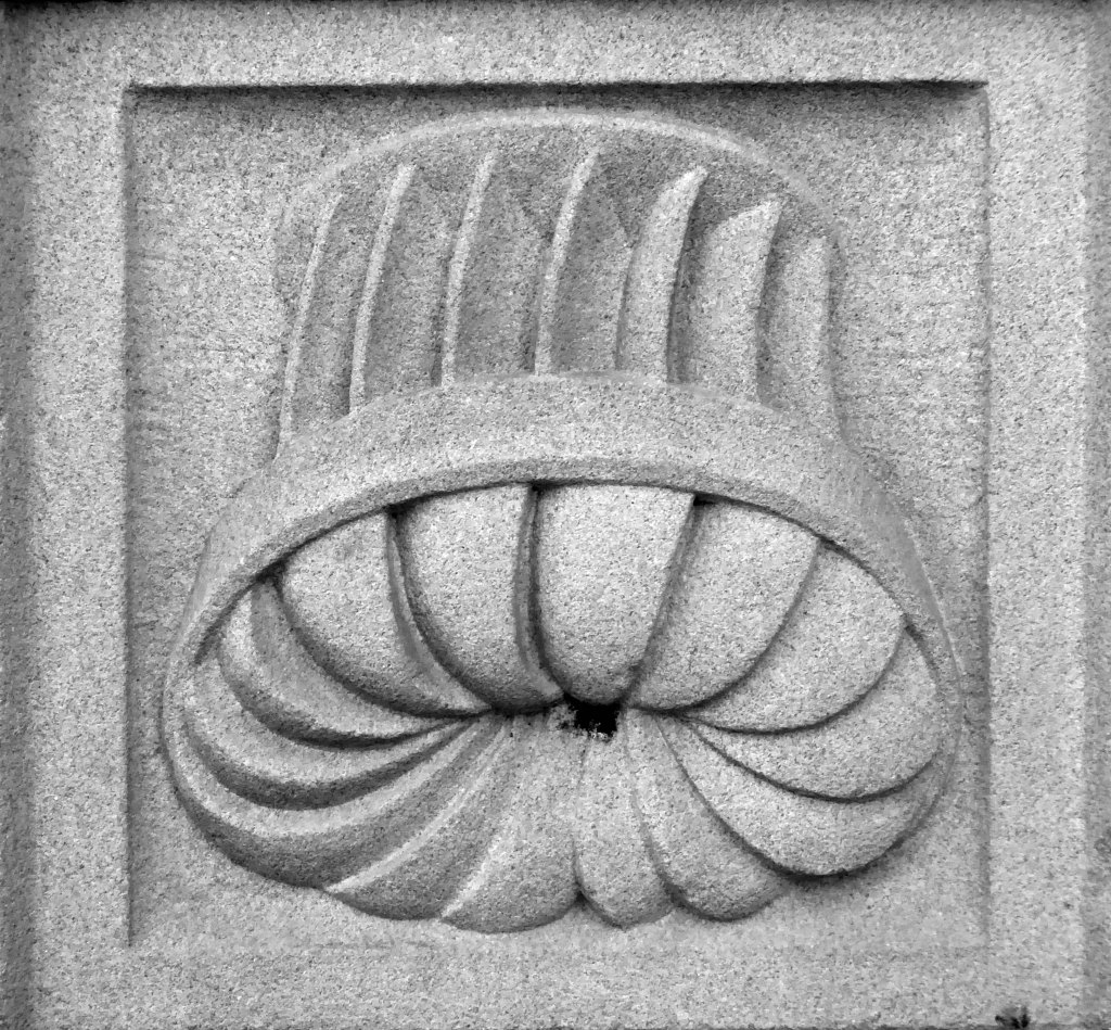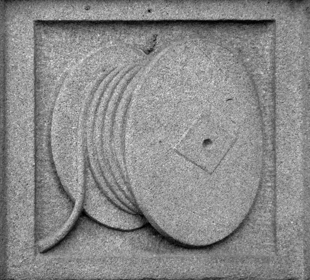 The arch above the entrance is adorned with these carved stone electrical emblems – also rendered in the Futurist Moderne manner.