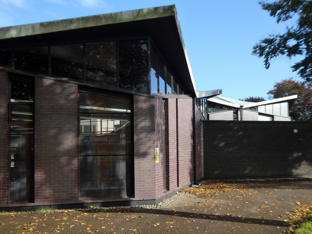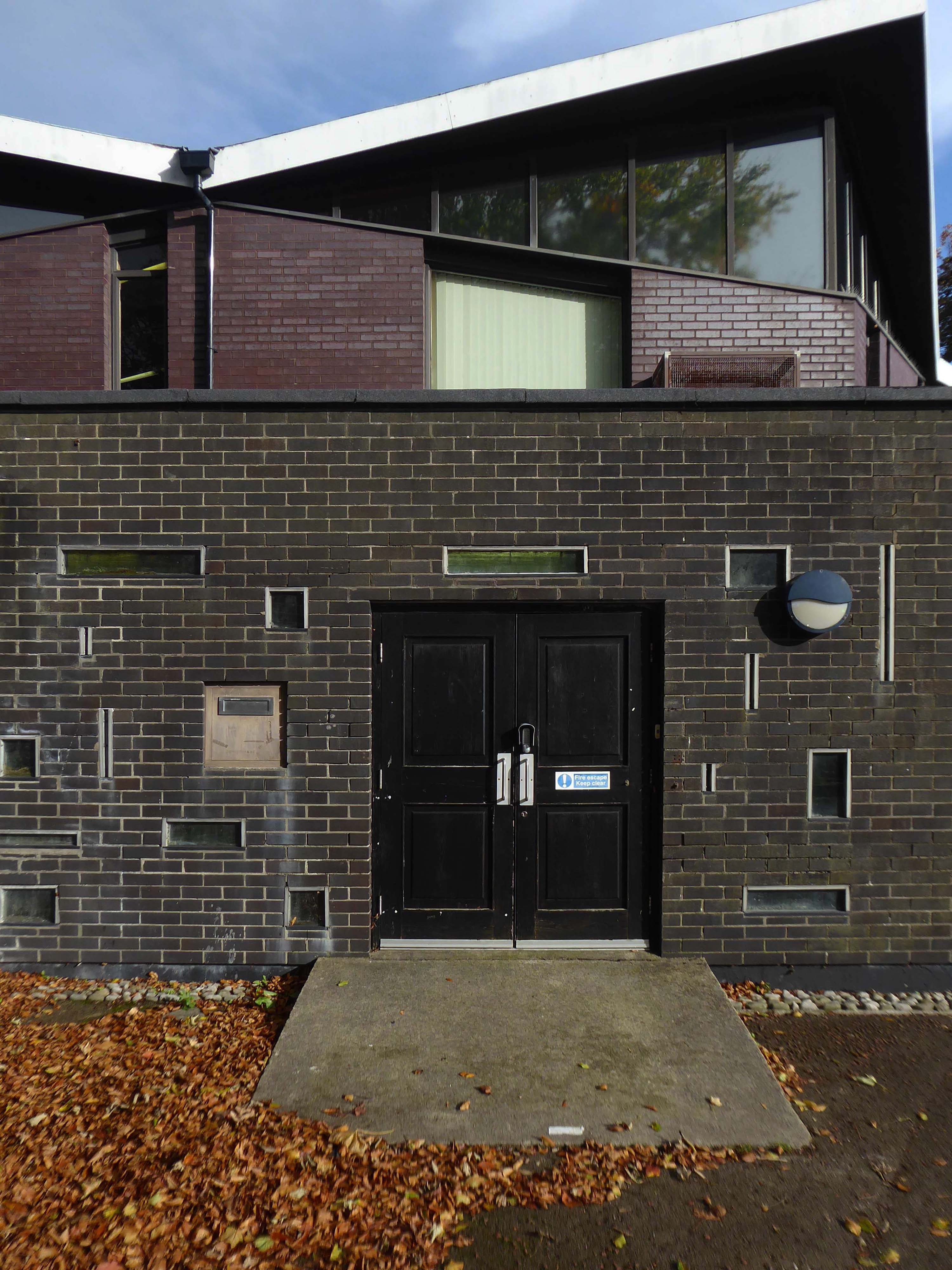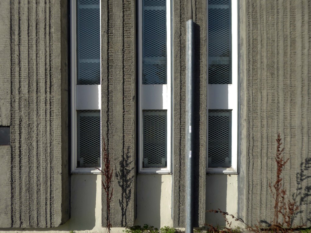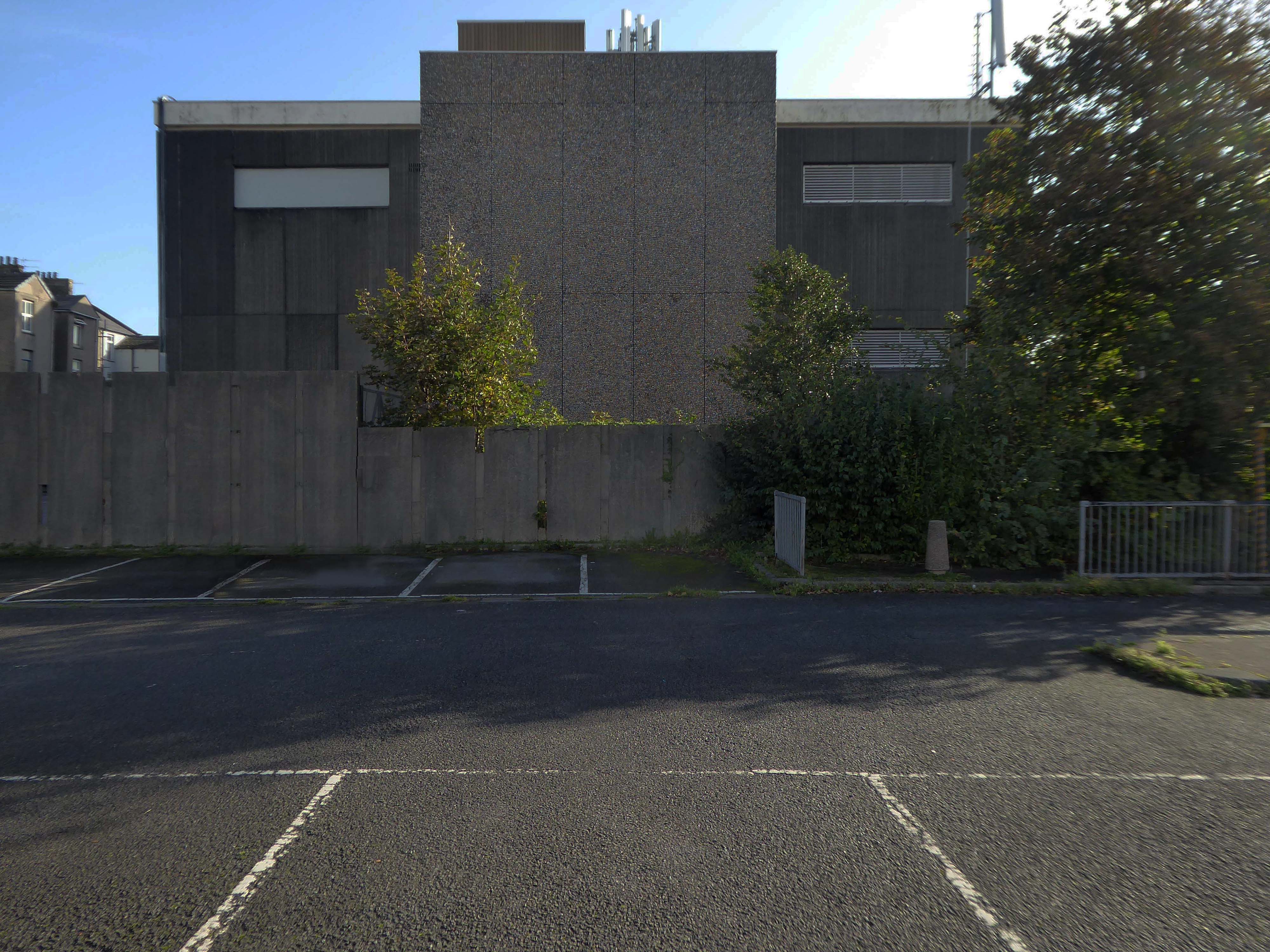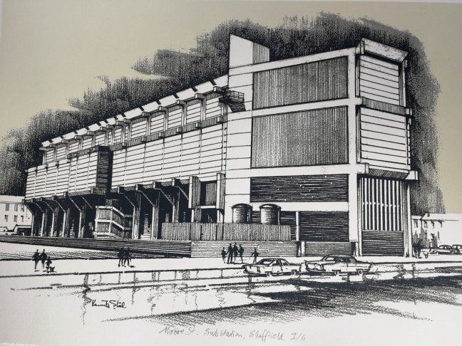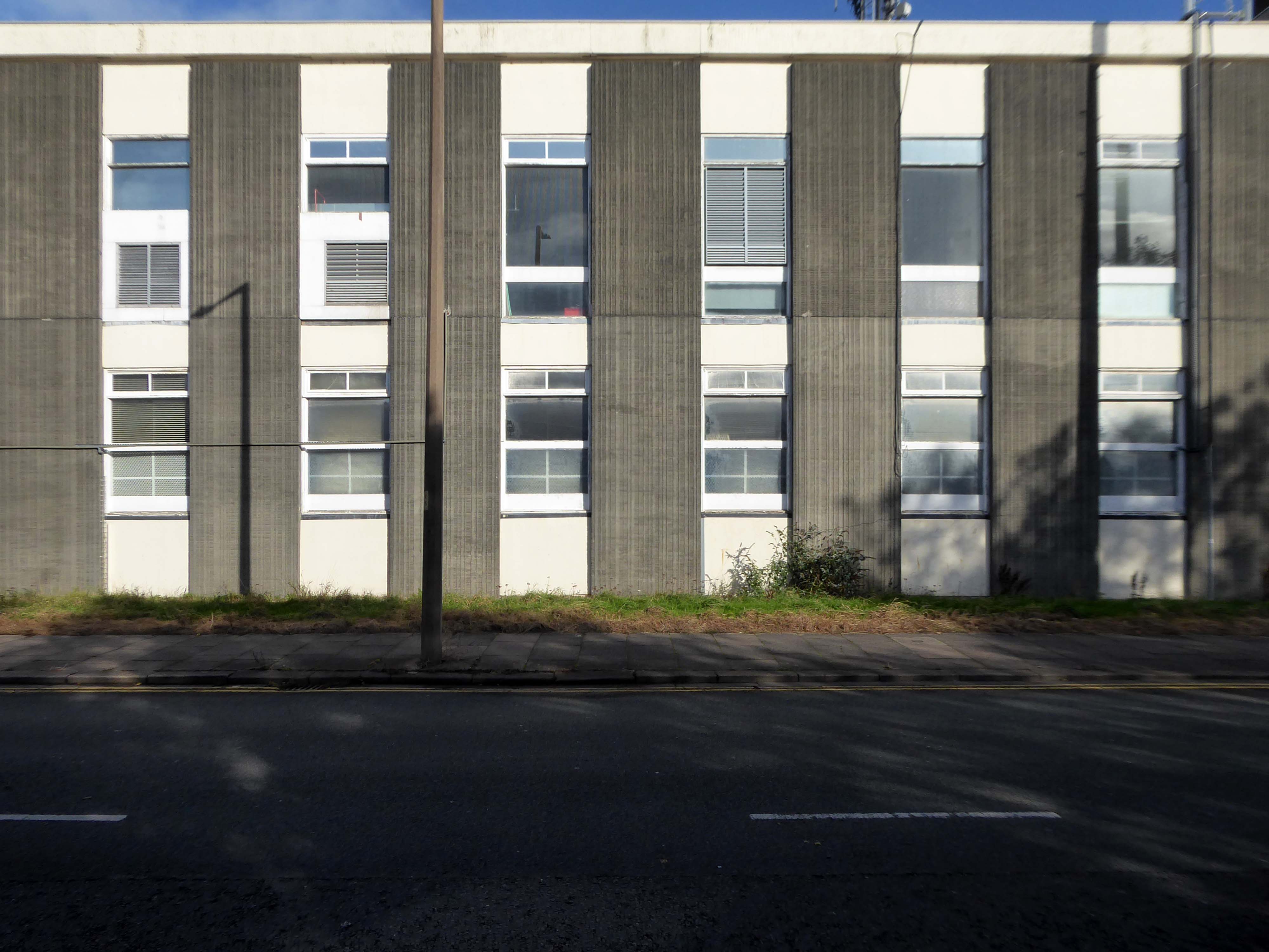 Electricity substation. 1968 to designs by consulting architects Jefferson, Sheard and Partners, Sheffield, led by Bryan Jefferson, in association with the Regional Civil Engineers’ Department of the CEGB North East Region. Contractors, Longden & Sons Ltd, Sheffield. Reinforced concrete frame with board-marked finish with formwork bolt marks, construction and daywork joints emphasised, concrete floor slabs, blue engineering facing bricks, cladding panels of Cornish granite aggregate.