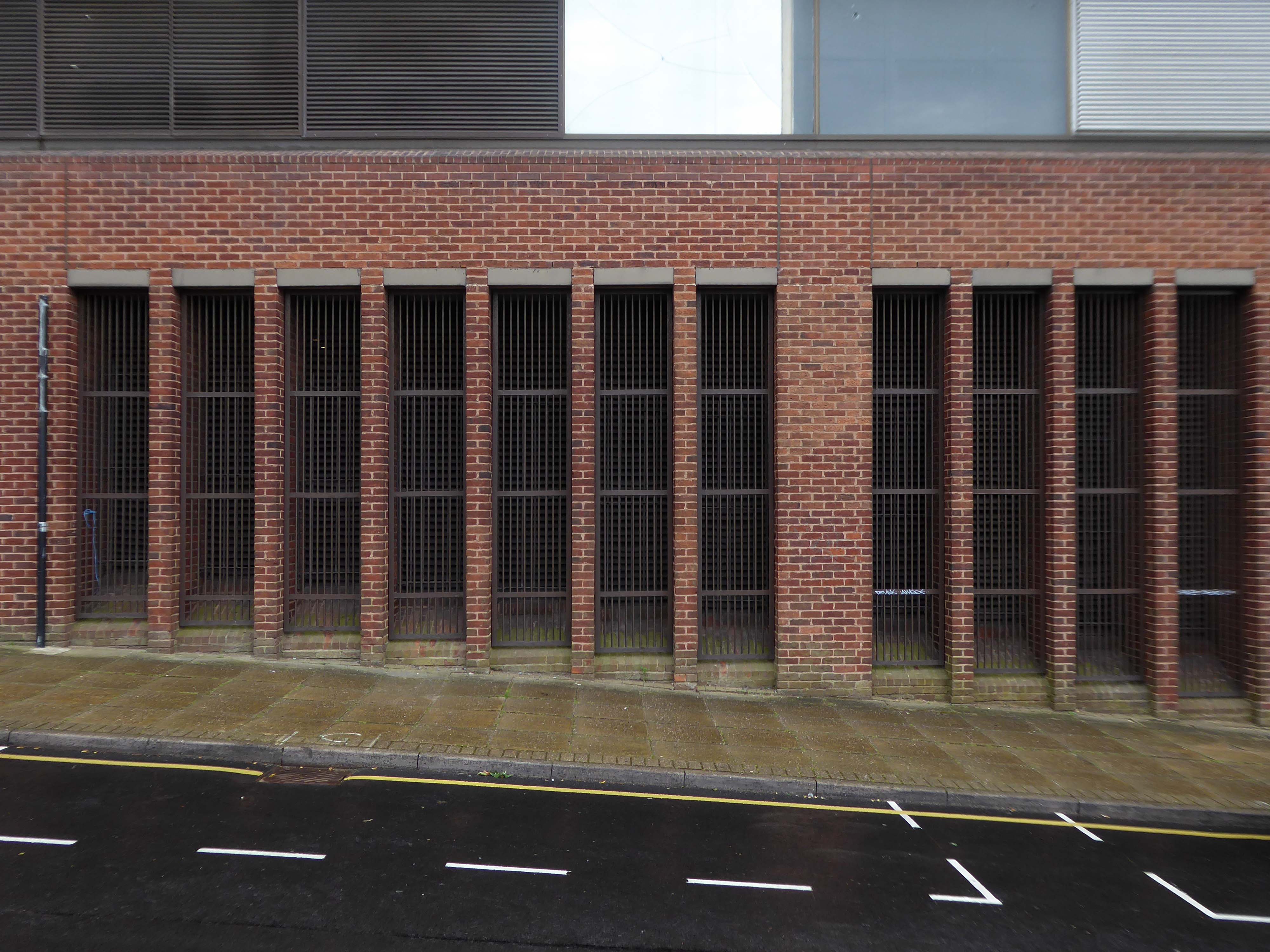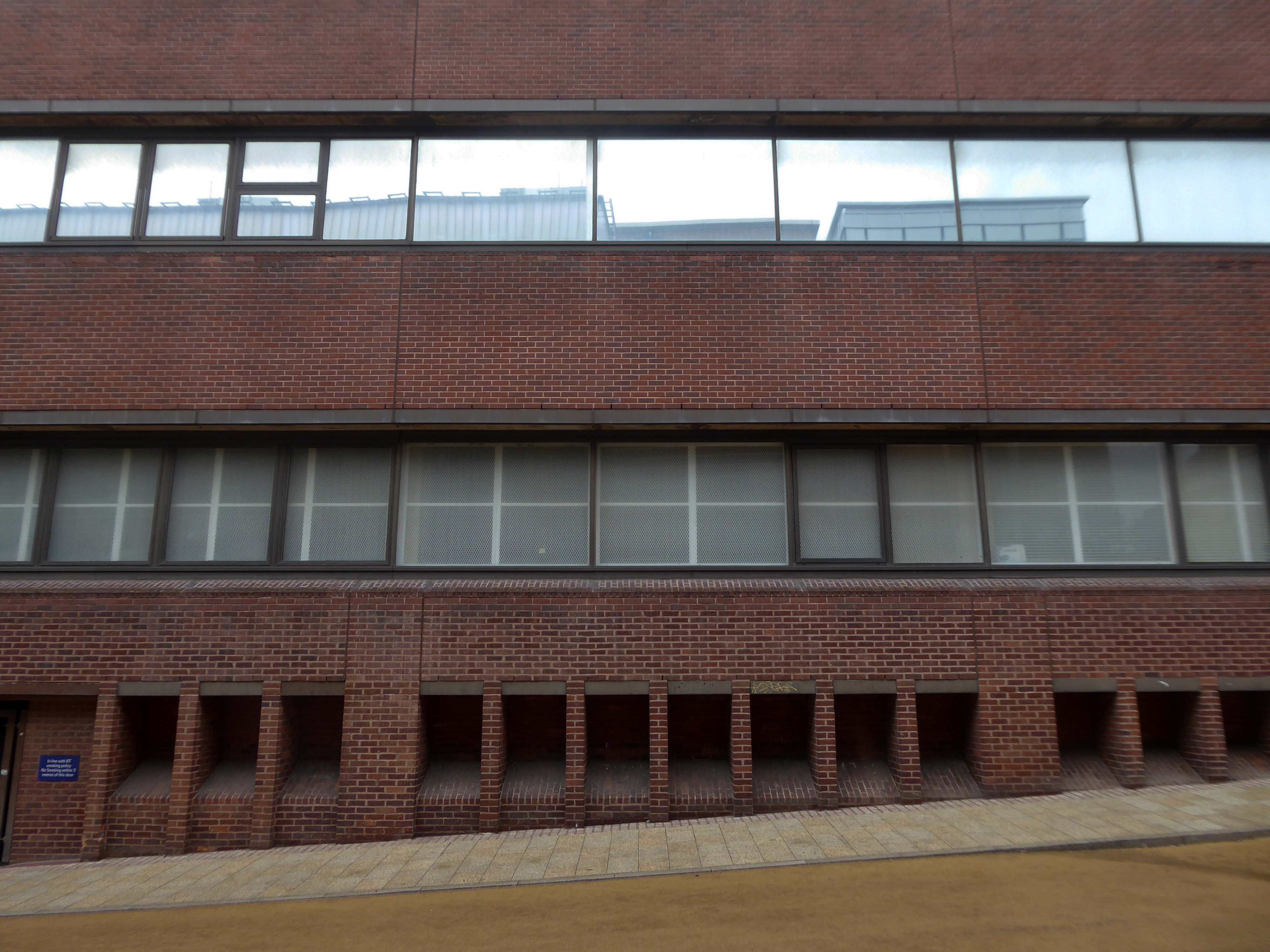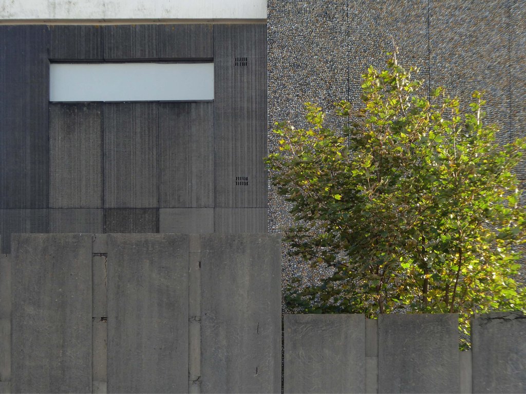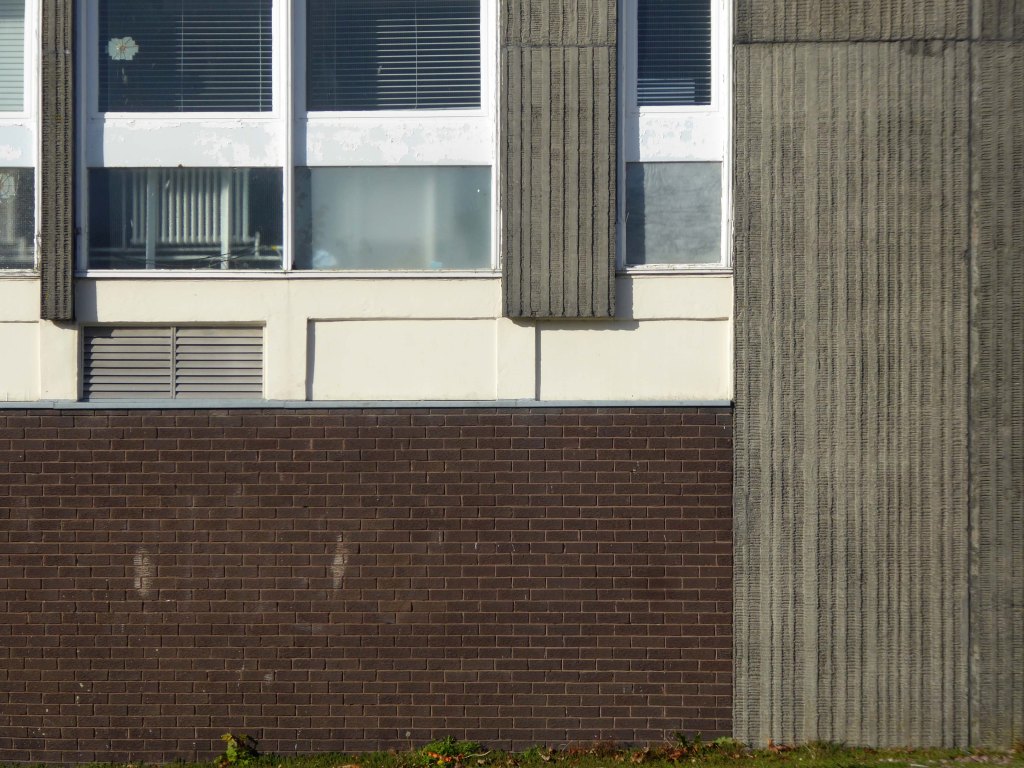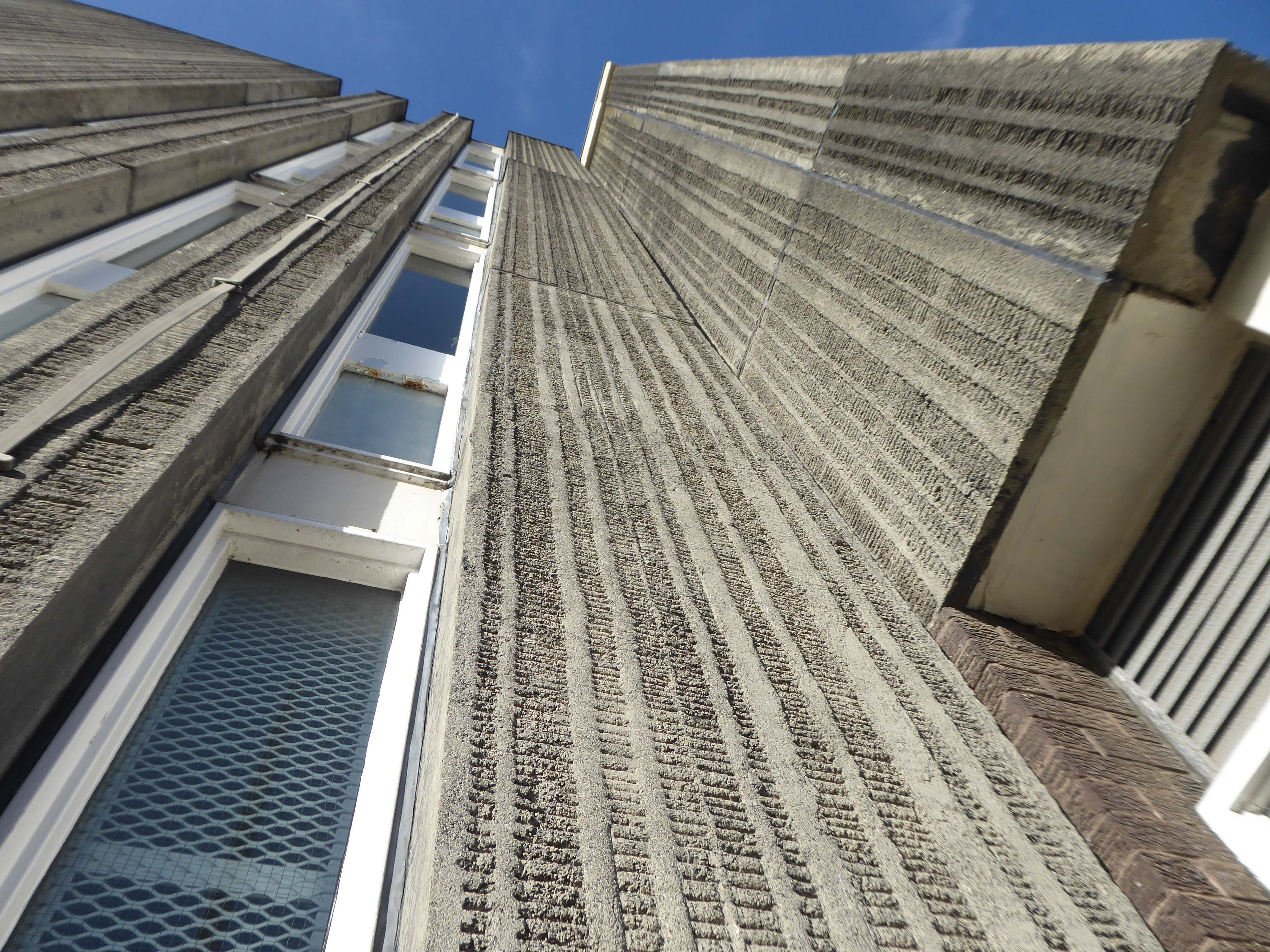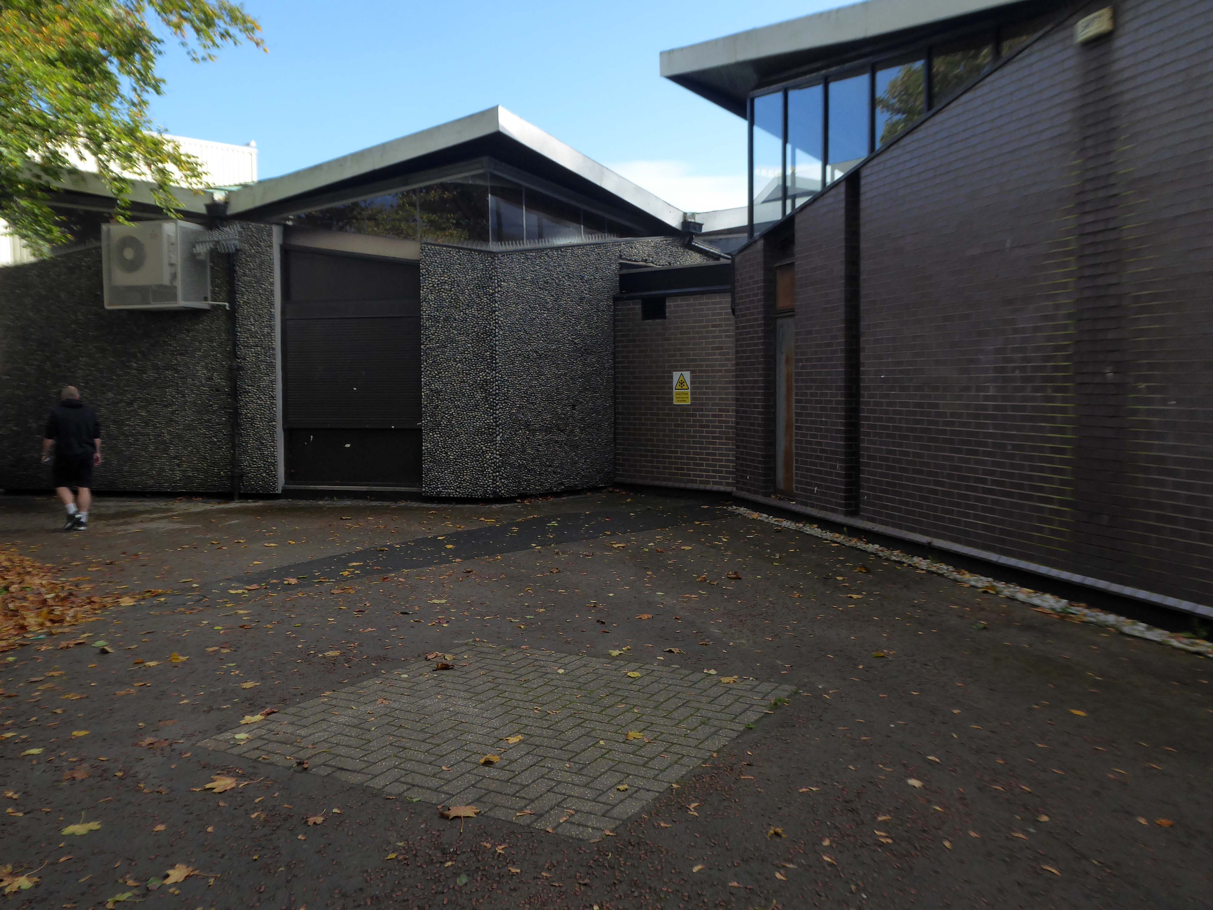 Electricity substation. 1968 to designs by consulting architects Jefferson, Sheard and Partners, Sheffield, led by Bryan Jefferson, in association with the Regional Civil Engineers’ Department of the CEGB North East Region. Contractors, Longden & Sons Ltd, Sheffield. Reinforced concrete frame with board-marked finish with formwork bolt marks, construction and daywork joints emphasised, concrete floor slabs, blue engineering facing bricks, cladding panels of Cornish granite aggregate.