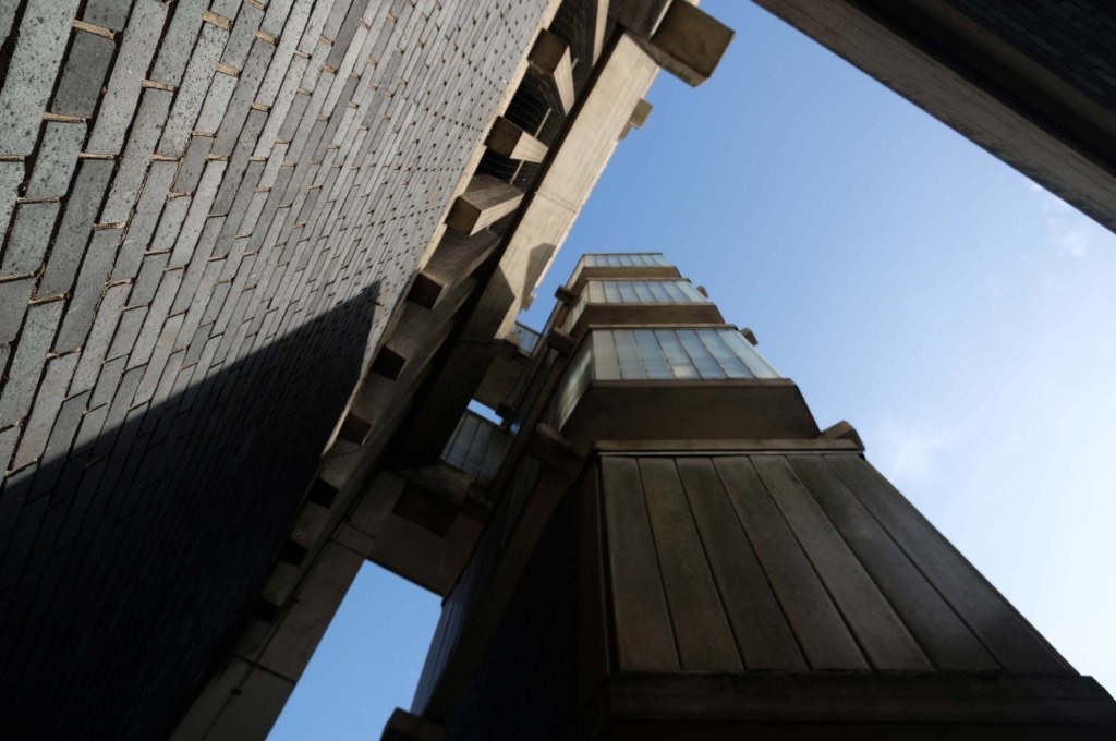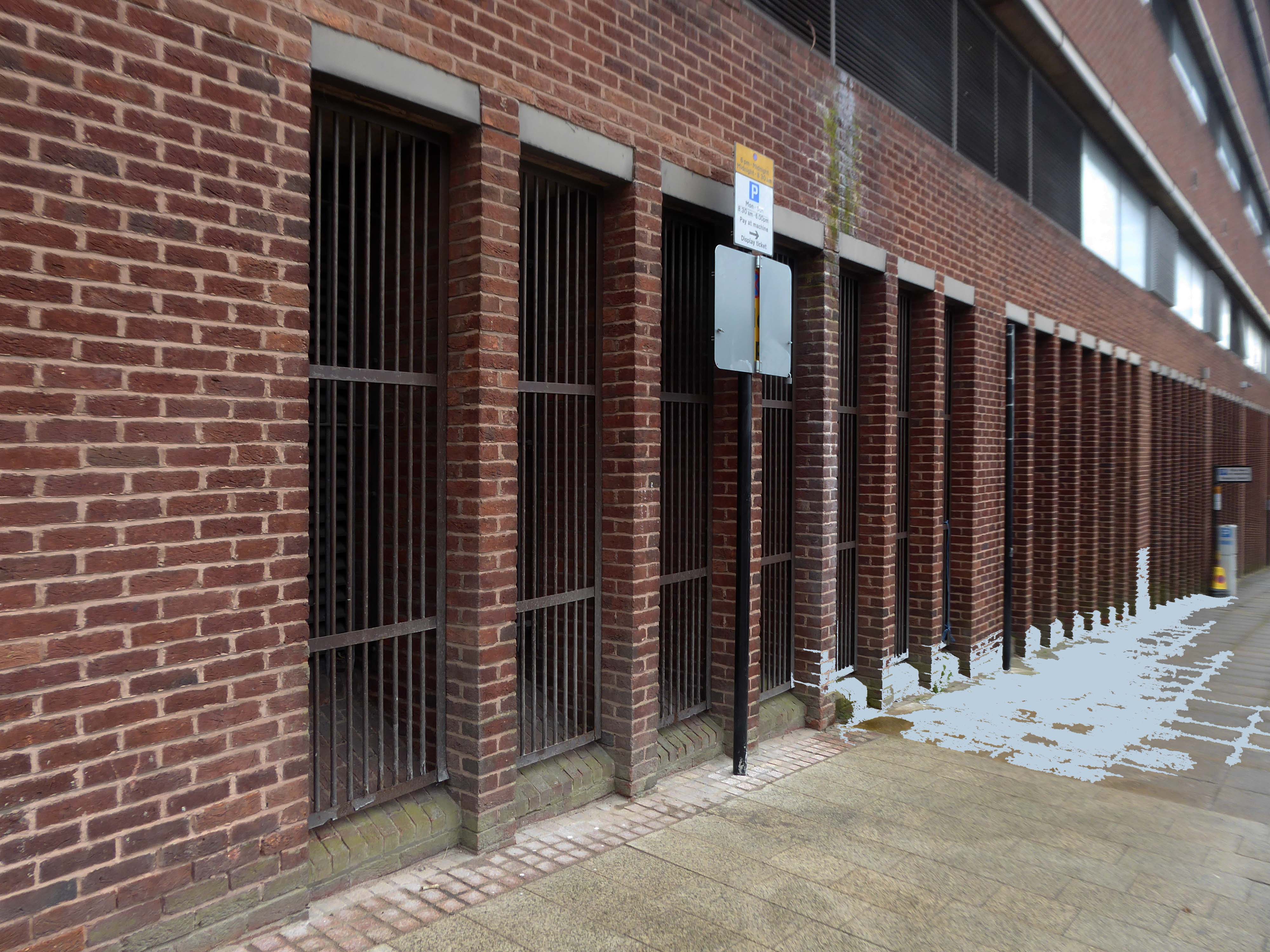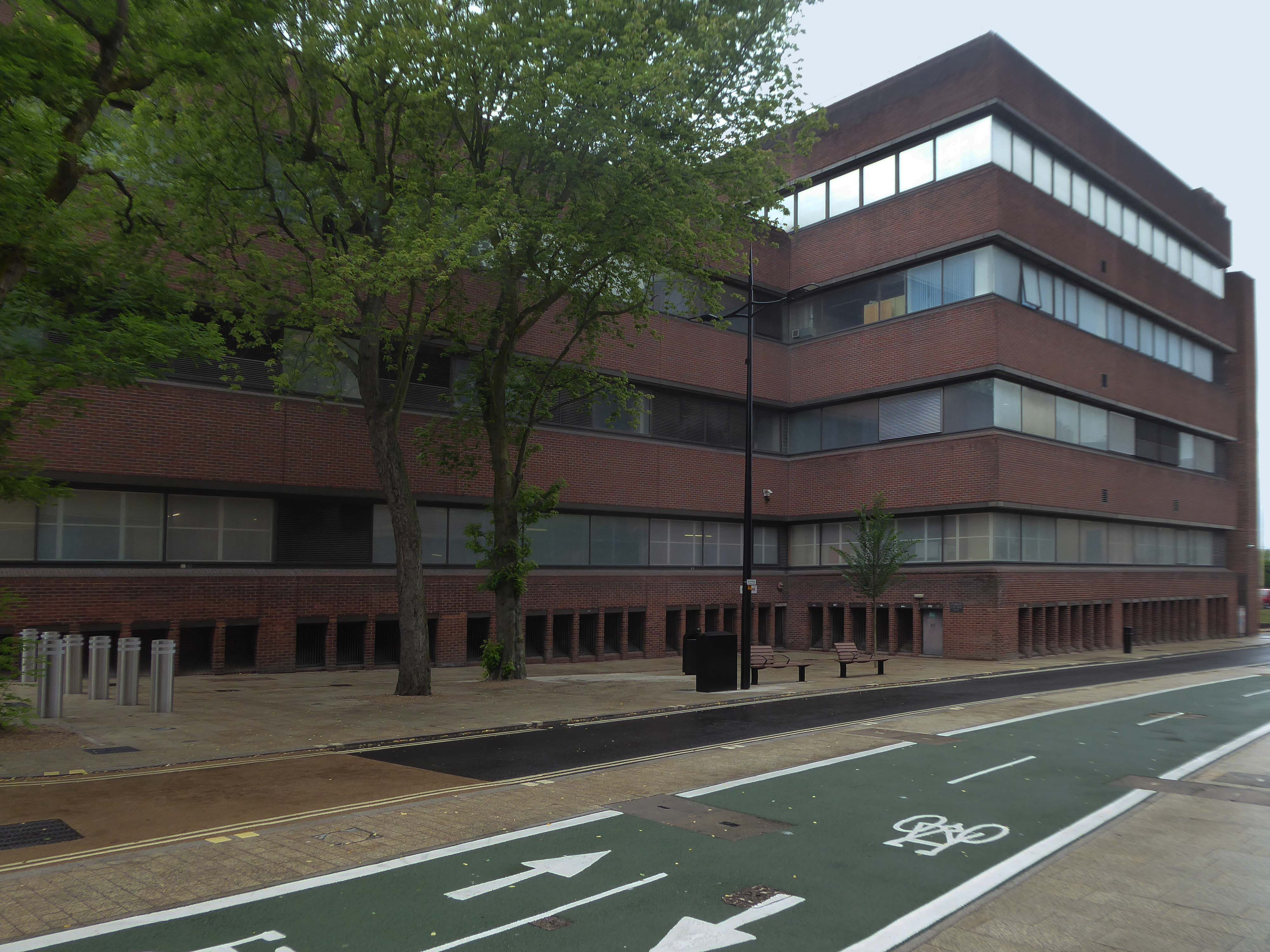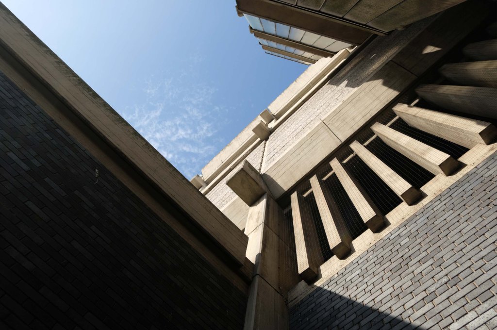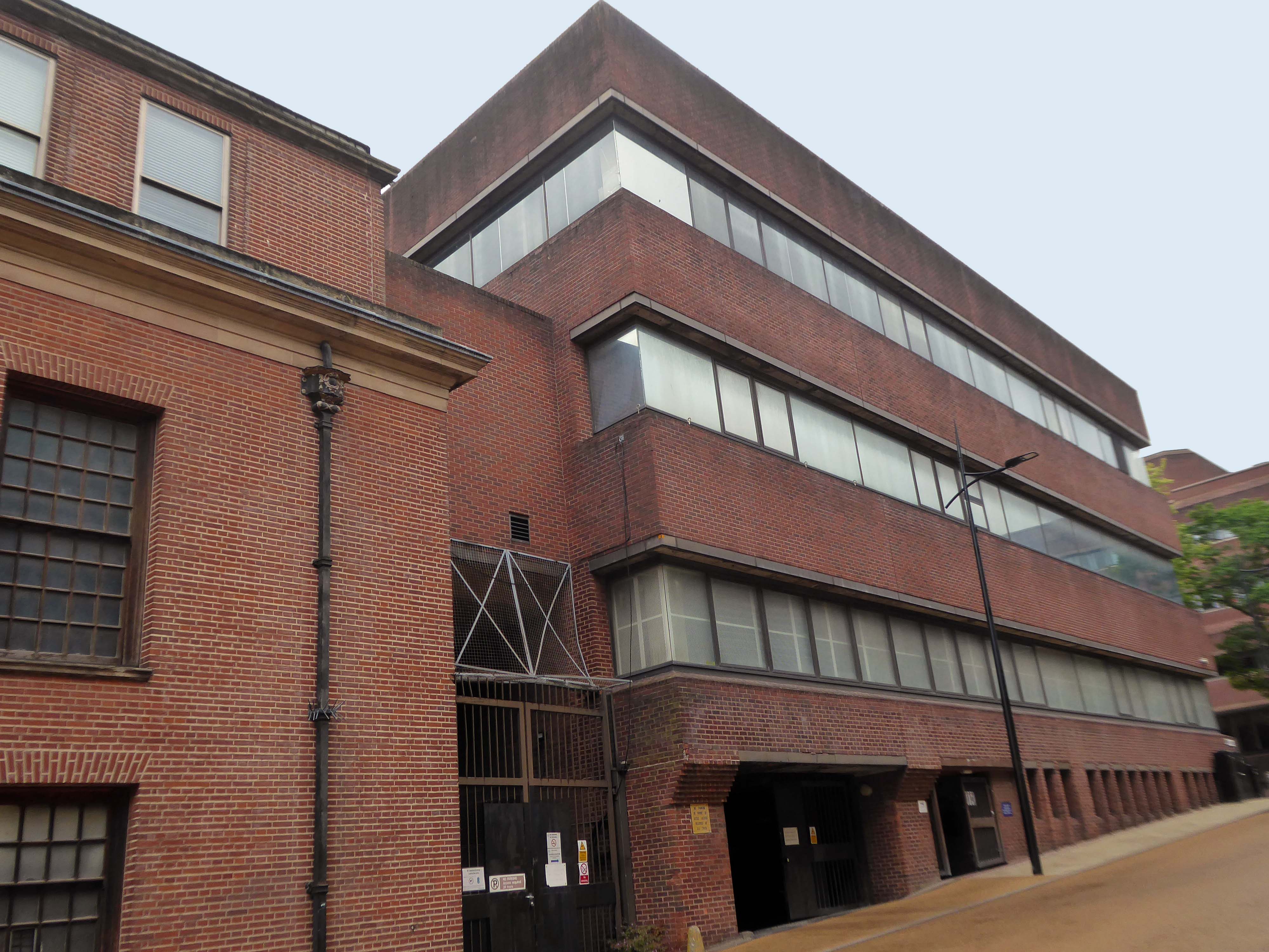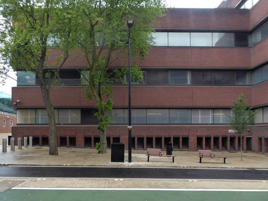 Electricity substation. 1968 to designs by consulting architects Jefferson, Sheard and Partners, Sheffield, led by Bryan Jefferson, in association with the Regional Civil Engineers’ Department of the CEGB North East Region. Contractors, Longden & Sons Ltd, Sheffield. Reinforced concrete frame with board-marked finish with formwork bolt marks, construction and daywork joints emphasised, concrete floor slabs, blue engineering facing bricks, cladding panels of Cornish granite aggregate.
