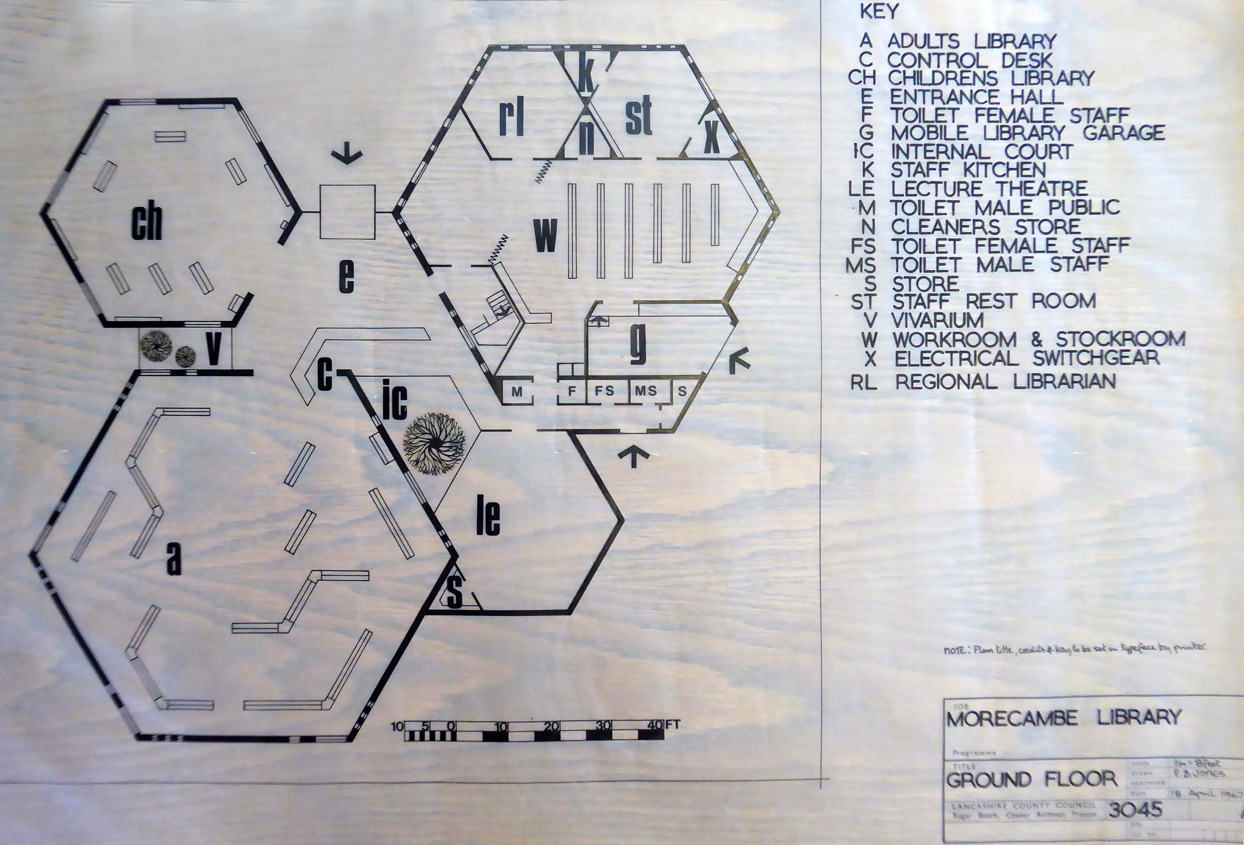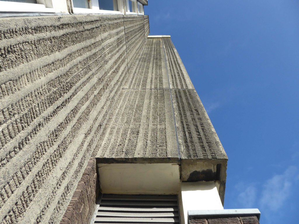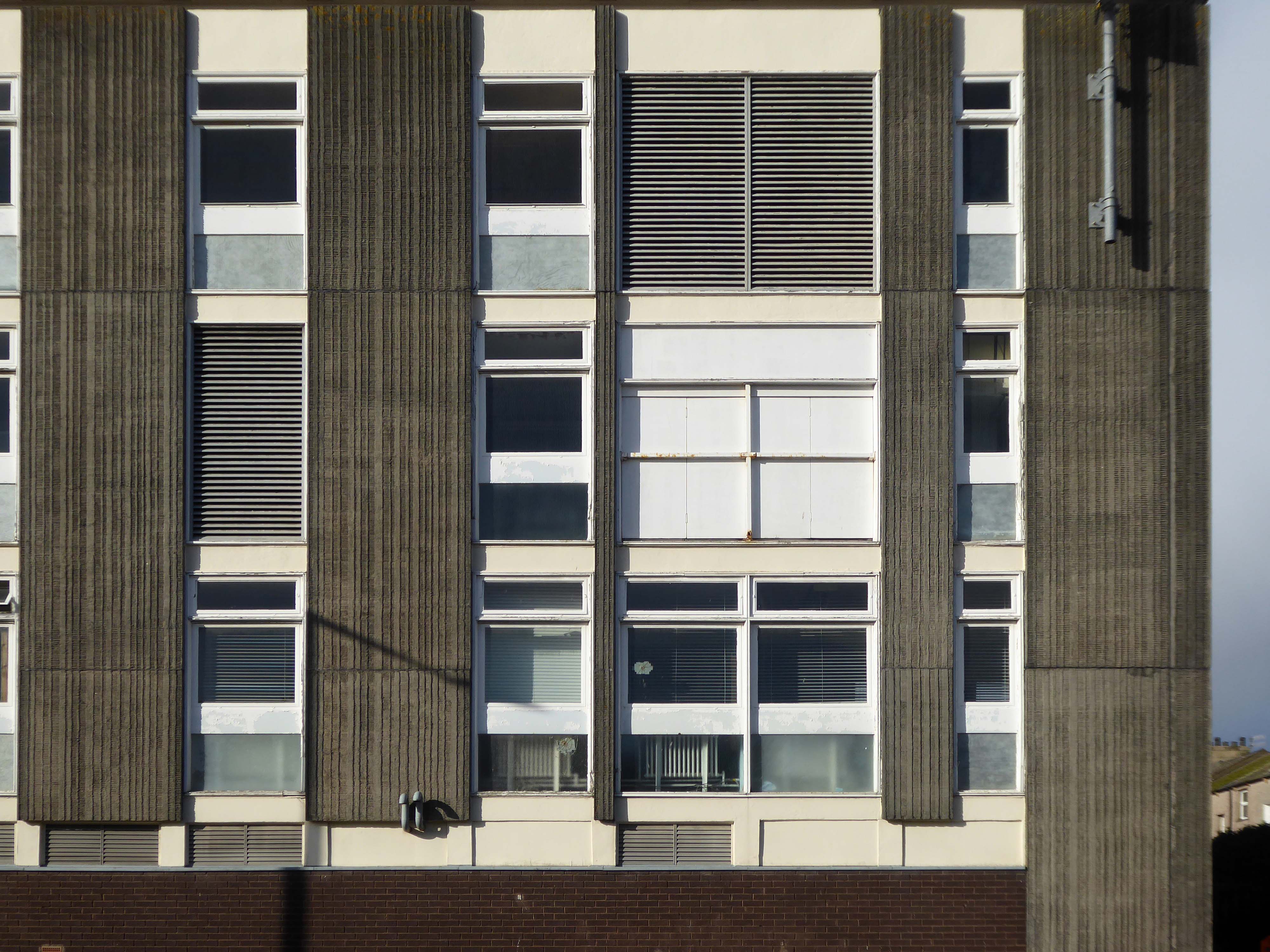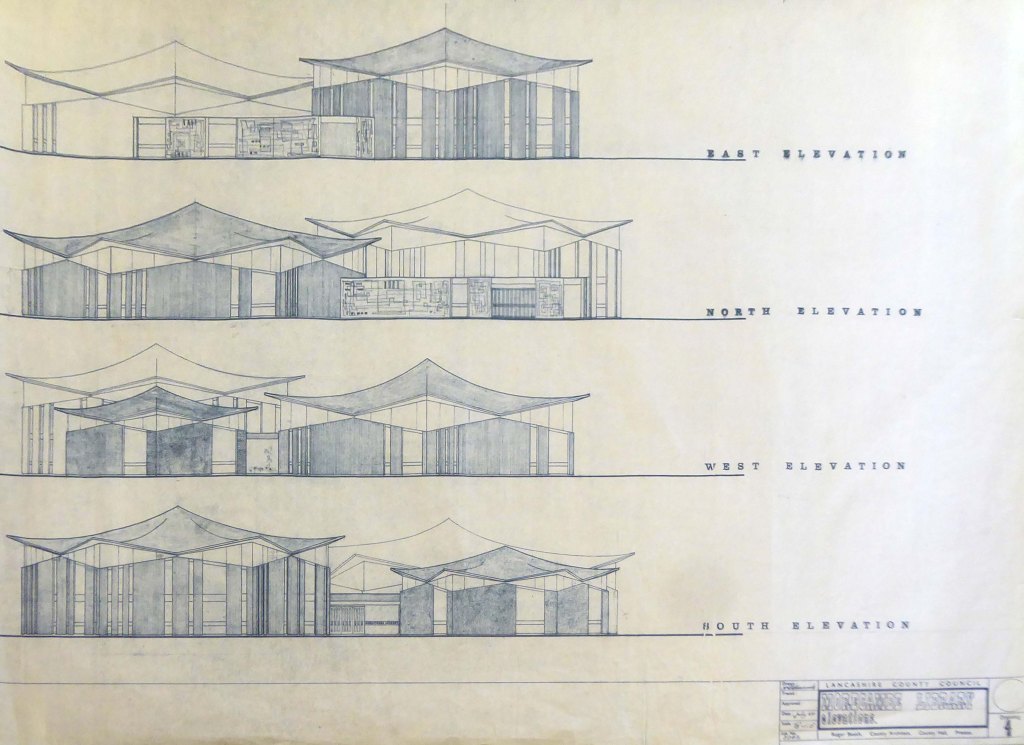 Drawings of the original building are dated around 1937 and are simply signed by the Ministry of Works, Preston. Drawings of a small extension dated 1961 are signed by HG Swann at the Ministry of of Works. However – the drawings dated 1970 seem to be the ones of interest. I found elevations detailing the various textured cladding panels, signed by Senior Architect LC Stuart, Job Architect BJ Burroughs and drawn by RJW, Ministry of Public Building and Works at Prince Consort House, London.