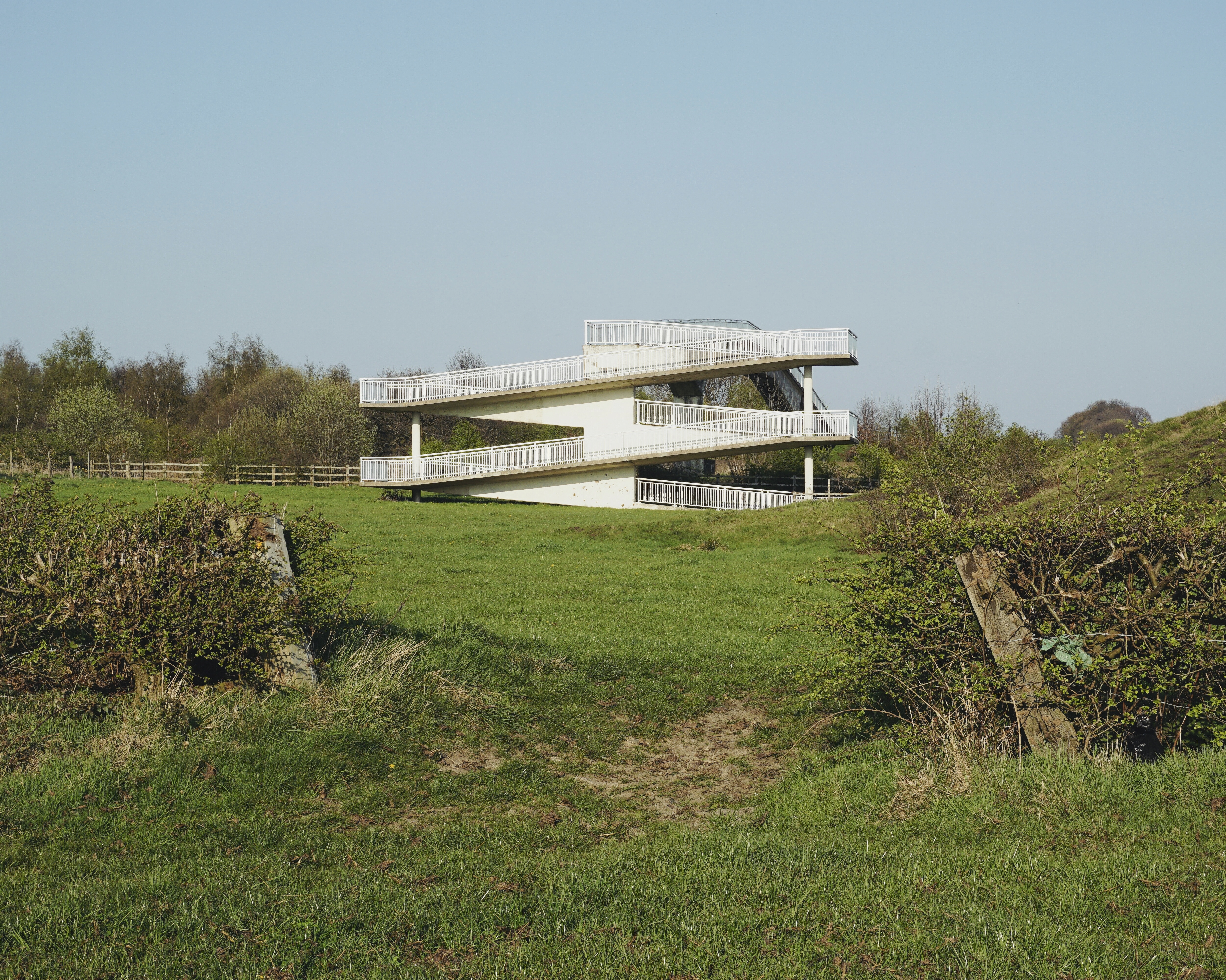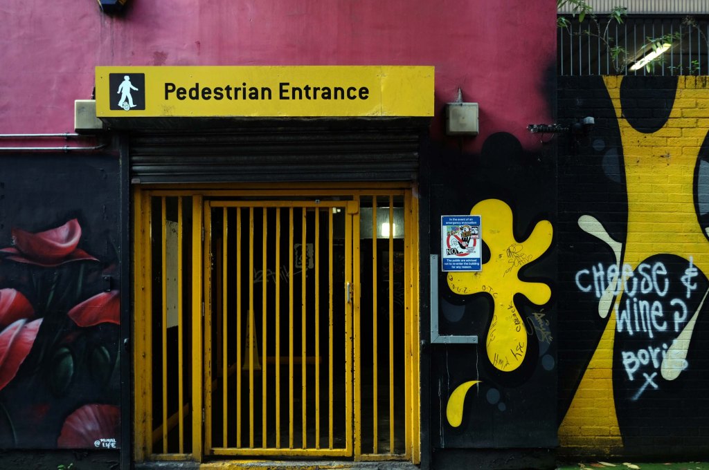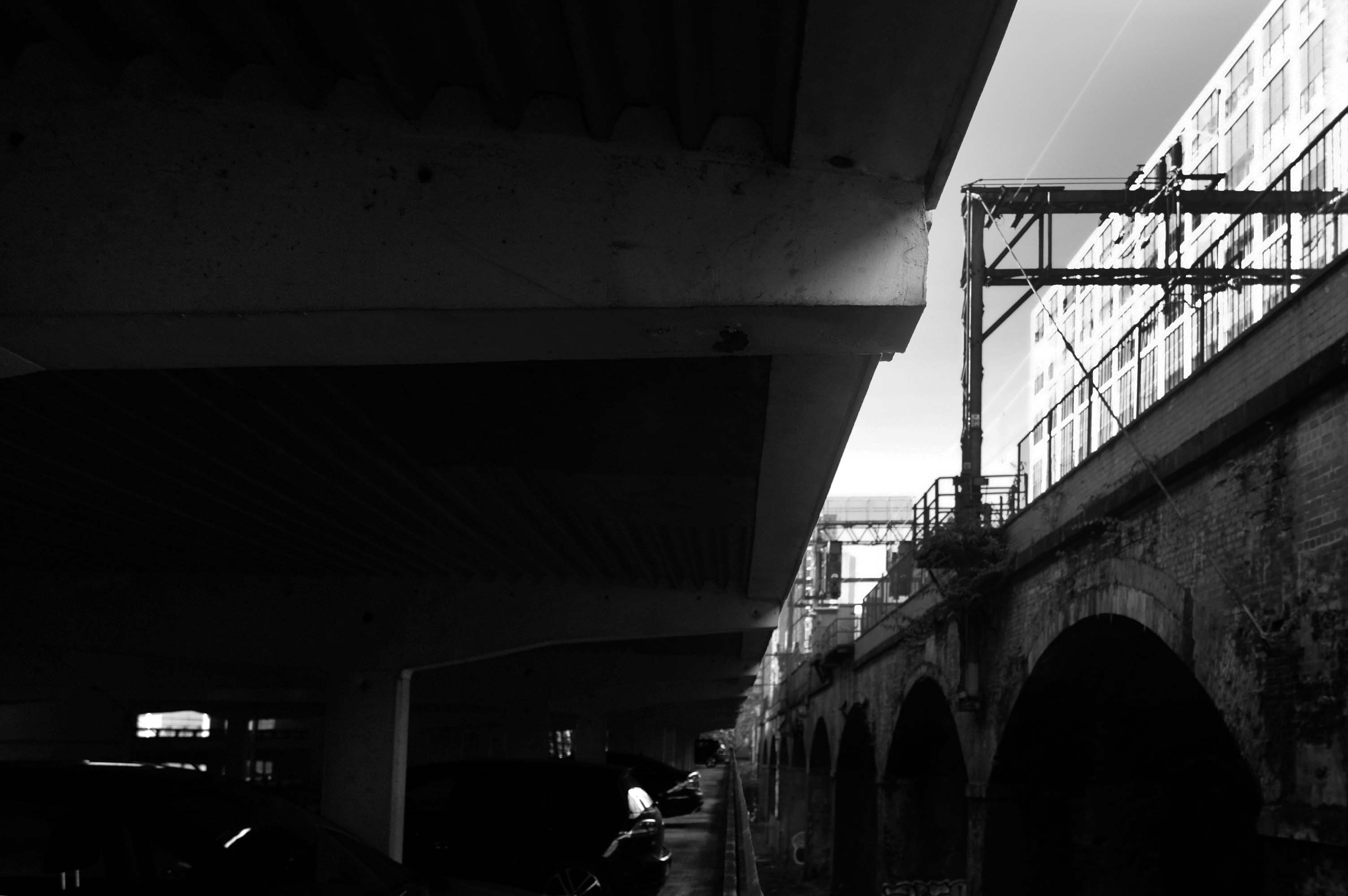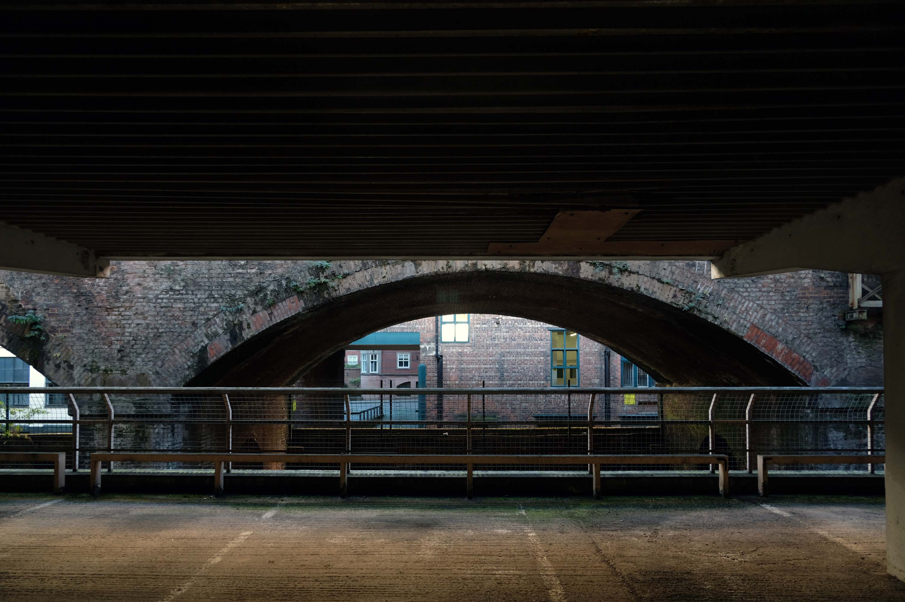 The pedestrian in a car park ventures beyond the train station, across a bridge and through a portal to another dimension.