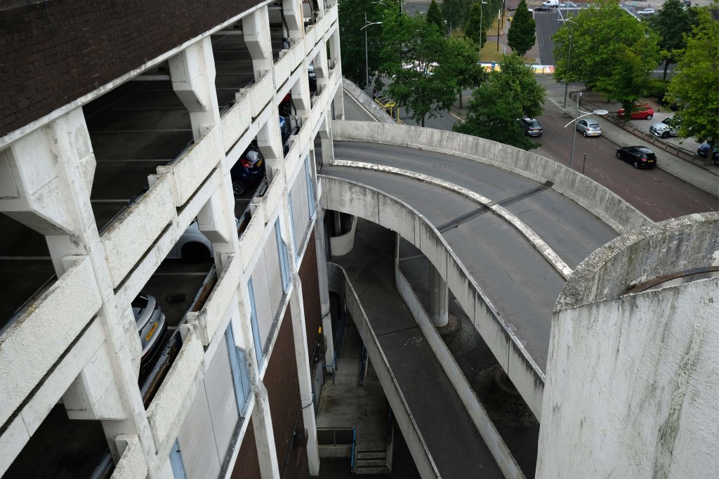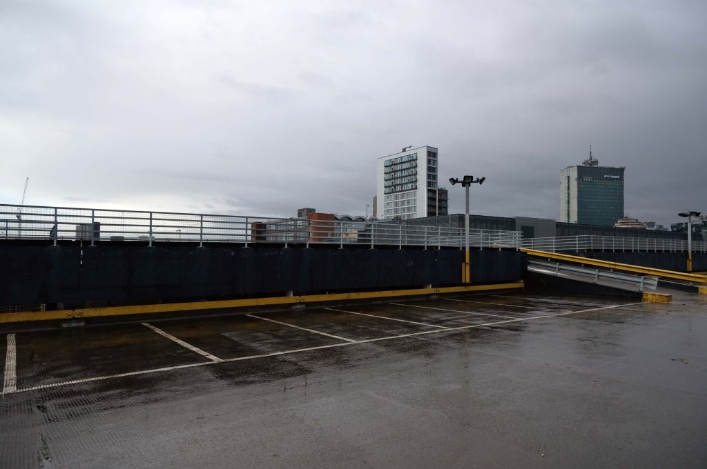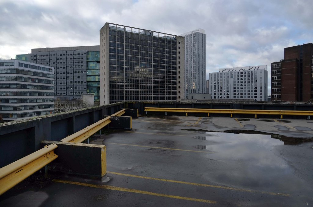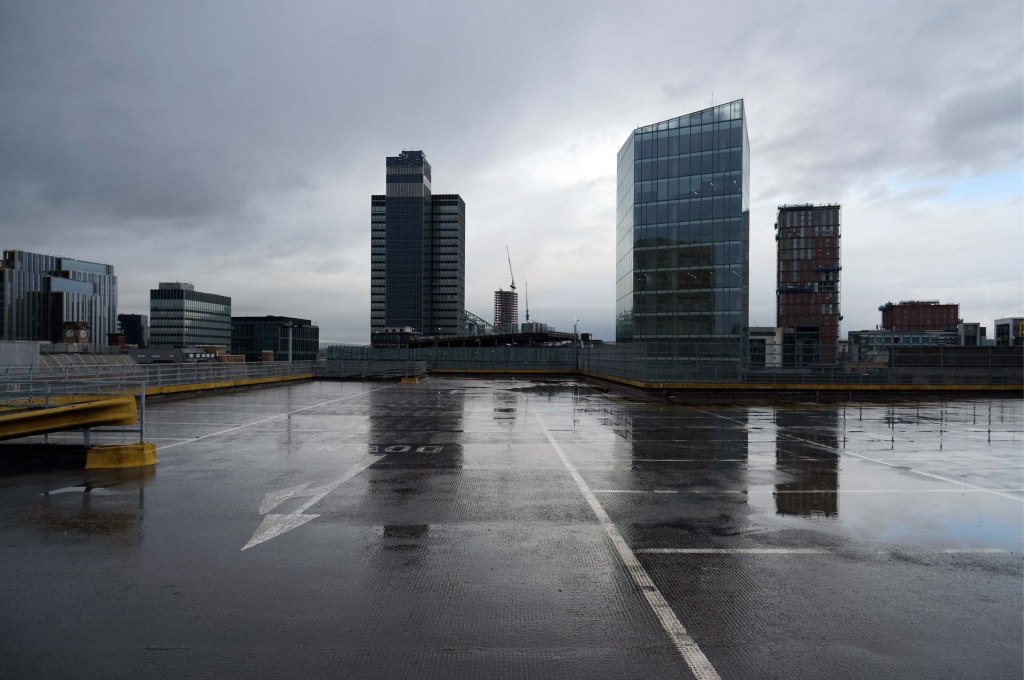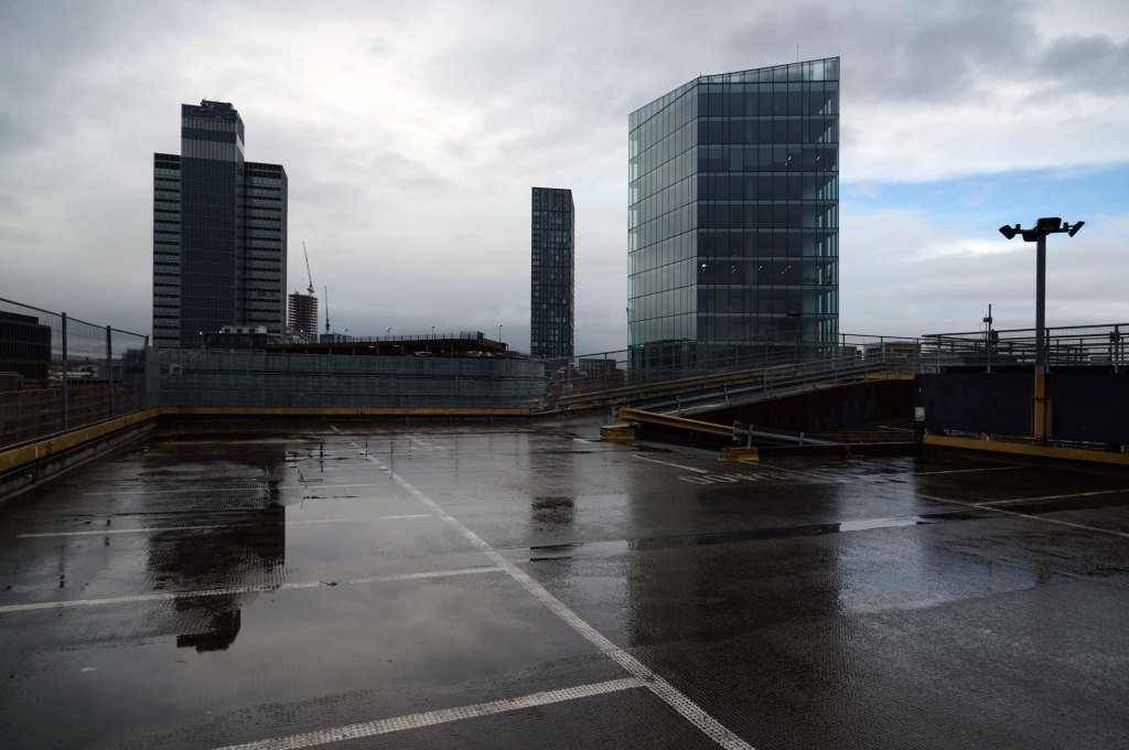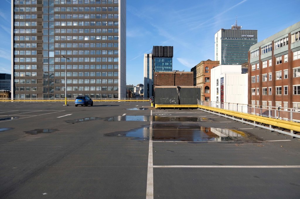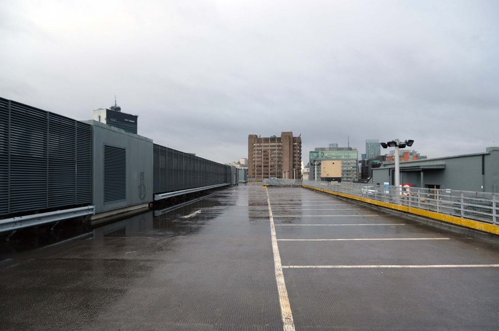 The pedestrian in a car park ventures forth into a part of town rarely visited, discovering a clean and modern environment, affording extensive views over an ever expanding city.