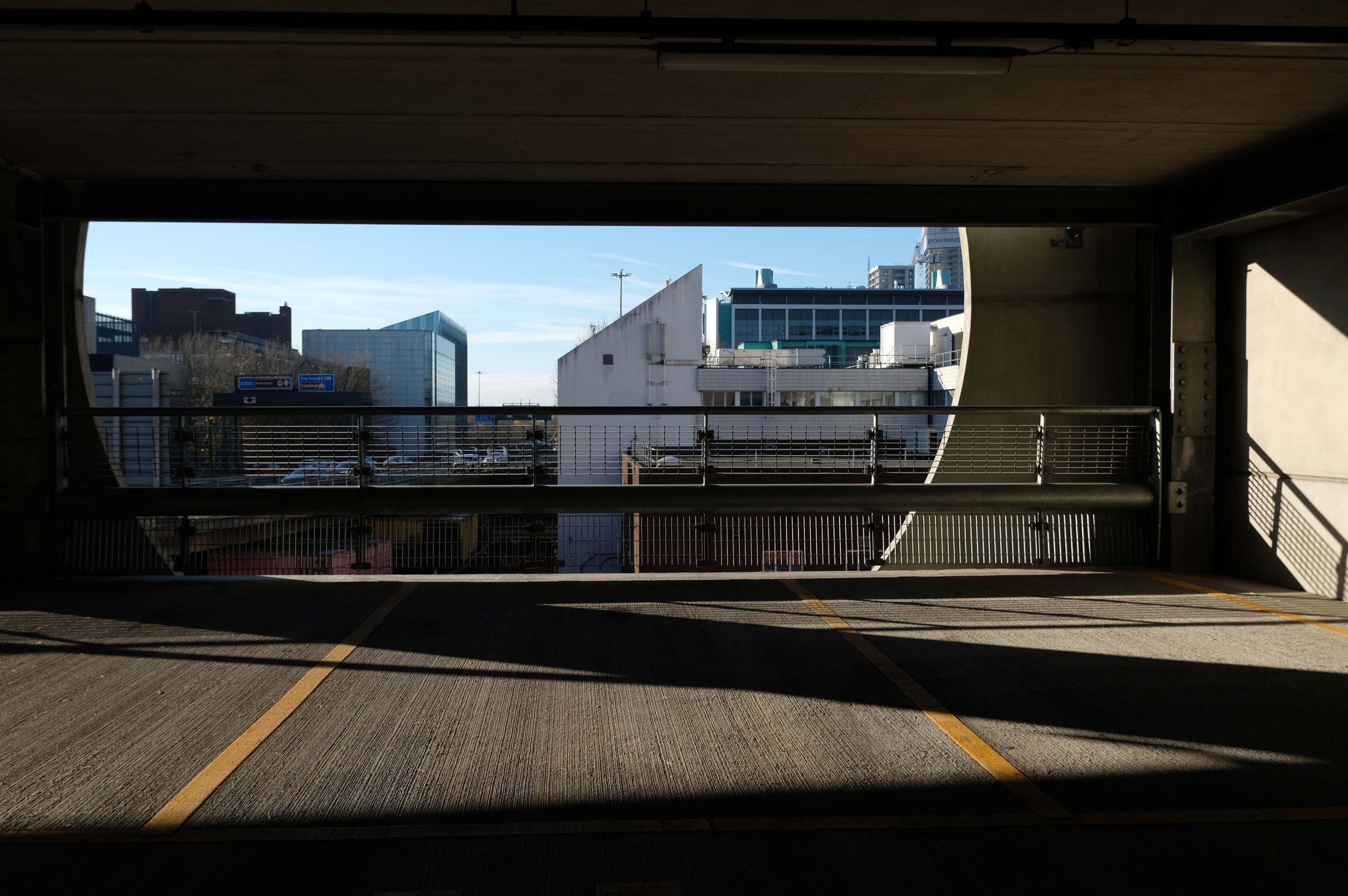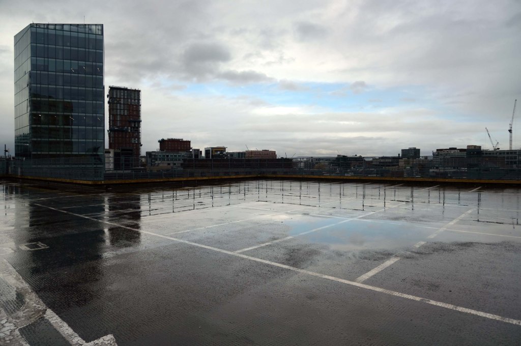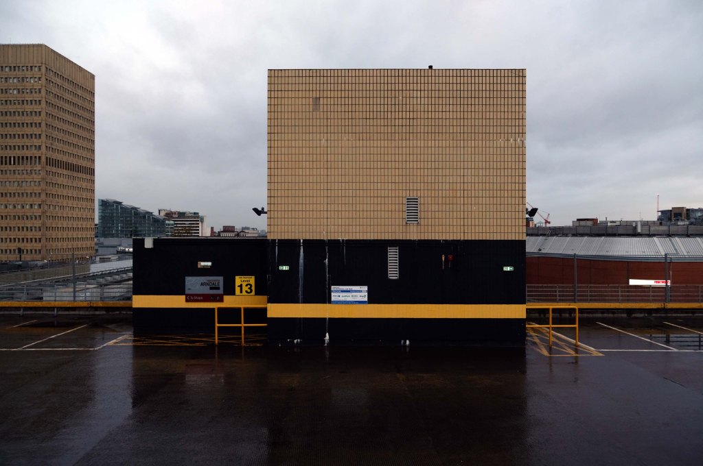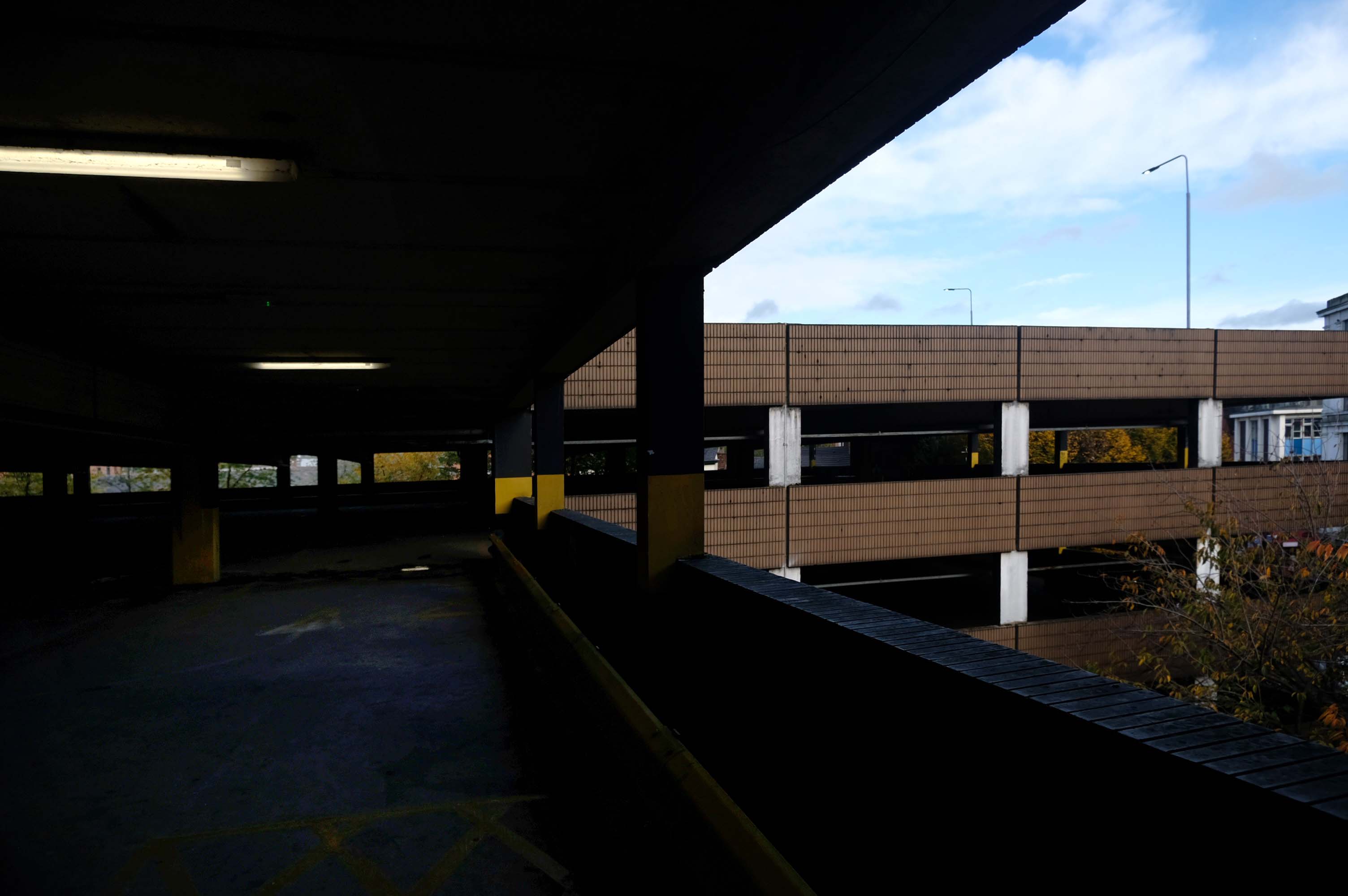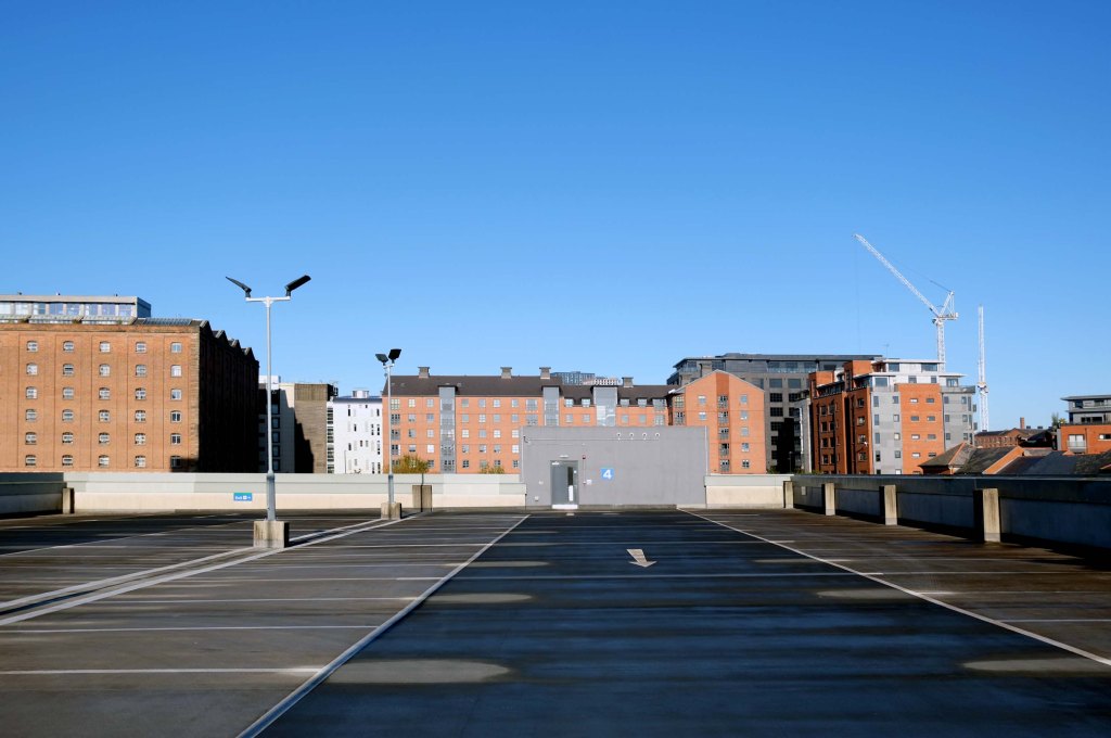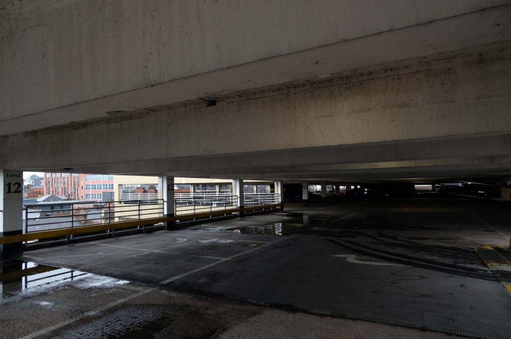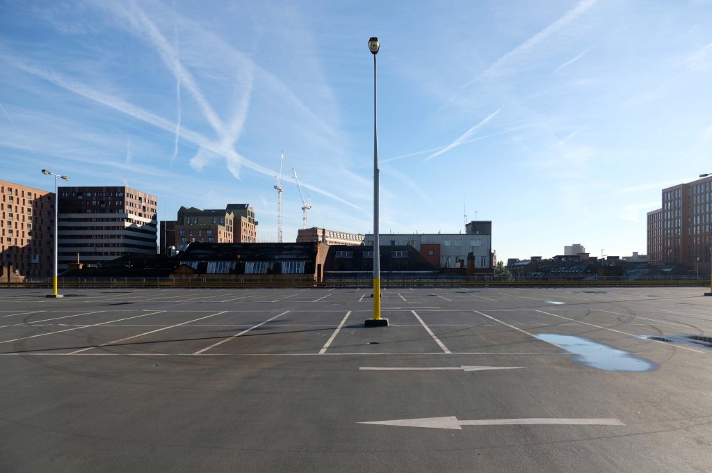 The pedestrian in a car park ventures forth into a part of town rarely visited, discovering a clean and modern environment, affording extensive views over an ever expanding city.