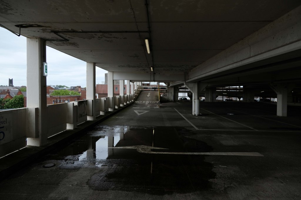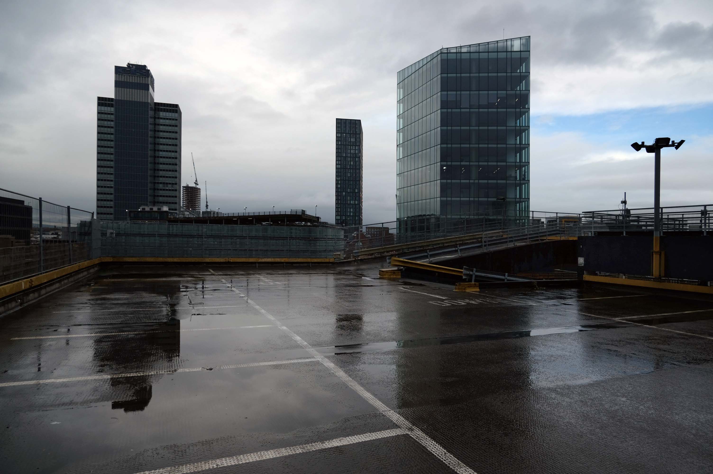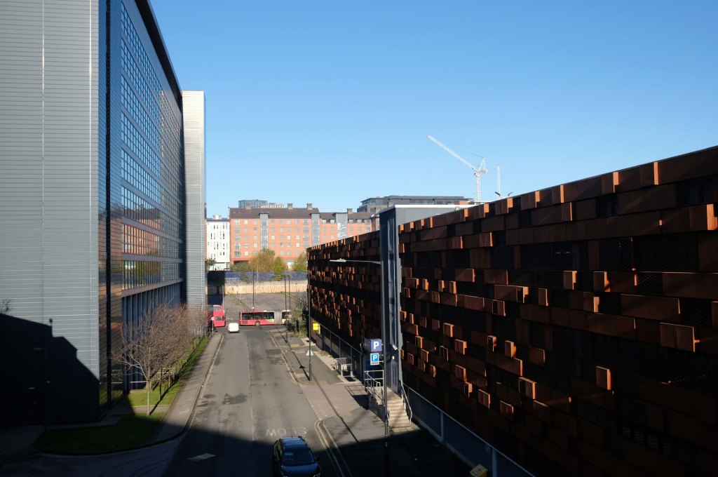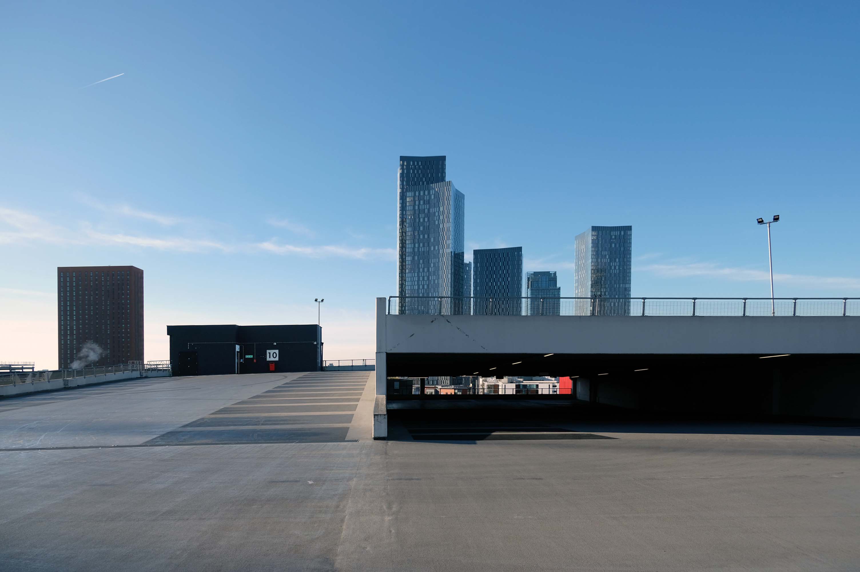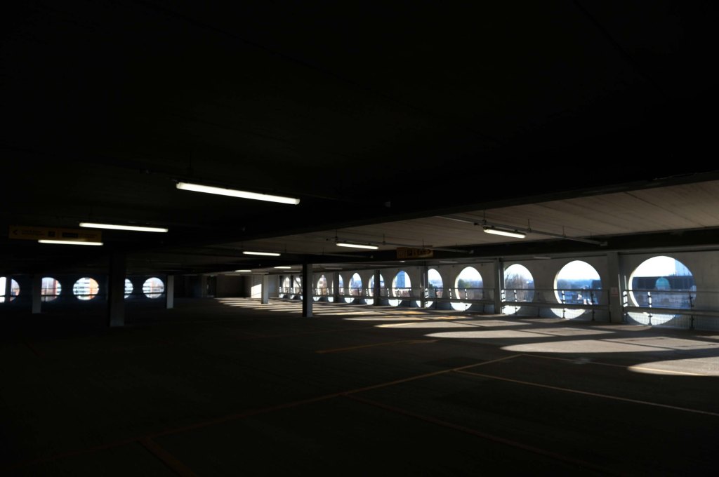 The pedestrian in a car park ventures forth into a part of town rarely visited, discovering a clean and modern environment, affording extensive views over an ever expanding city.