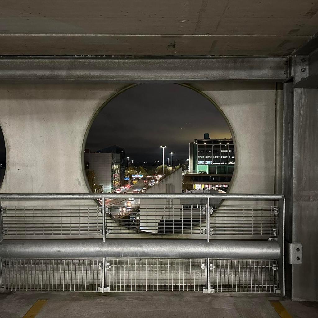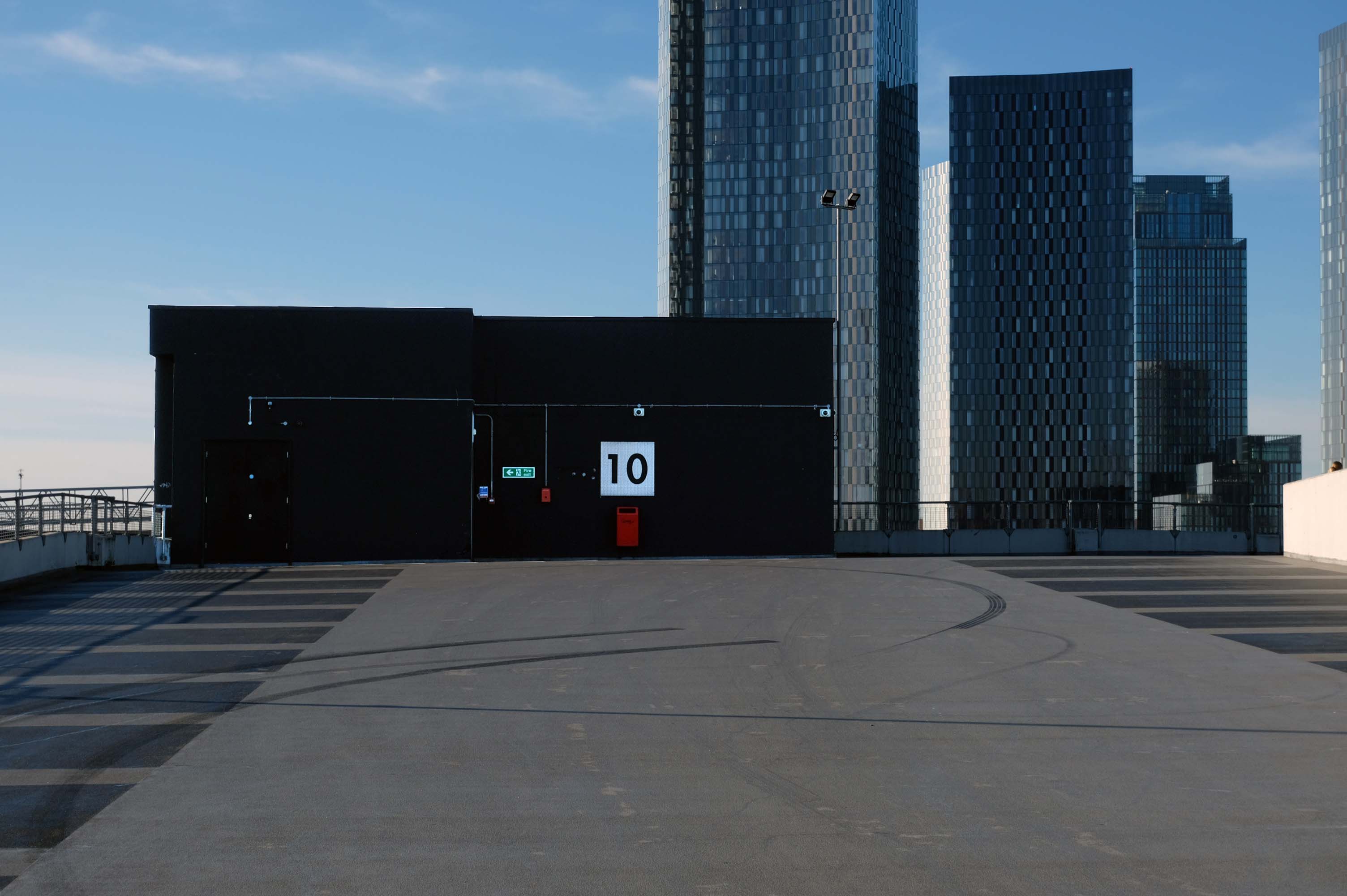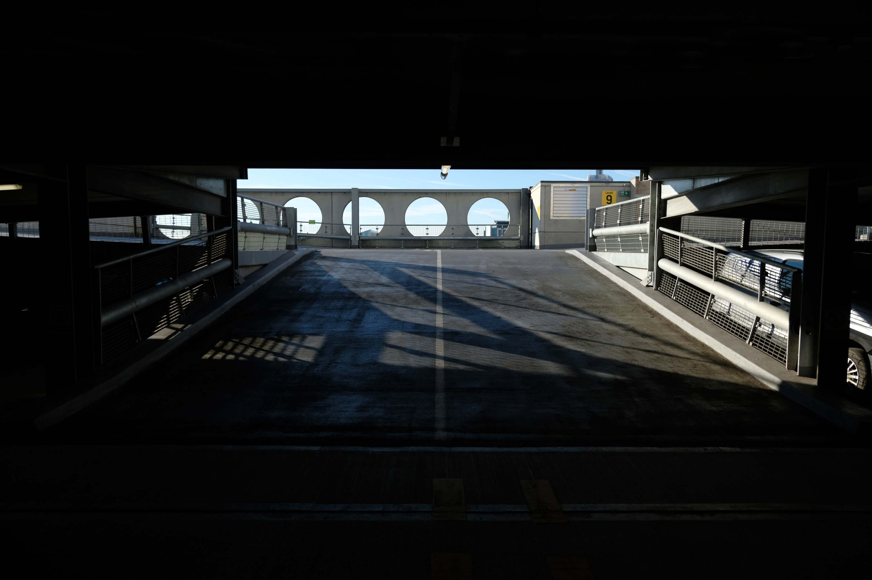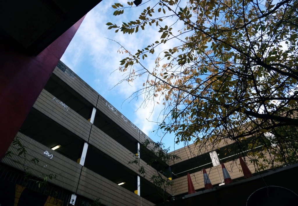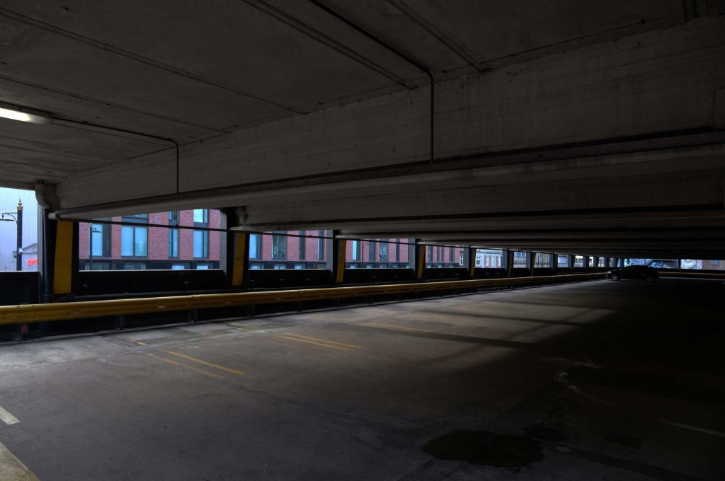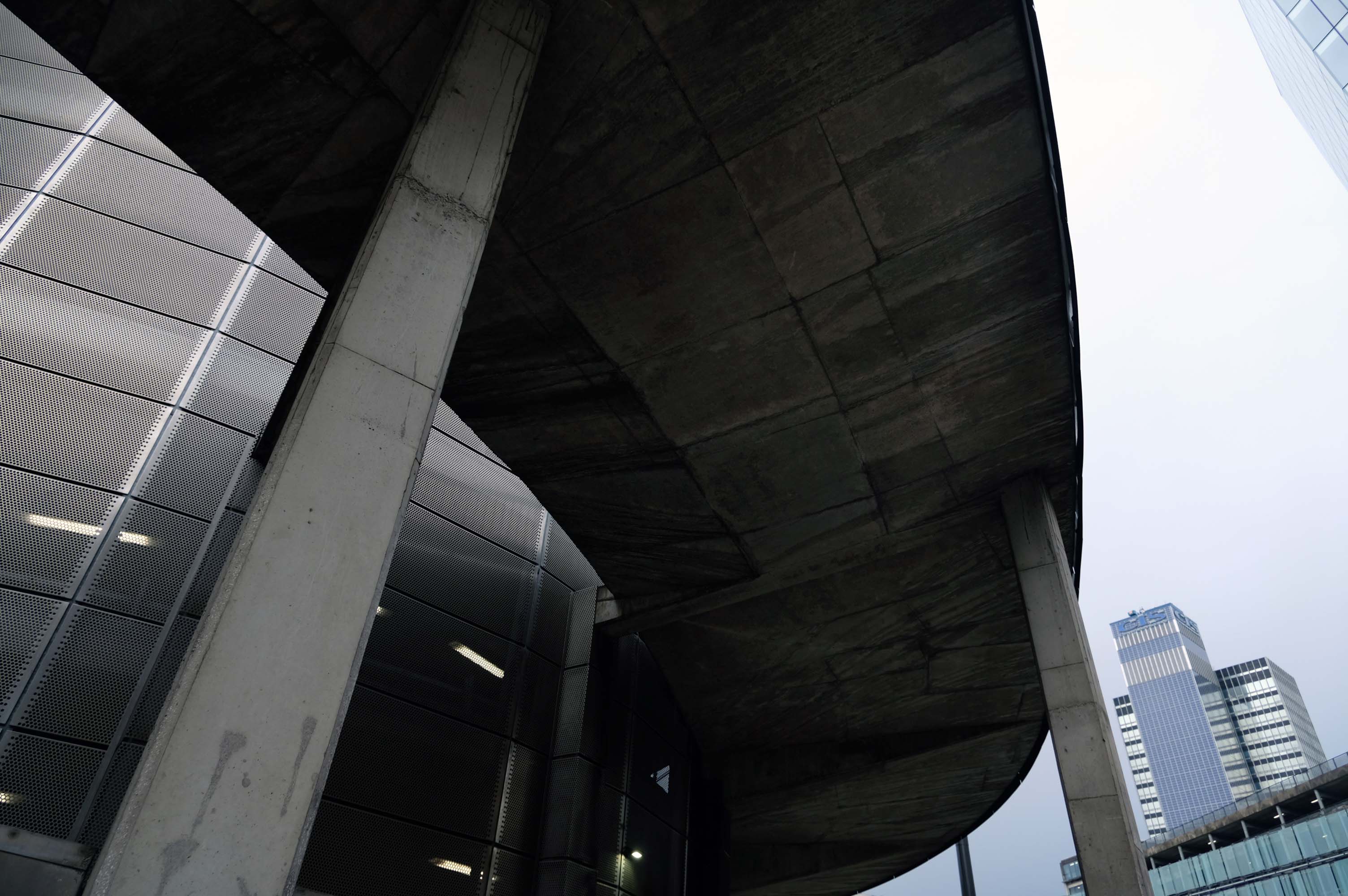The pedestrian in a car park ventures forth into a part of town rarely visited, discovering a clean and modern environment, affording extensive views over an ever expanding city.