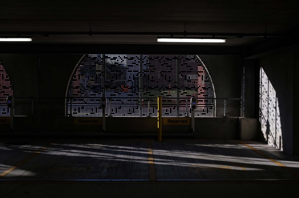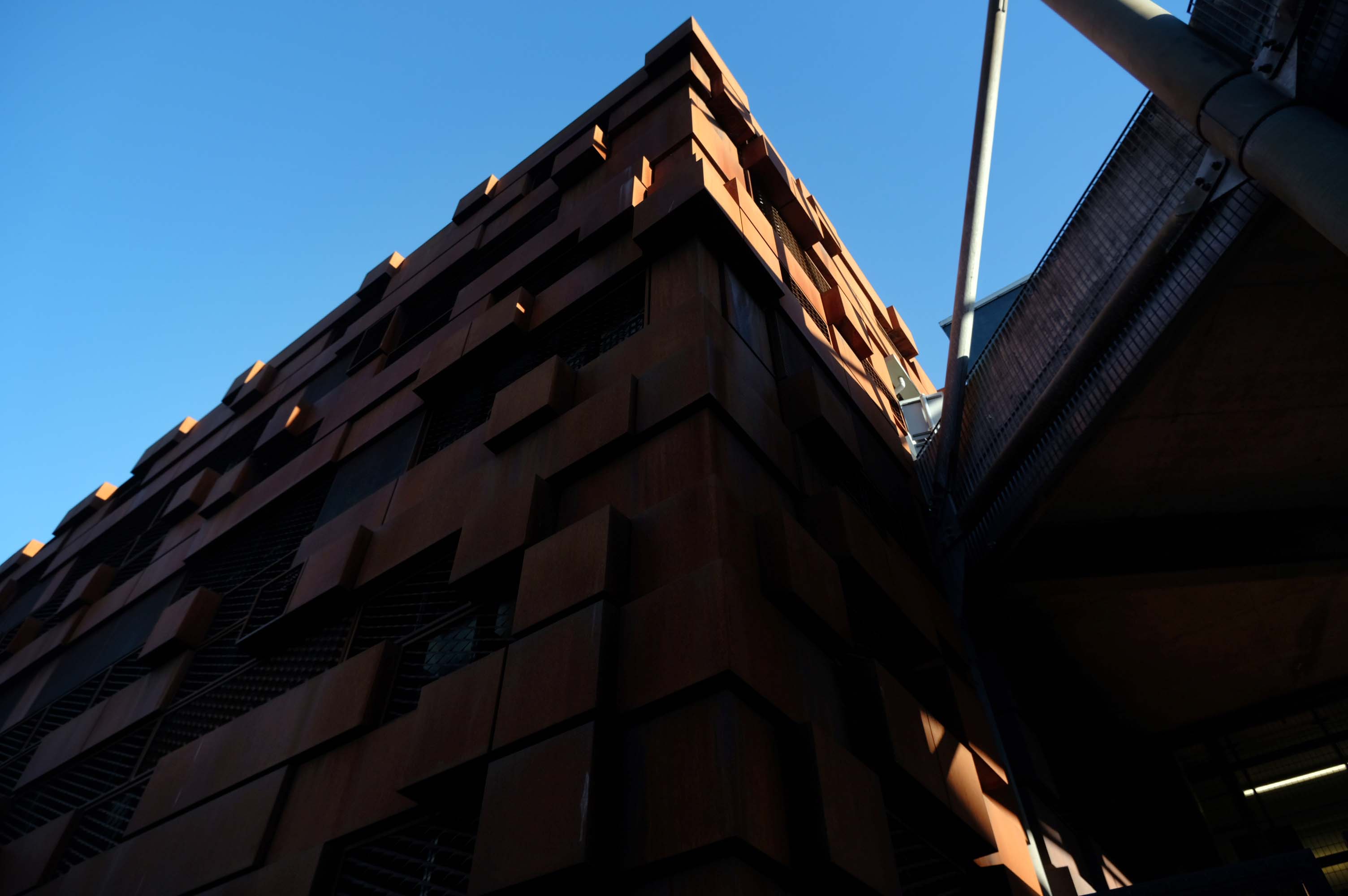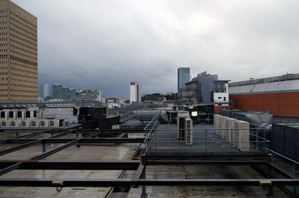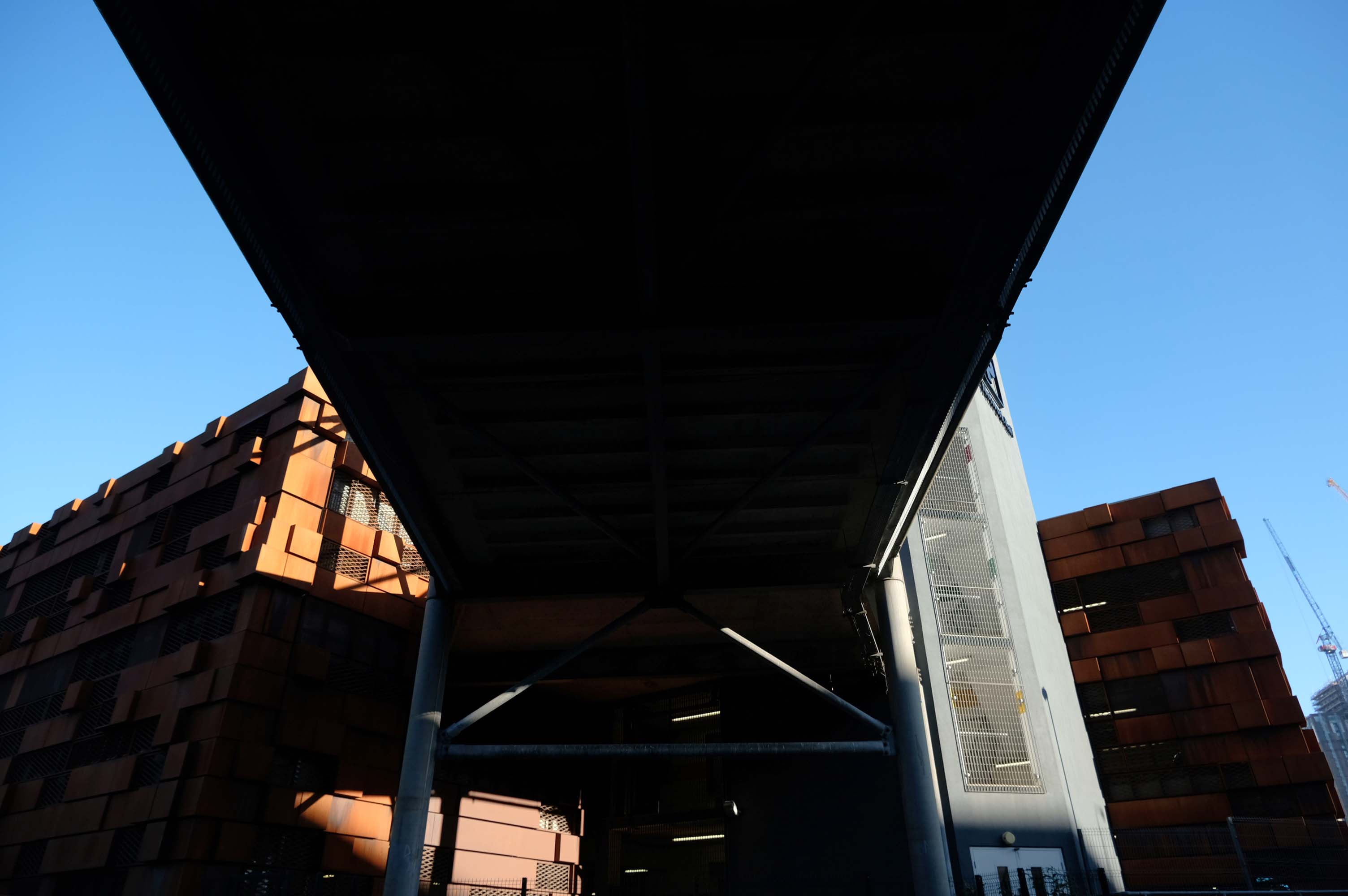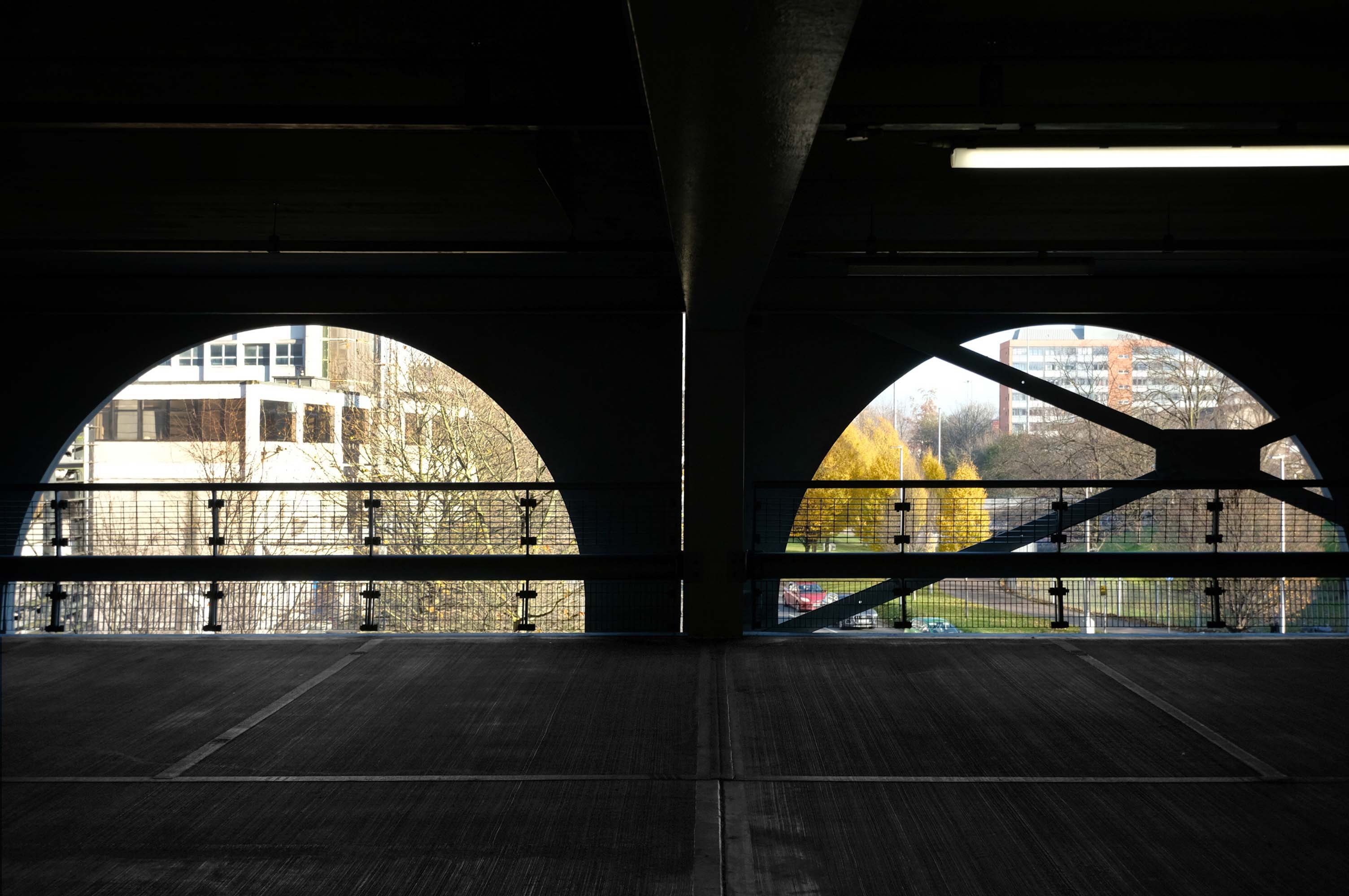 The pedestrian in a car park ventures forth into a part of town rarely visited, discovering a clean and modern environment, affording extensive views over an ever expanding city.