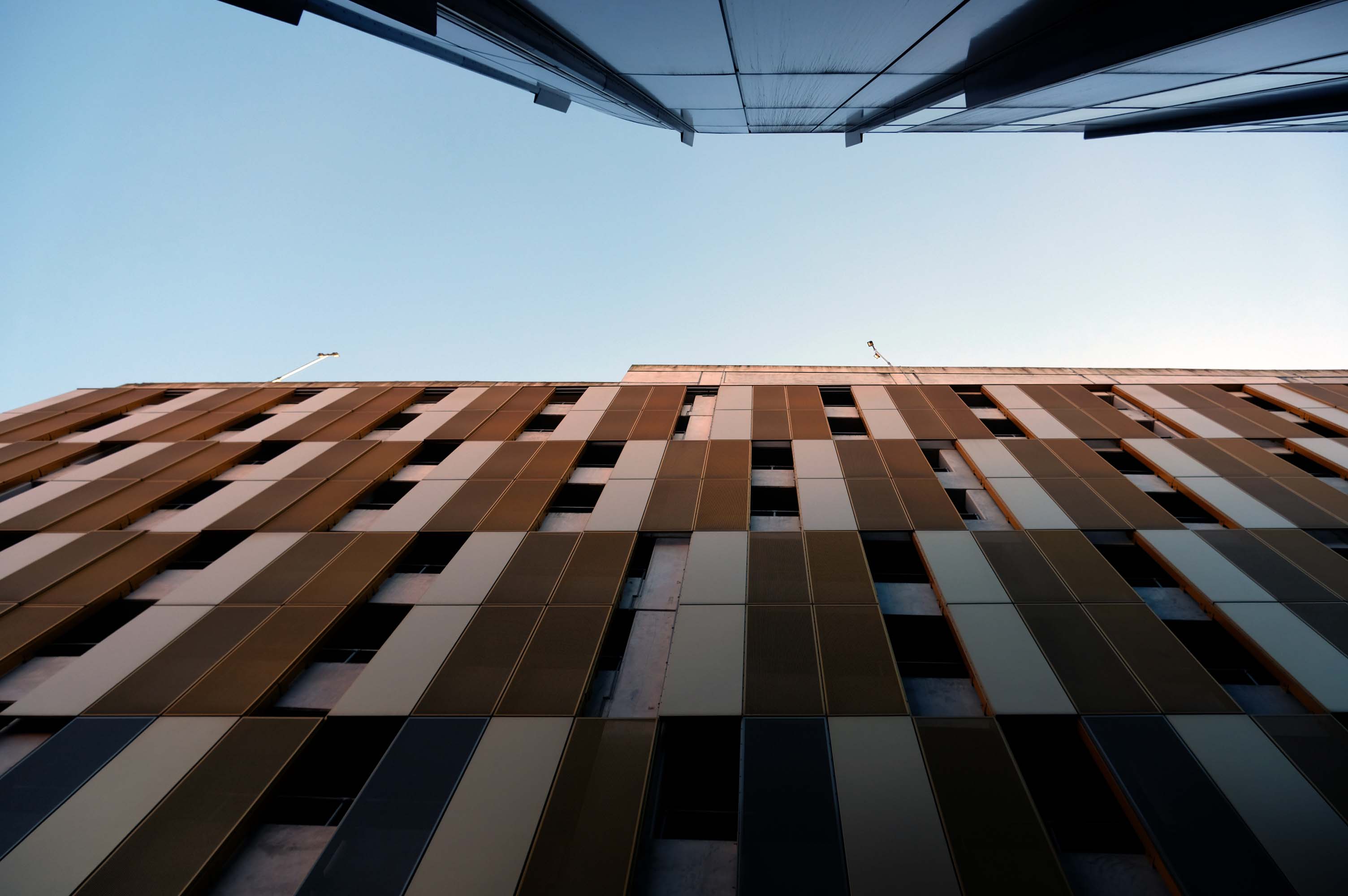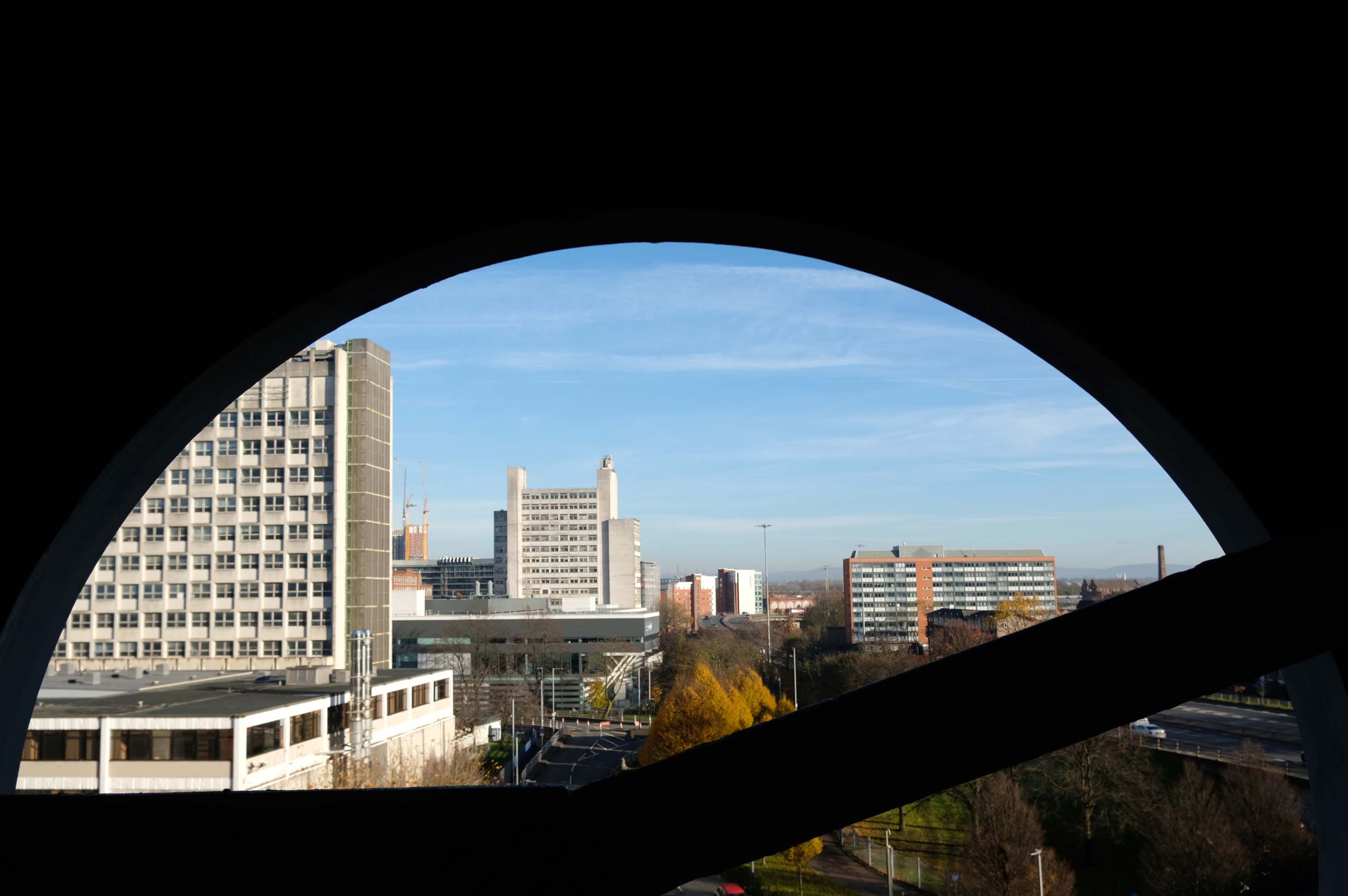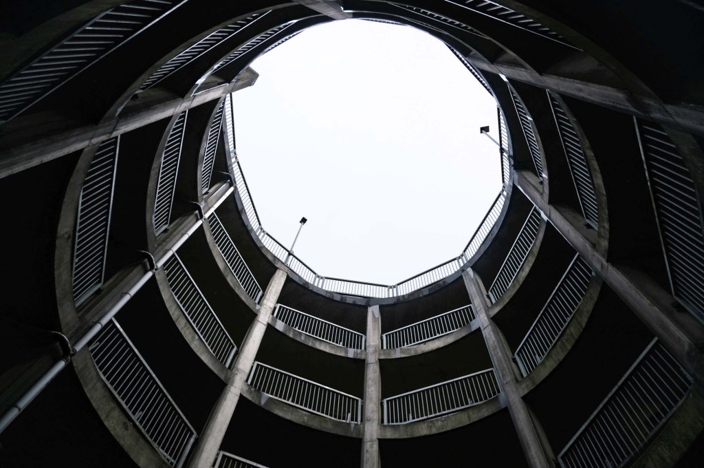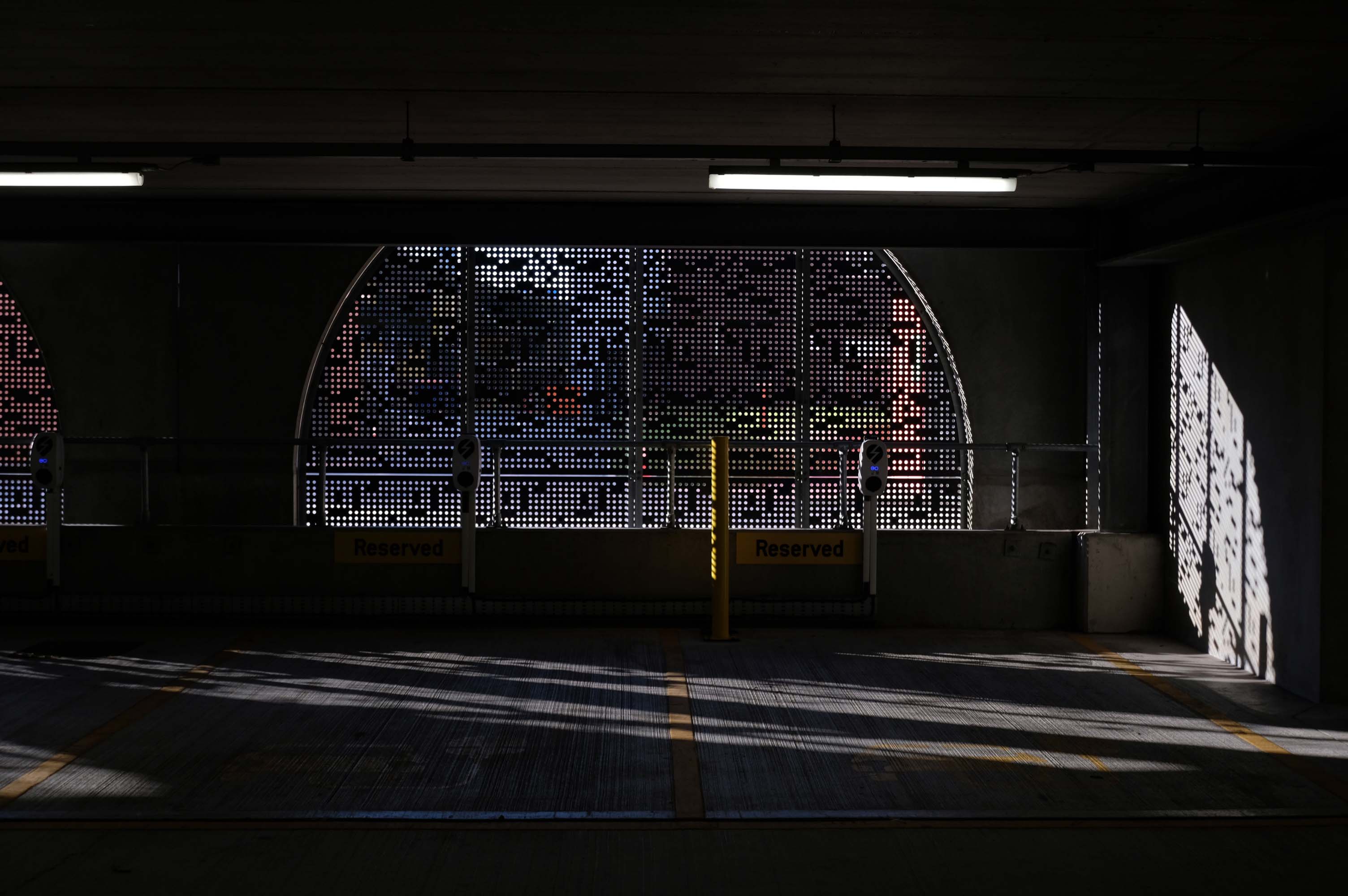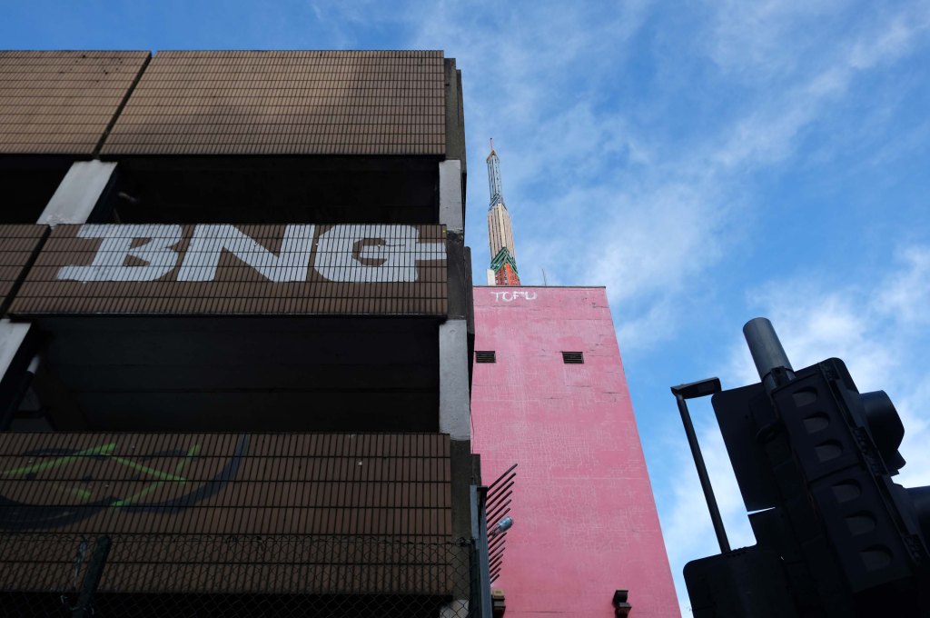 The pedestrian in a car park ventures forth into a part of town rarely visited, discovering a clean and modern environment, affording extensive views over an ever expanding city.