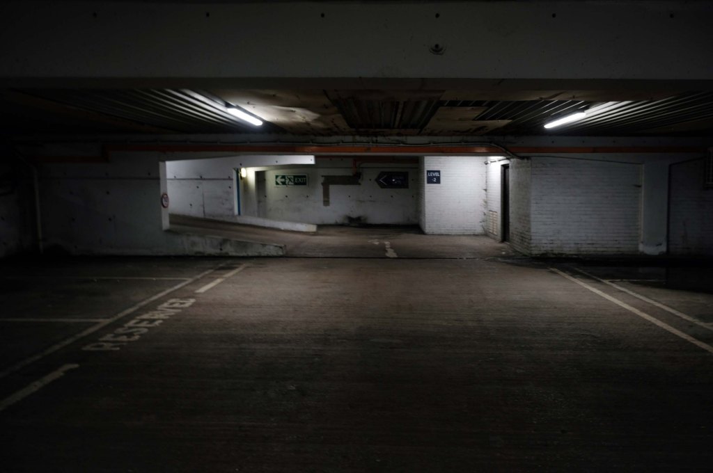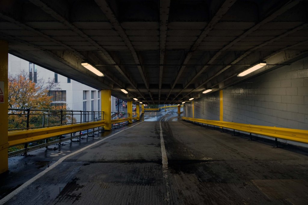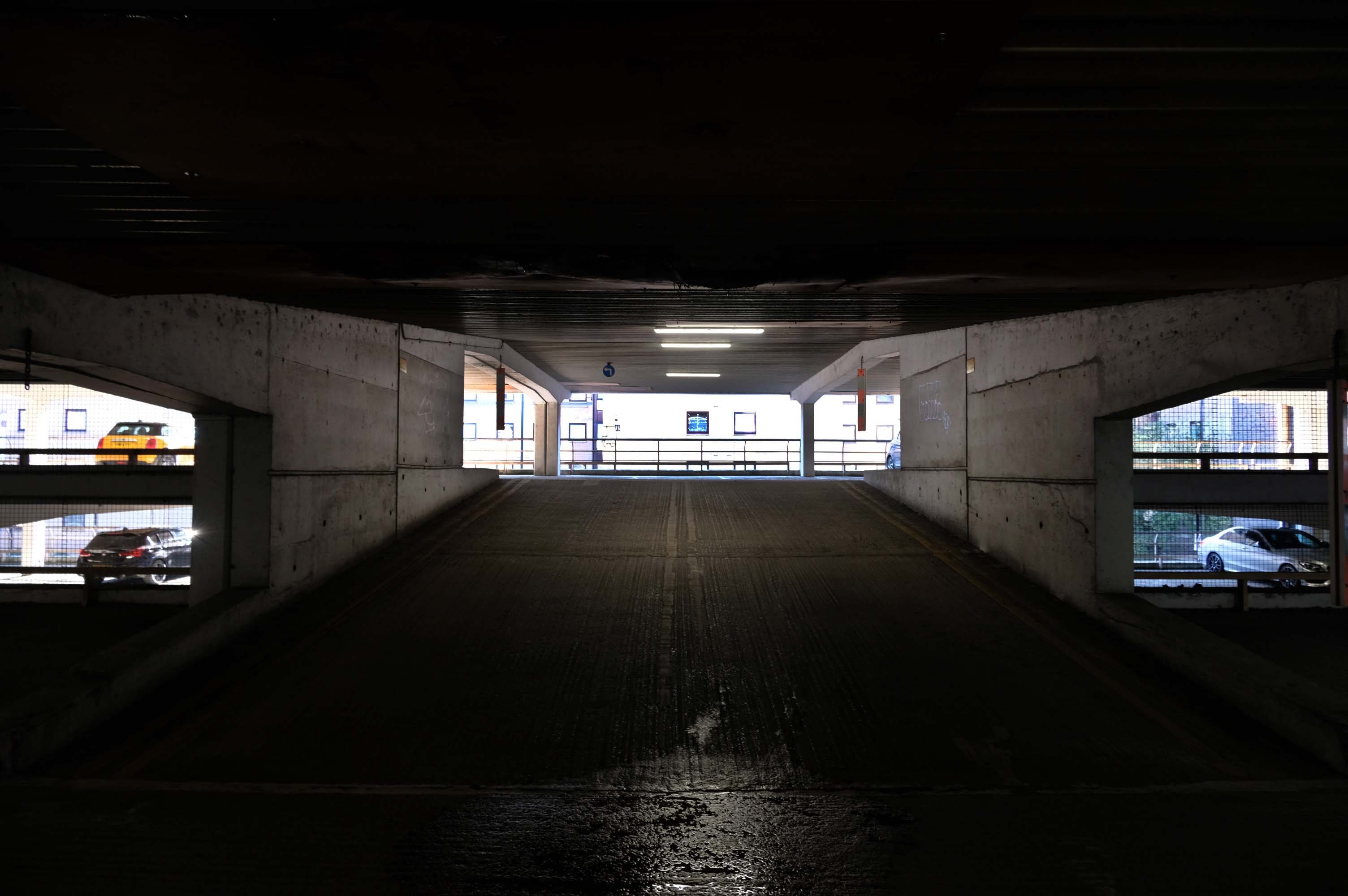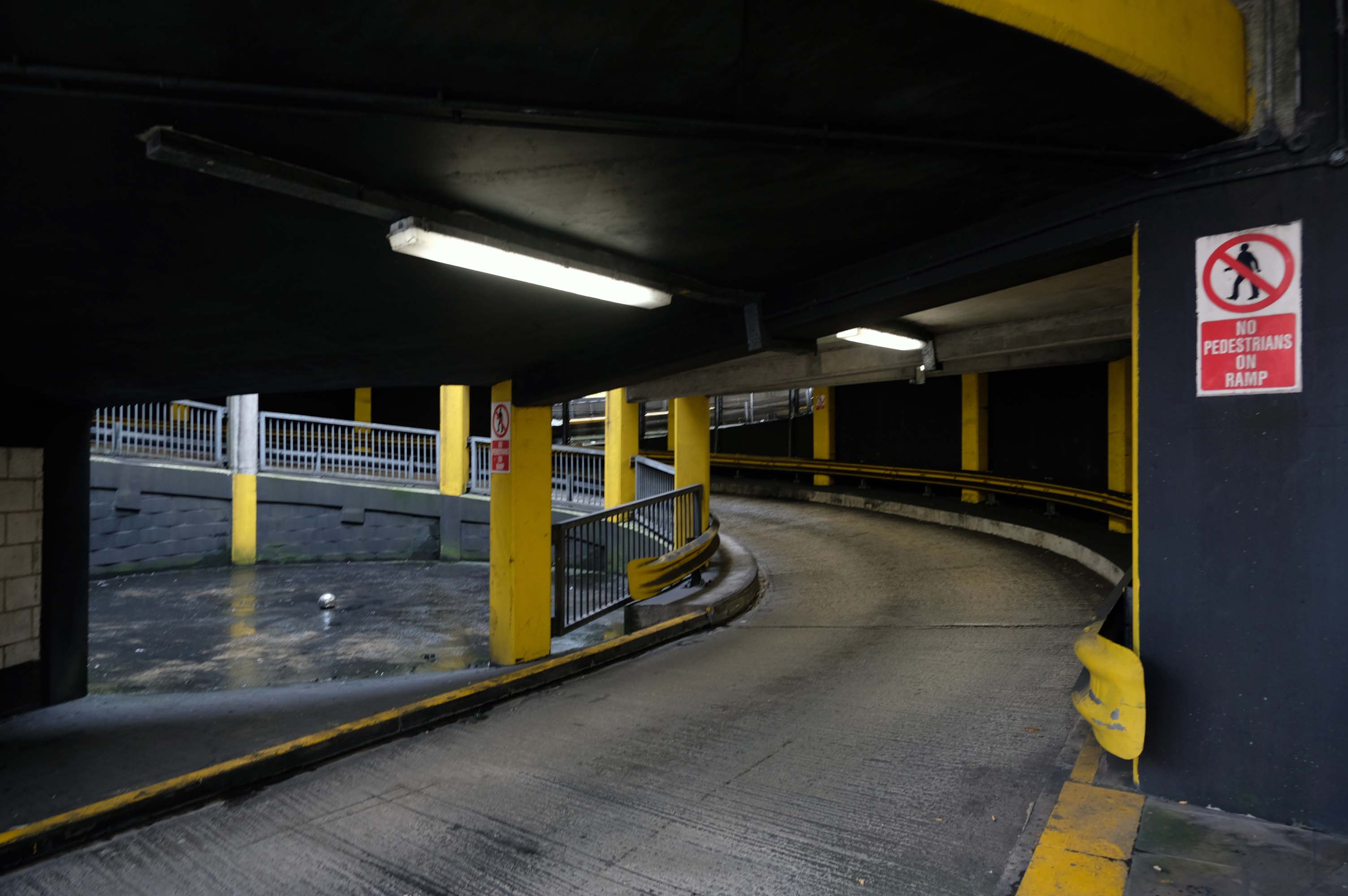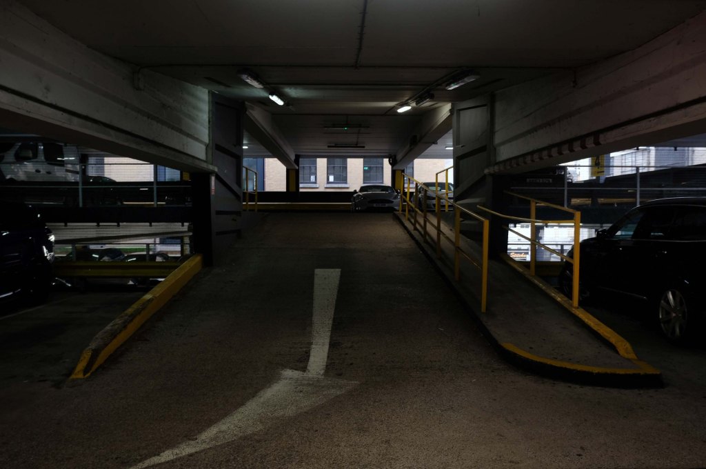The pedestrian in a car park approaches cautiously – along the ramp.