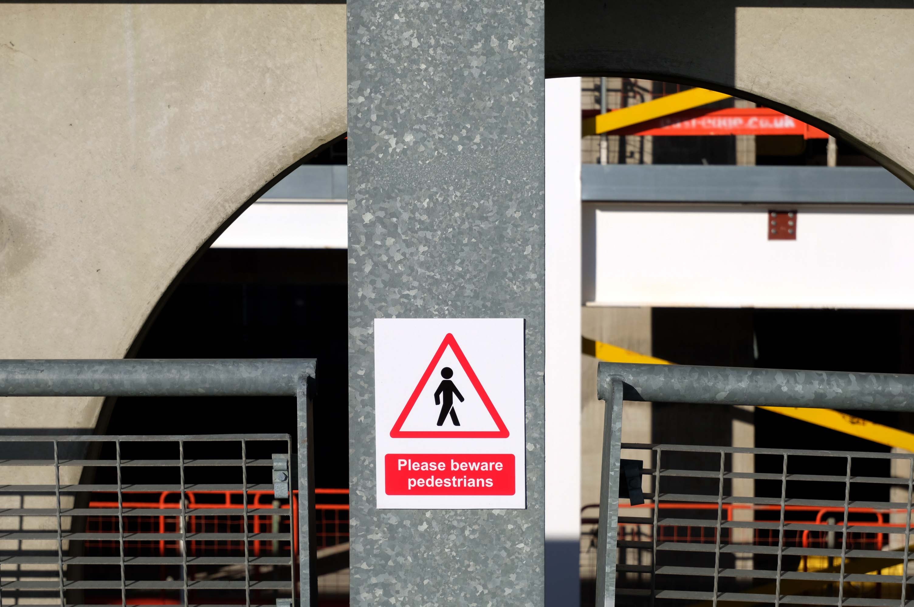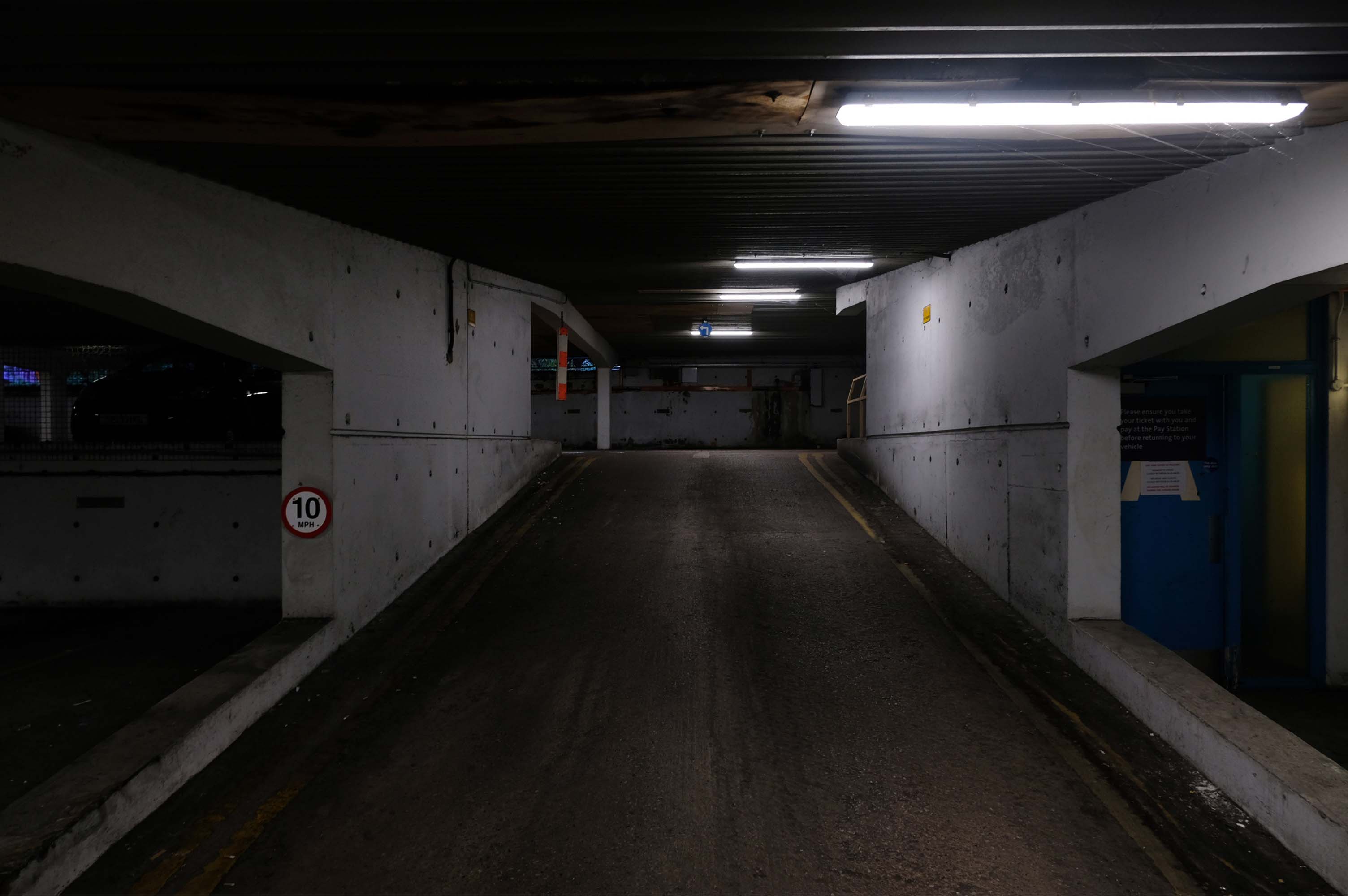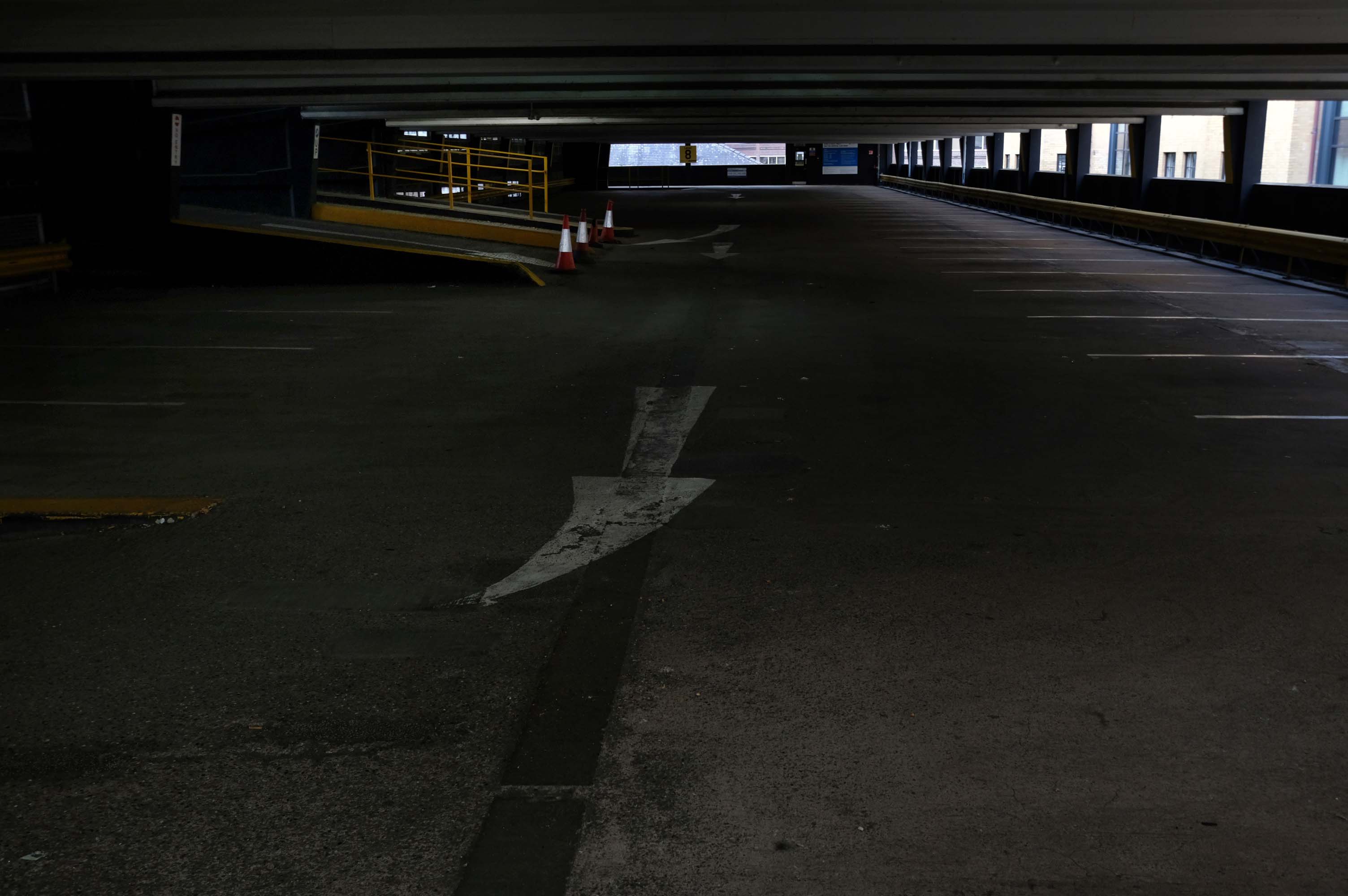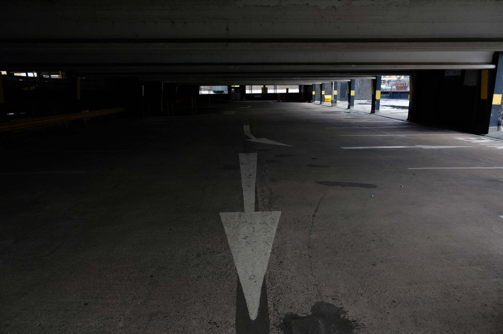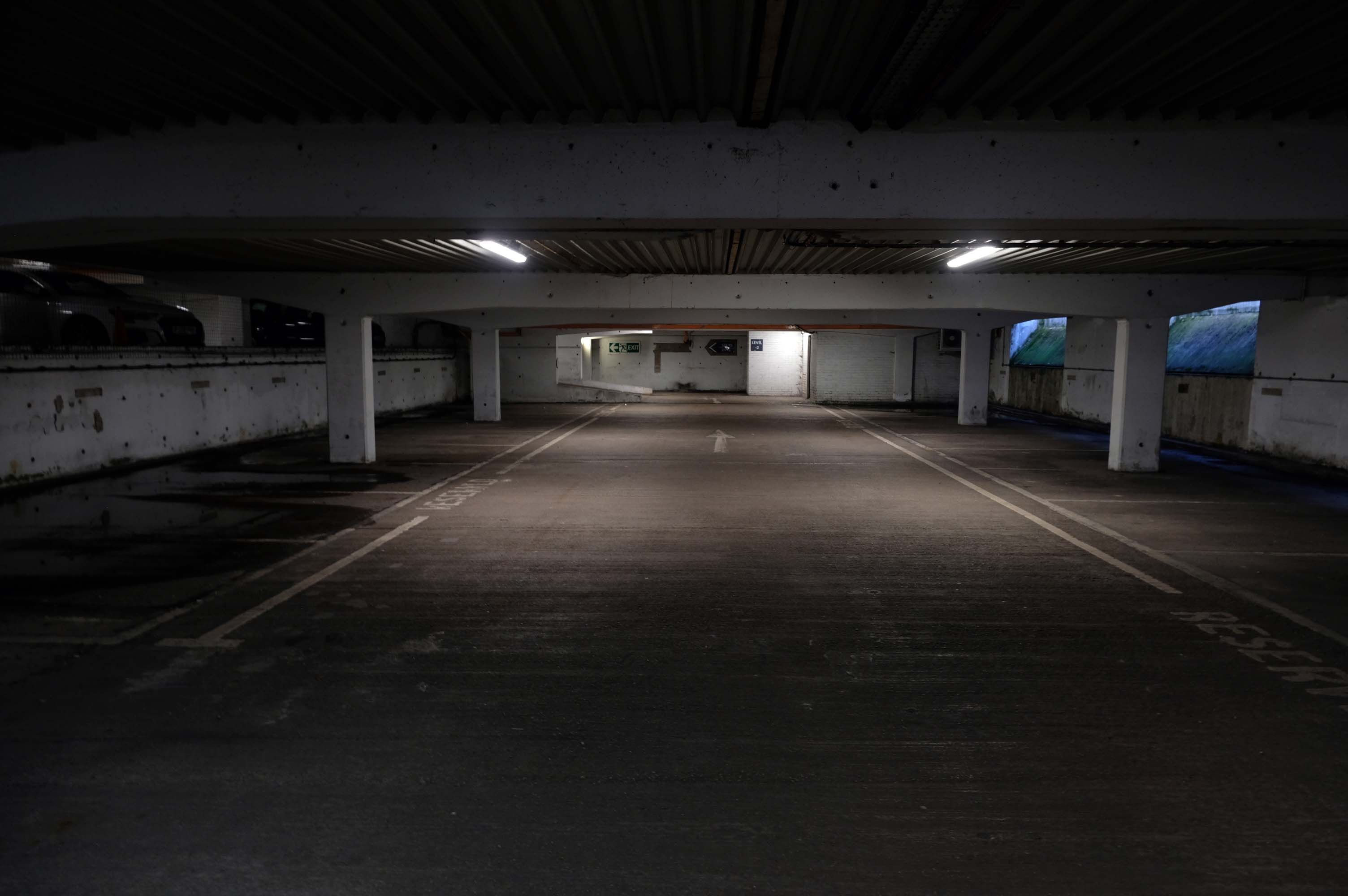 The pedestrian in a car park approaches cautiously – along the ramp.