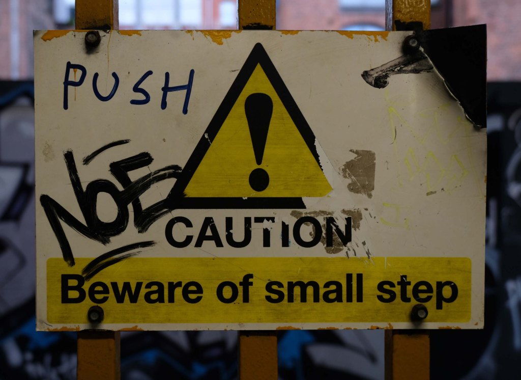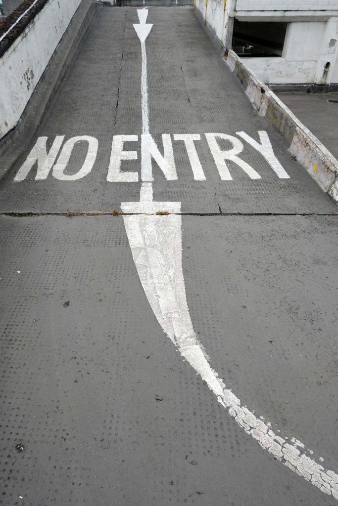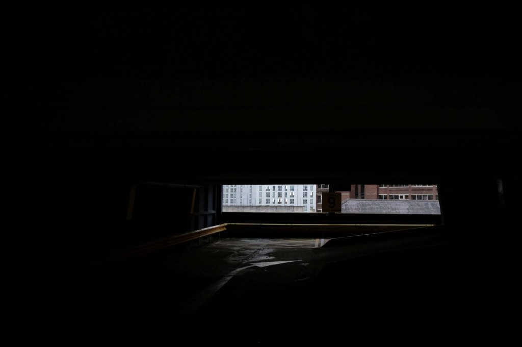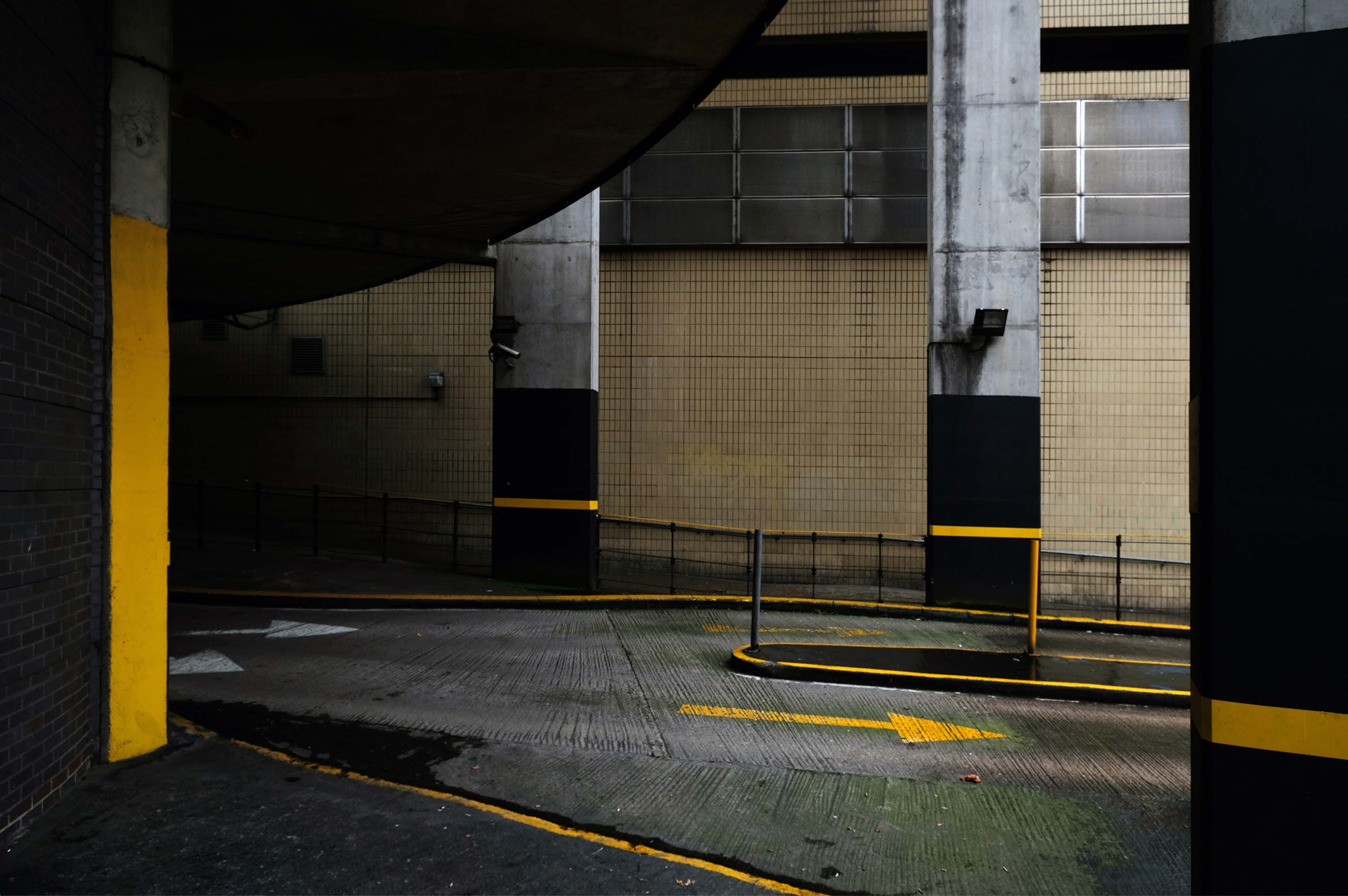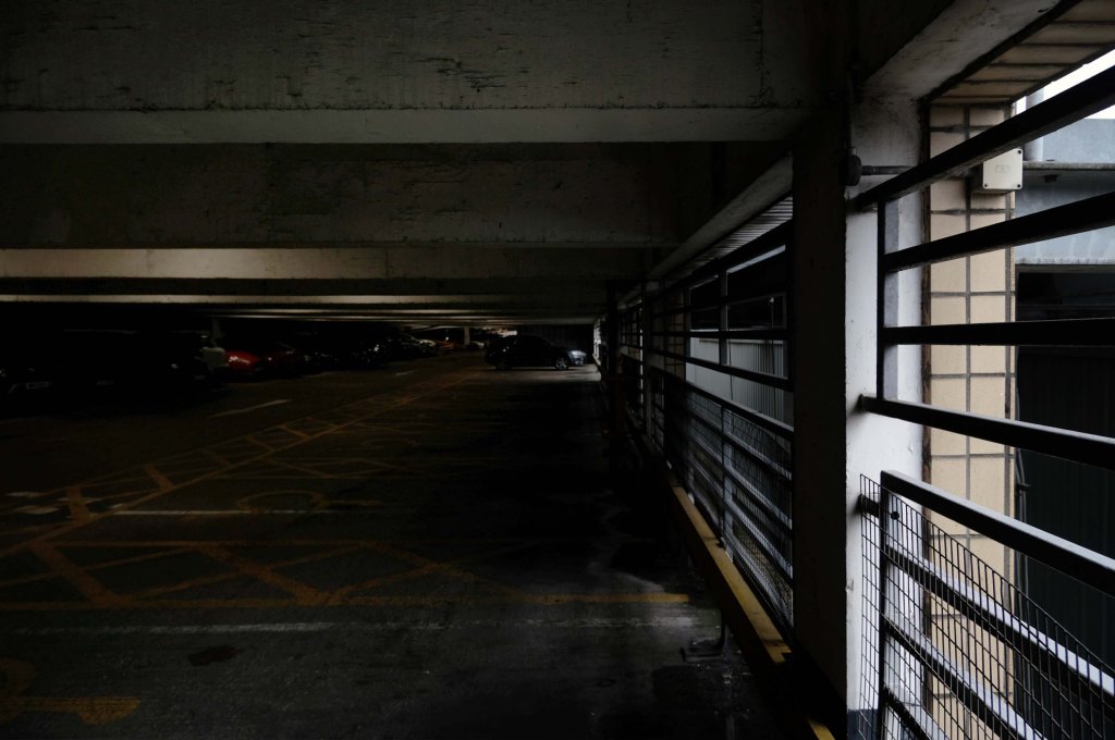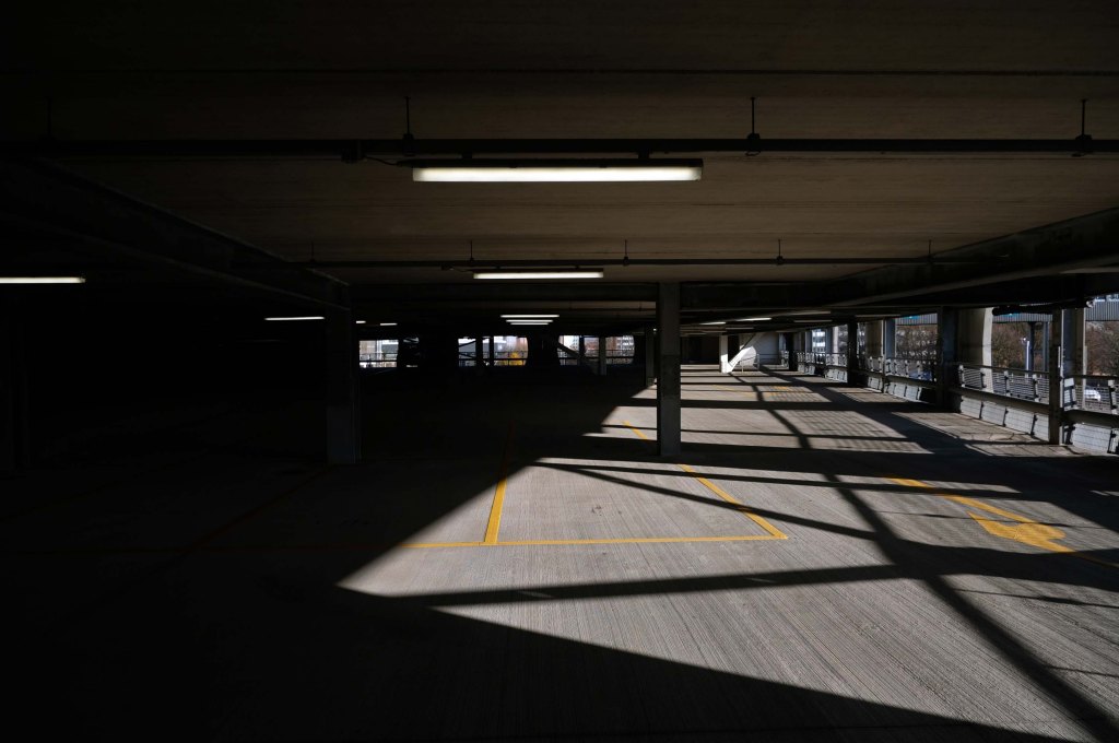 The pedestrian in a car park approaches cautiously – along the ramp.