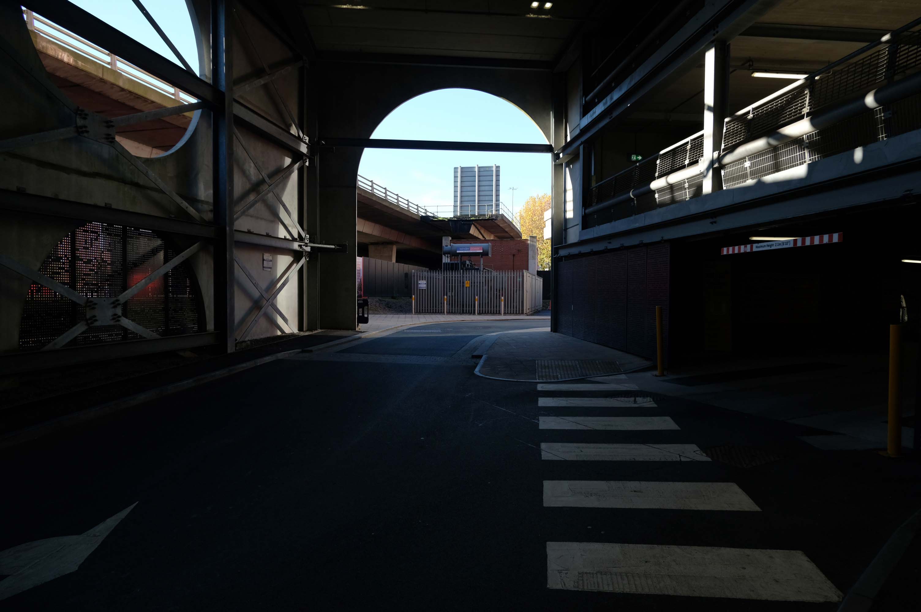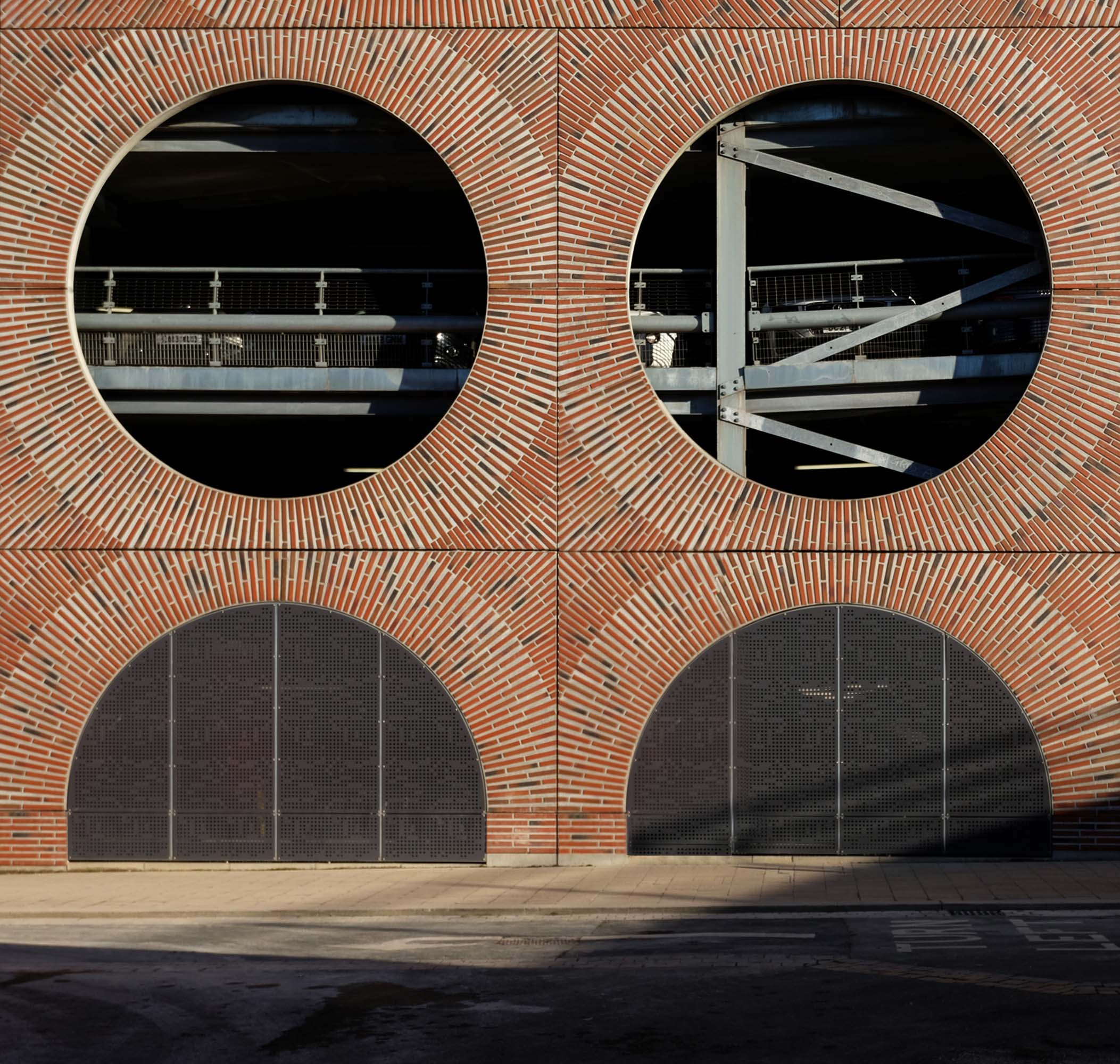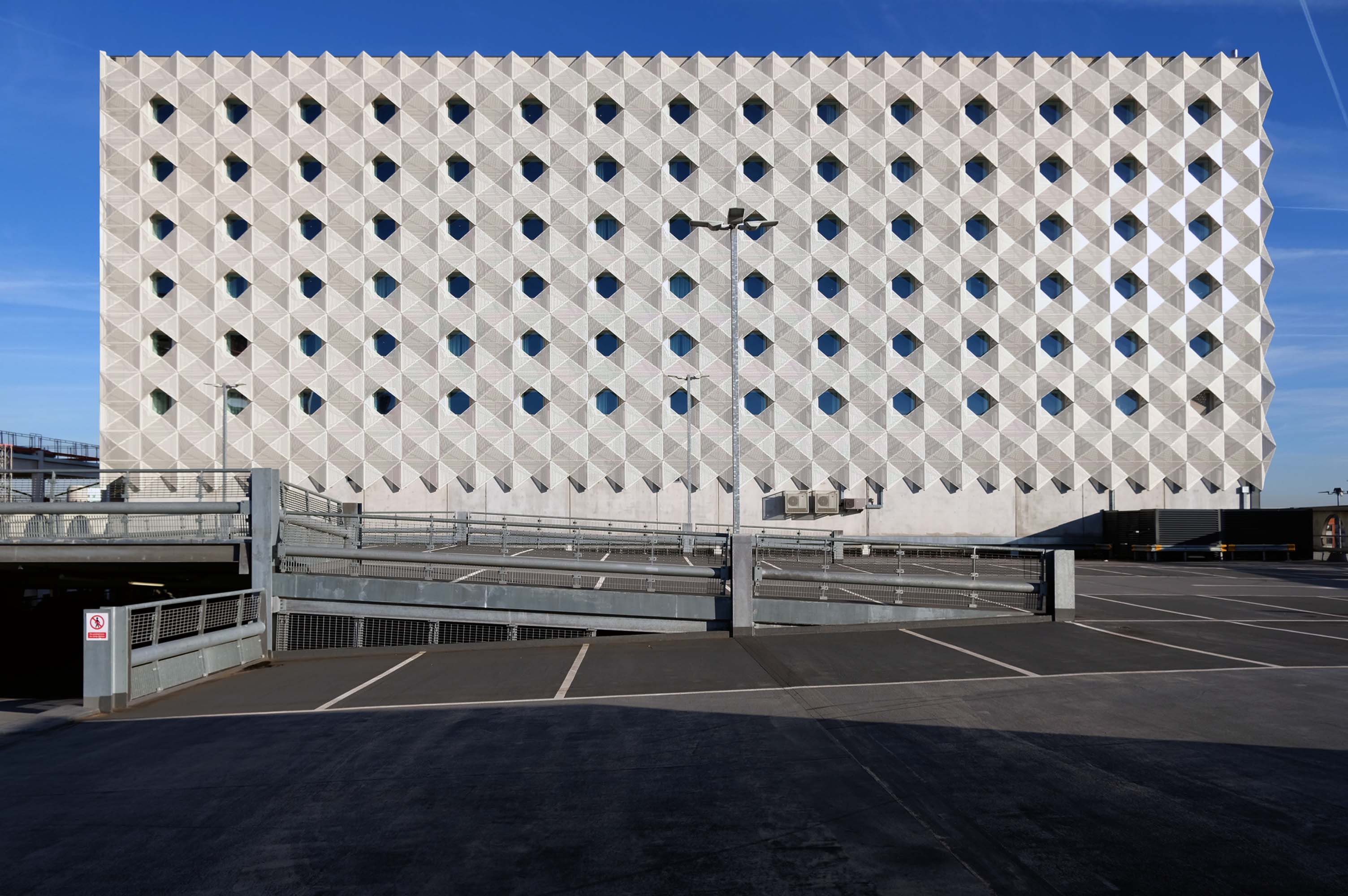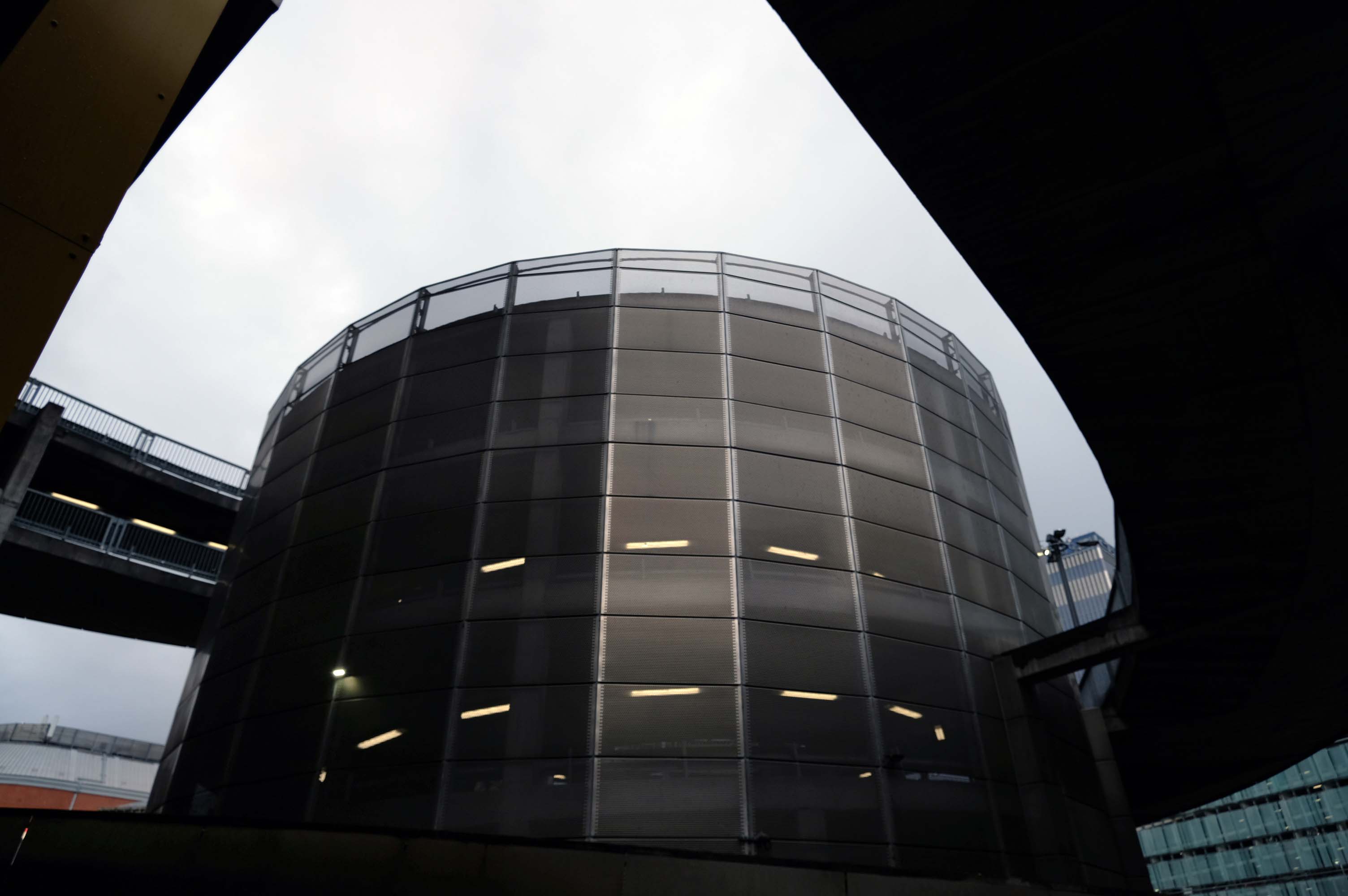 A series of four × two-storey-deep lattice girders and a single one-storey girder, all measuring up to 27m-long, span over the zone where the underground pipes are located. In these parts, the car park has no first-floor level as the local water board needed a 5m ground-to-ceiling clearance in case they had to undertake any maintenance works. Consequently, the first floor is only a partial level and is set within the depth of the larger lattice girders, as is the second floor, while the third level is supported on top of these members.