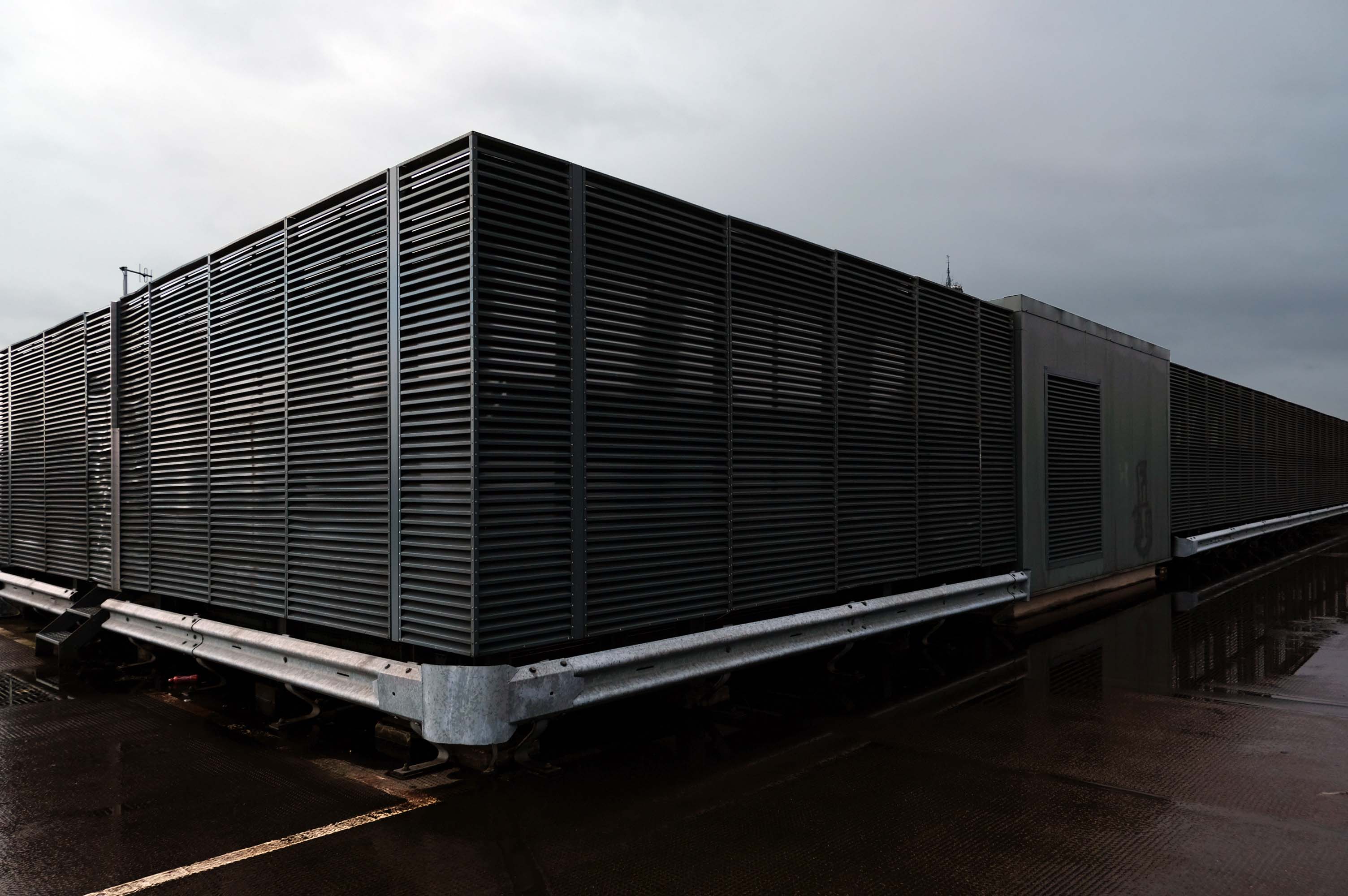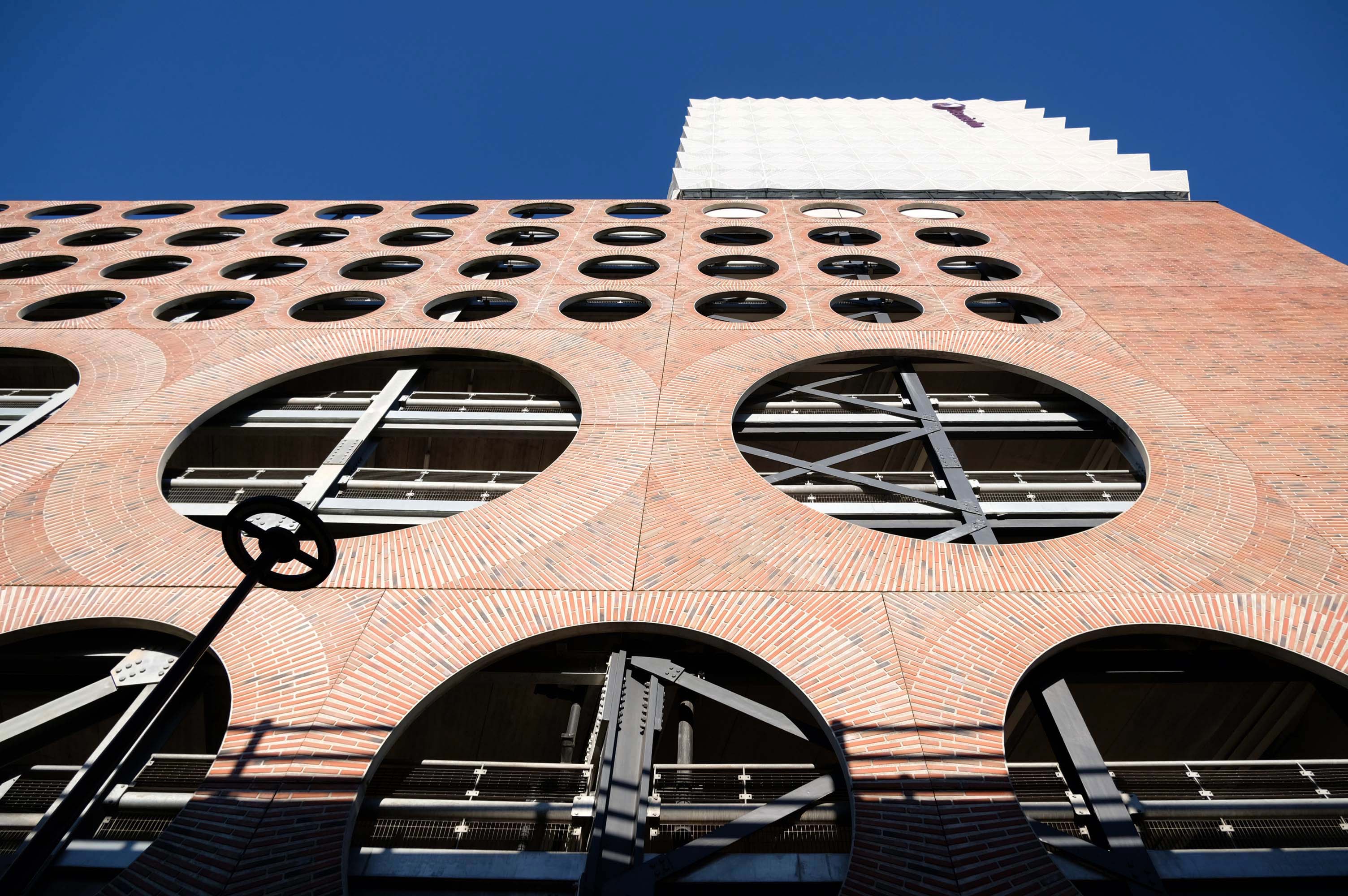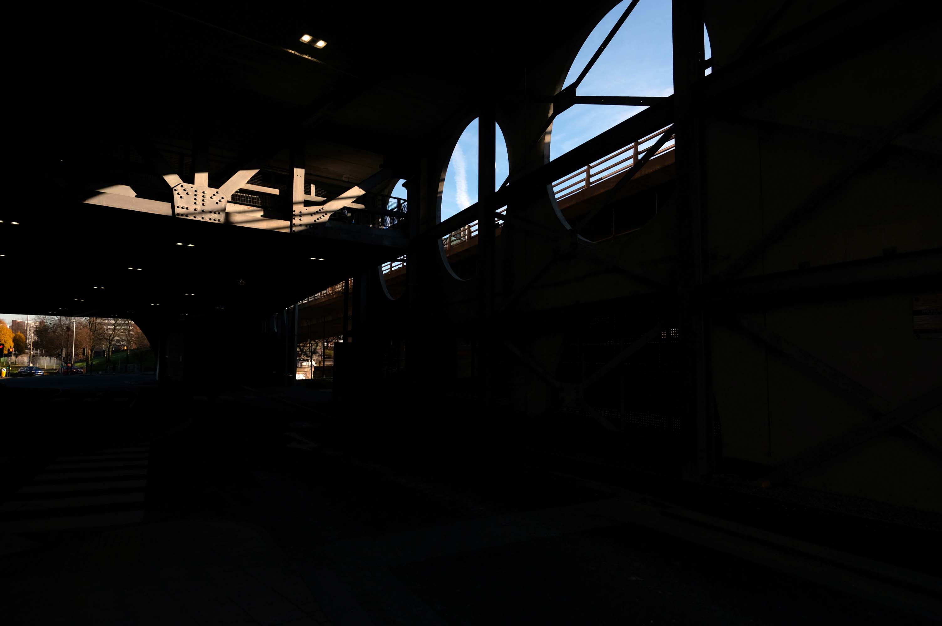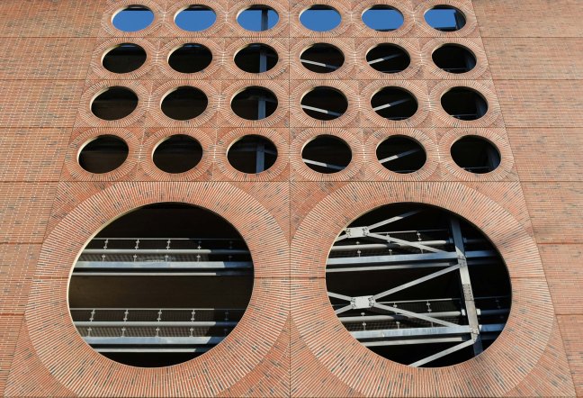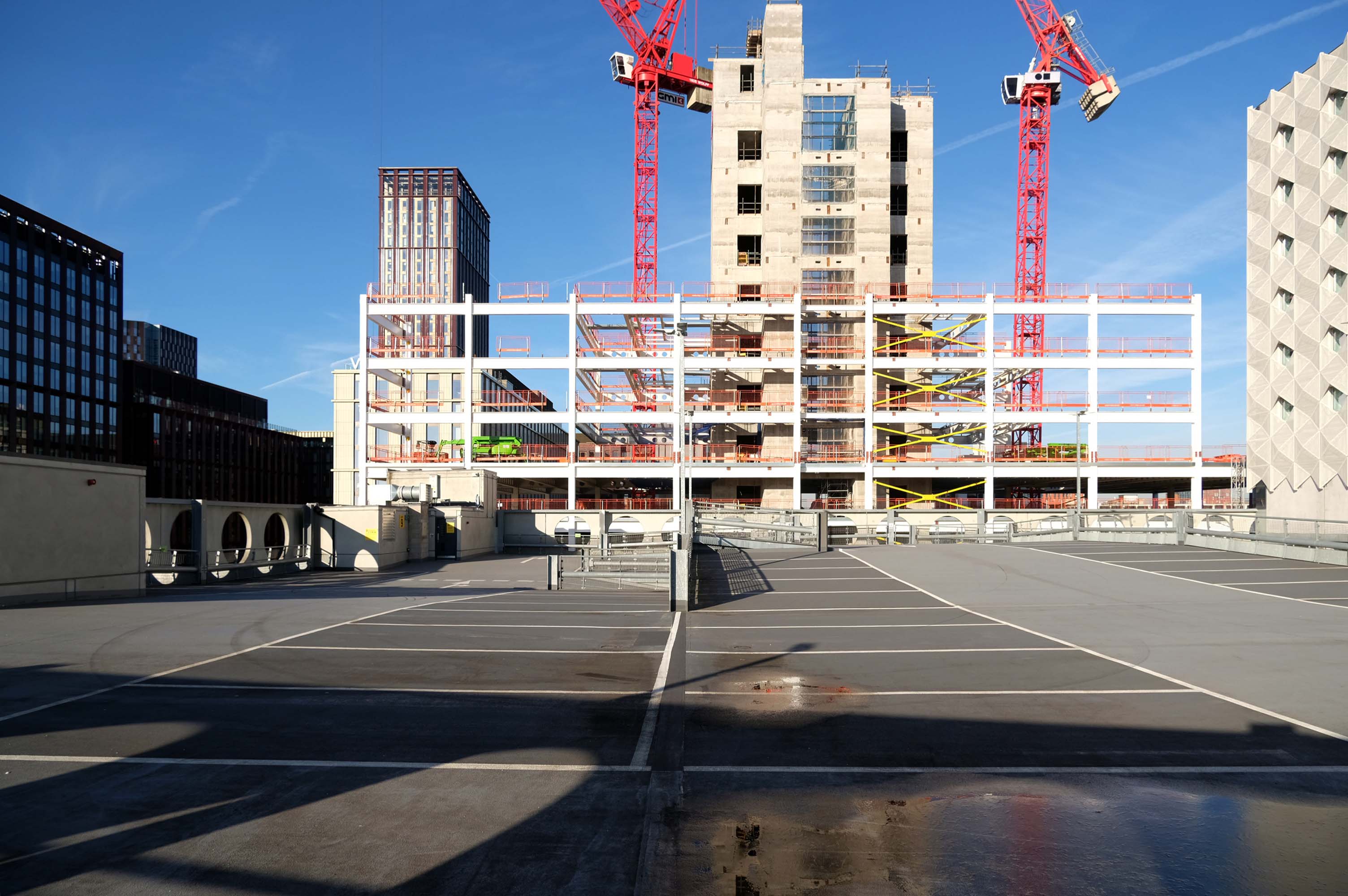 A series of four × two-storey-deep lattice girders and a single one-storey girder, all measuring up to 27m-long, span over the zone where the underground pipes are located. In these parts, the car park has no first-floor level as the local water board needed a 5m ground-to-ceiling clearance in case they had to undertake any maintenance works. Consequently, the first floor is only a partial level and is set within the depth of the larger lattice girders, as is the second floor, while the third level is supported on top of these members.