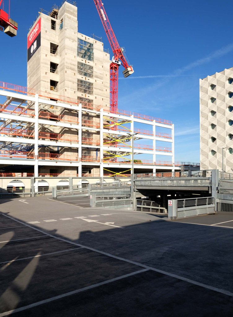 Supporting a hotel would be challenging enough, however the design has also had to incorporate large bridging elements as there are two subterranean 600mm-diameter water pipes crossing the site. “It’s a very unusual design and one that was originally designed as a concrete-framed structure,” says James Killelea Senior Structural Engineer Charlie Twist. “However, the bridging parts would have proven to be too difficult to build and consequently a steel-framed solution was chosen for the car park, which in turn supports a precast concrete hotel.”