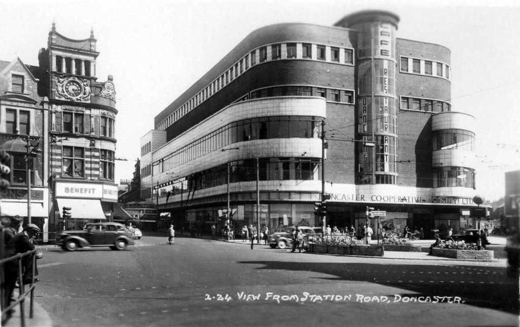 Turn another corner and it’s all at the Co-op now – the Grade II listed Danum Co-operativeBuilding, department store and offices: 1938-40 designed by T H Johnson & Son for the Doncaster Co-operative Society Ltd.