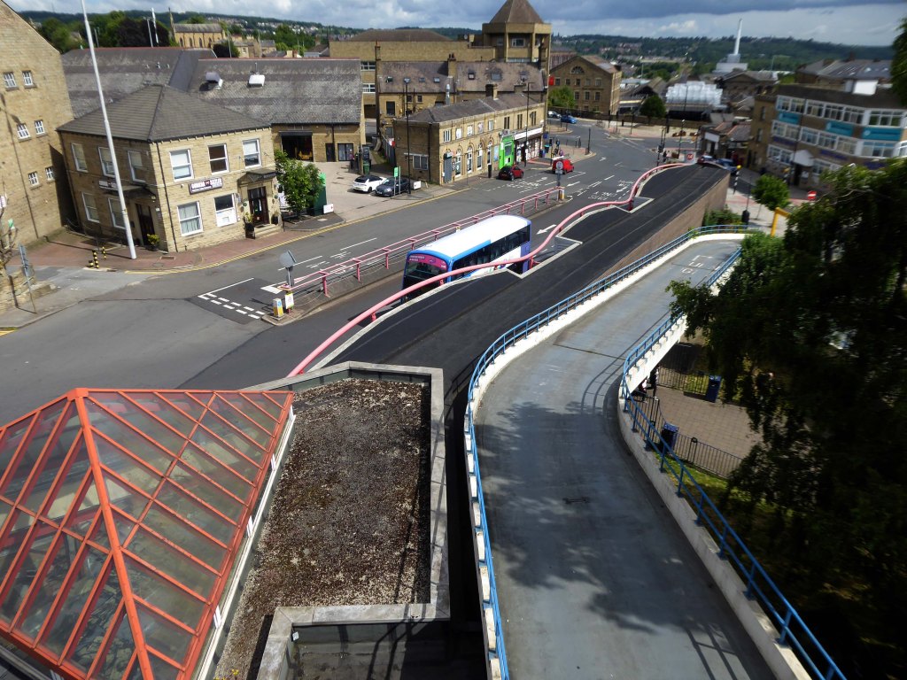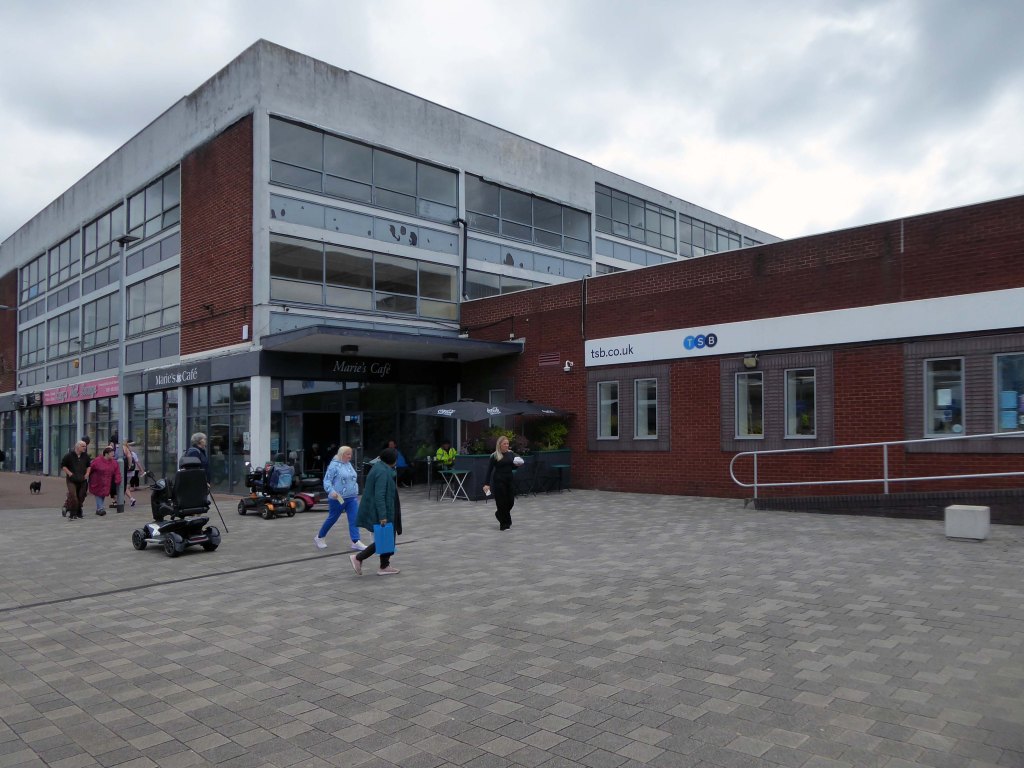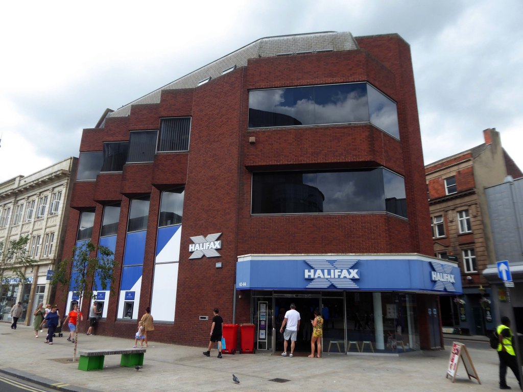 Over the road a zig-zag Halifax Building Society branch, tightly contorted by its corner footprint.
